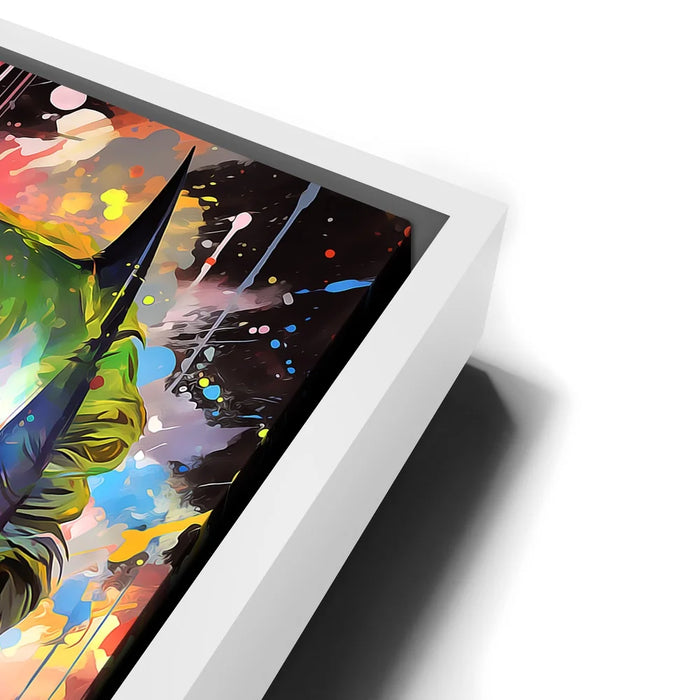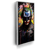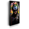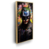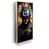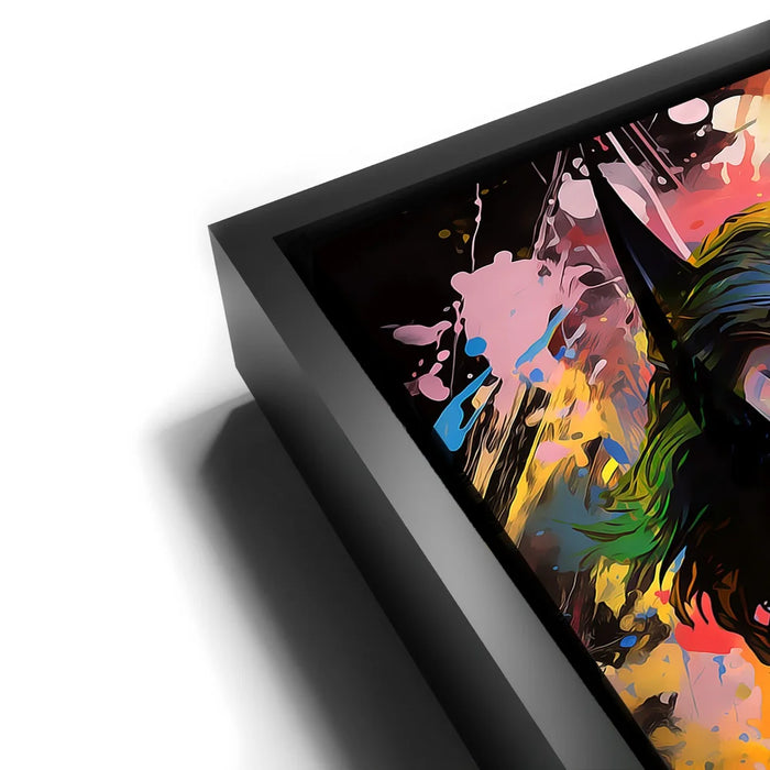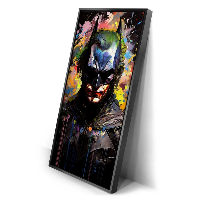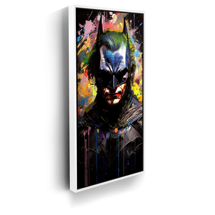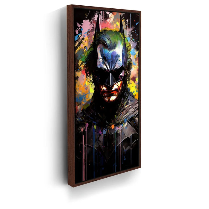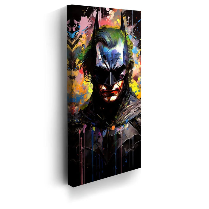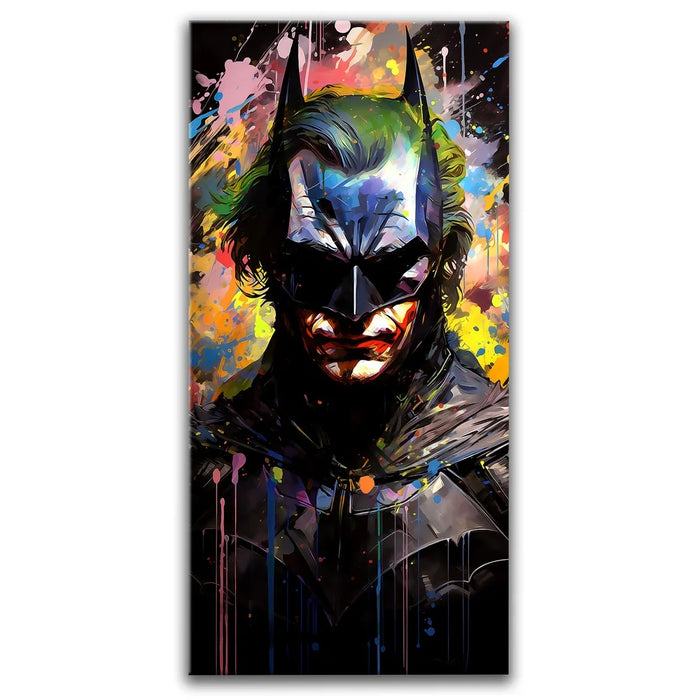"Dark Humor" by G2 Creative is an abstract portrayal of comic book themes, blending iconic elements from "The Dark Knight" universe with vibrant colors and a touch of surrealism. This striking tall portrait captivates with its colorful abstract style, playing on the contrast between dark themes and lively hues, adding a twist of humor and depth.