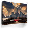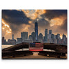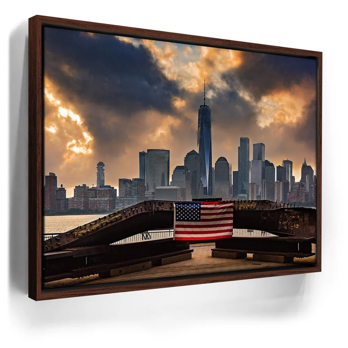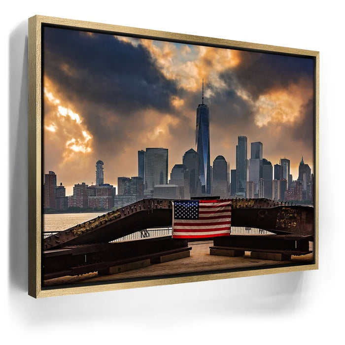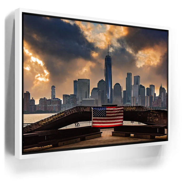 “1 World Trade Center With Flag” by Barbarossa powerfully frames the New York City skyline with the American flag draped across a steel beam in the foreground. The towering presence of One World Trade Center rises against dramatic clouds, symbolizing resilience, unity, and strength.
