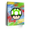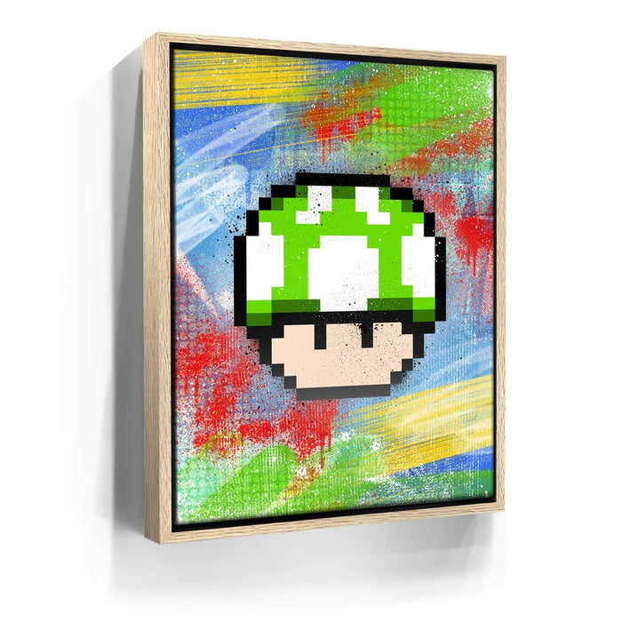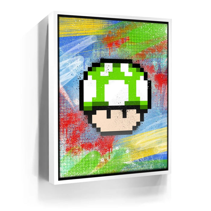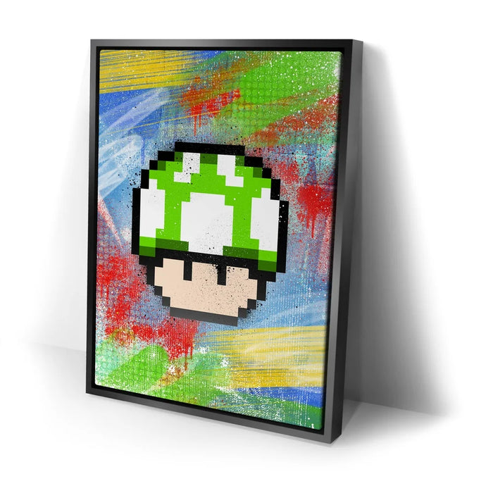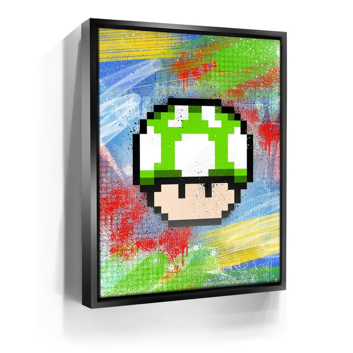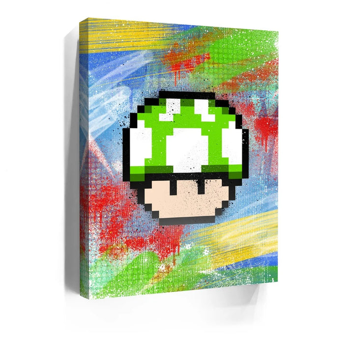 This dynamic piece titled "1UP - Graffiti" is a bold and colorful tribute to 90s nostalgia, blending the iconic imagery of a very popular video game with the edgy, expressive style of street art. The central focus of the artwork is the classic 1UP mushroom, rendered in a pixelated style that pays homage to retro video games.