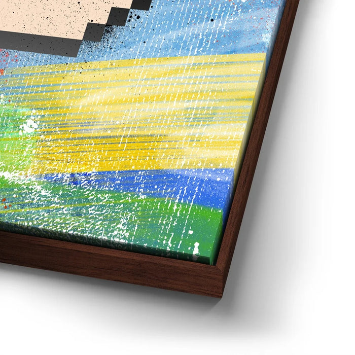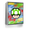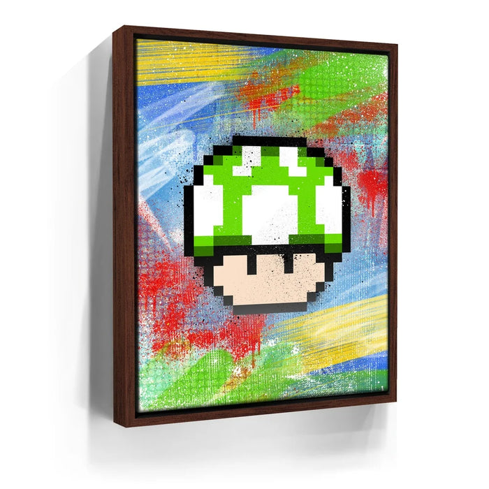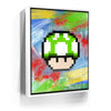 Surrounding the mushroom is a vibrant explosion of colors and graffiti-style elements, creating a lively and energetic composition. This artwork is perfect for fans of video games and street art, bringing a playful and nostalgic vibe to any space with its fusion of gaming culture and graffiti artistry.