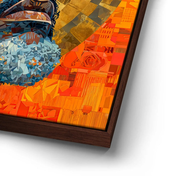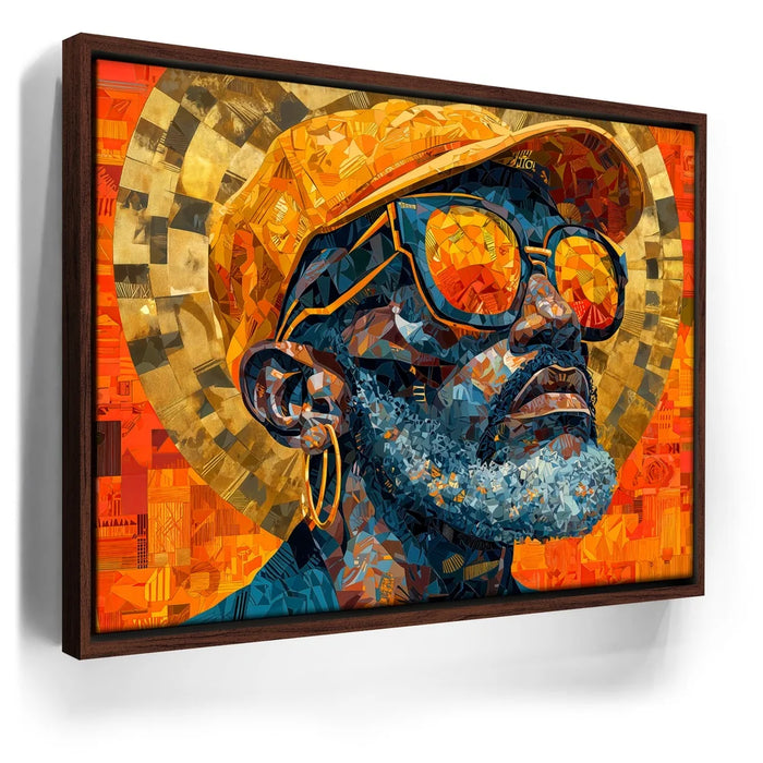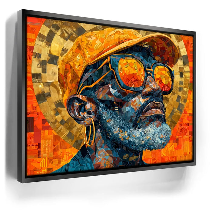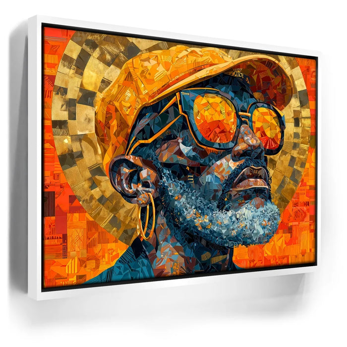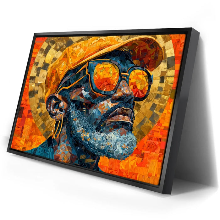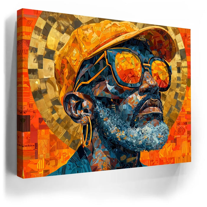 "24K Perspective" by Kandise King is a radiant celebration of wisdom, resilience, and individuality. Featuring a figure in golden hues with reflective sunglasses and a halo-like backdrop, this mosaic-style portrait exudes strength, confidence, and cultural pride. The rich textures and shimmering details make it a bold visual statement that feels both modern and timeless.