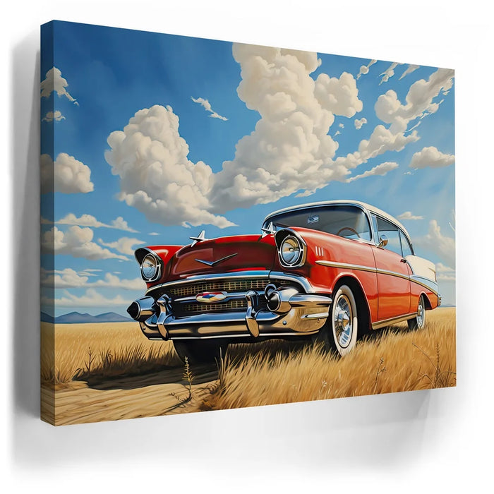 This artwork by Chris Merrill, titled "57' Bel Air," captures the classic beauty of a 1957 Chevrolet Bel Air. The vibrant red two-door station wagon is showcased under a brilliant, cloud-filled sky, parked in a serene golden field. The nostalgic cruiser represents the height of American automotive design. Perfect for lovers of classic cars, this piece evokes a sense of freedom and adventure from a bygone era.
