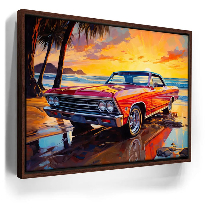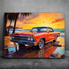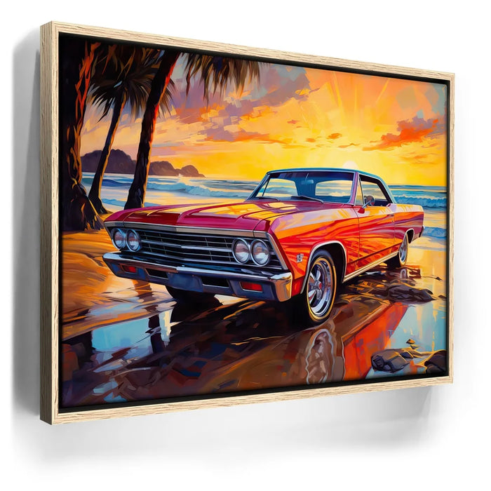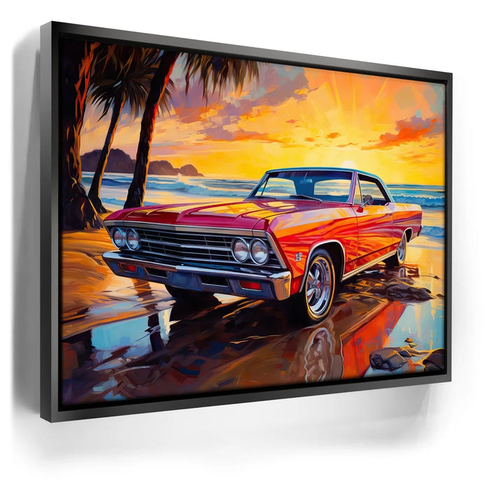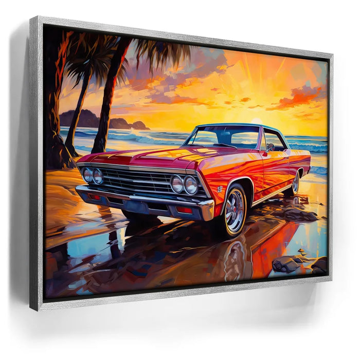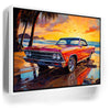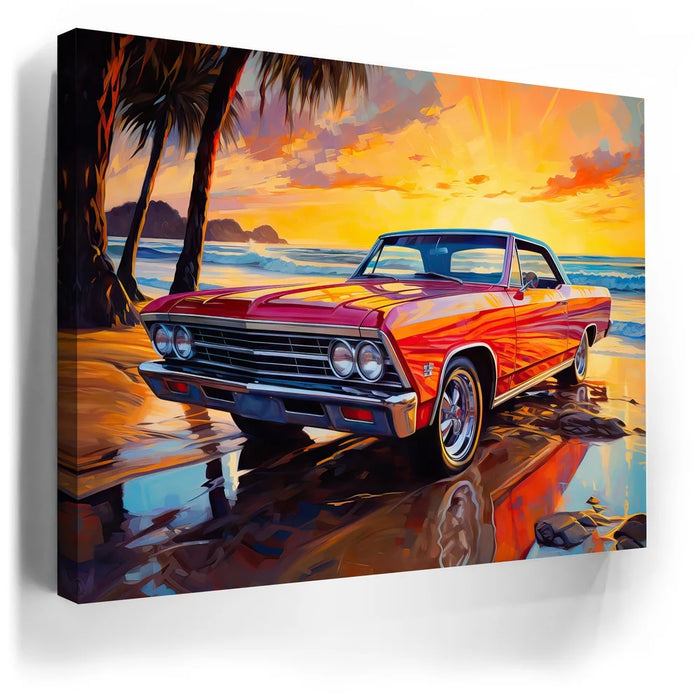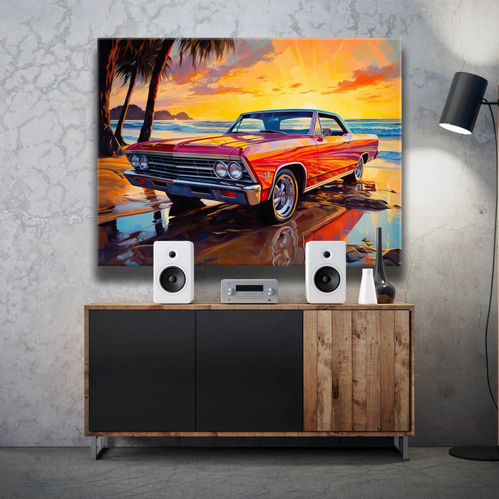This captivating artwork features a vintage two-door 1957 Chevrolet Impala, parked along a beach at sunset. The radiant red car is bathed in the golden glow of the setting sun, while palm trees sway in the background.