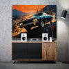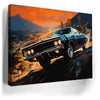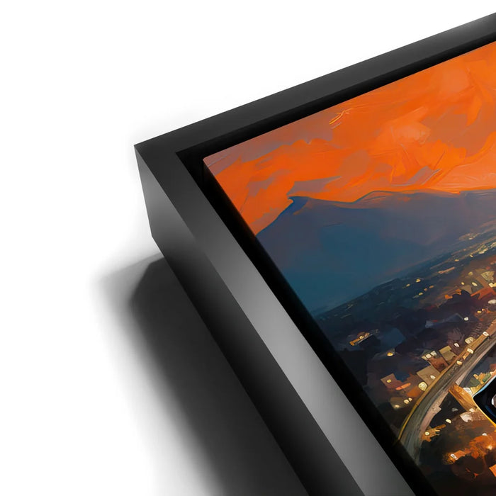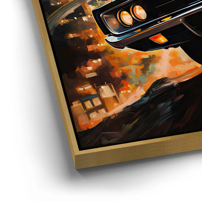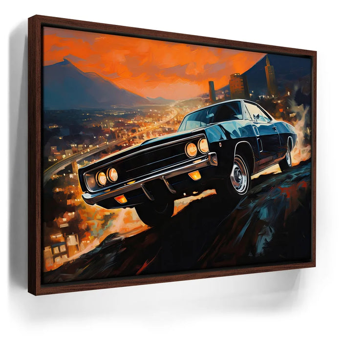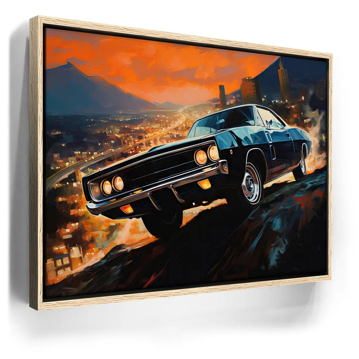 The city's glowing lights, alongside the rugged mountainous backdrop, create a stunning contrast, blending urban energy with the raw force of the car's performance. Perfect for lovers of muscle cars, this painting highlights the iconic Charger in a cinematic, nighttime setting.