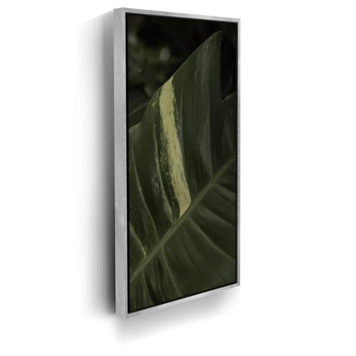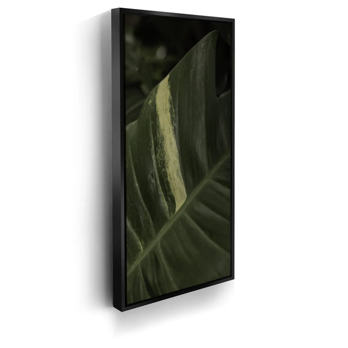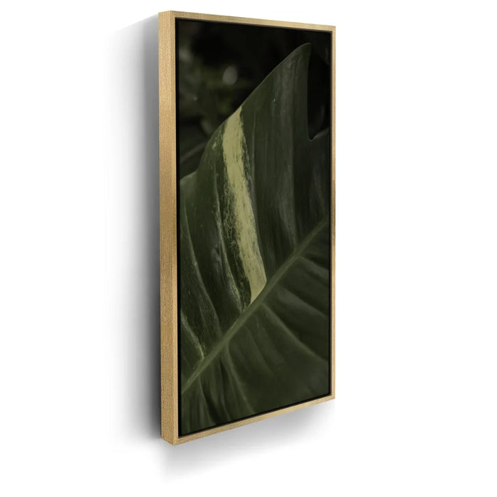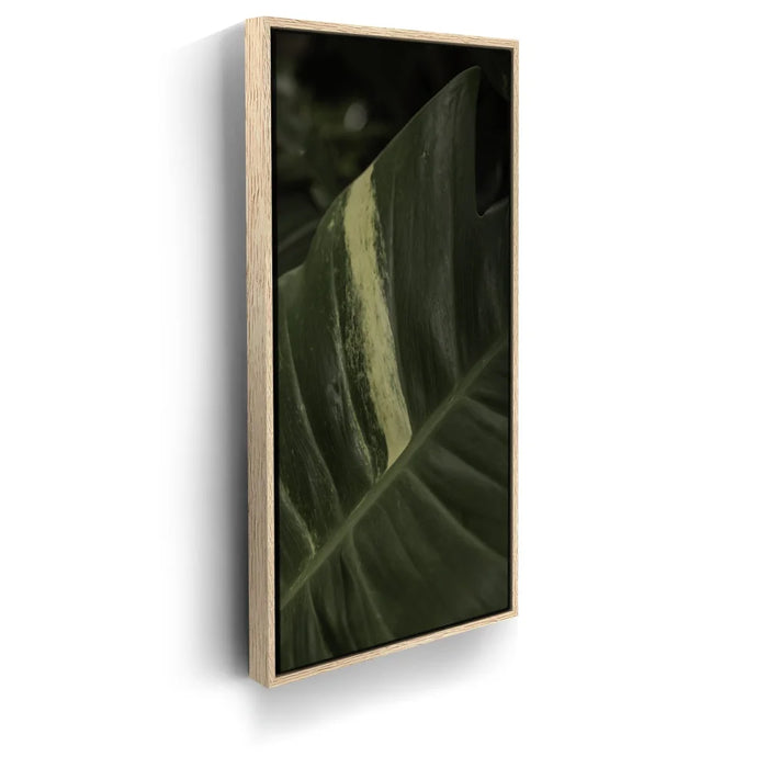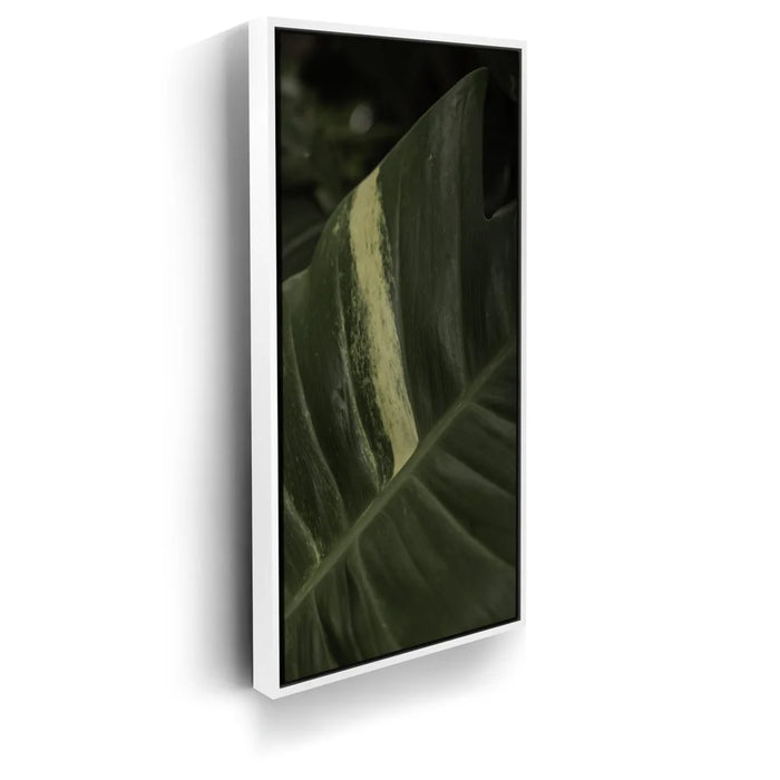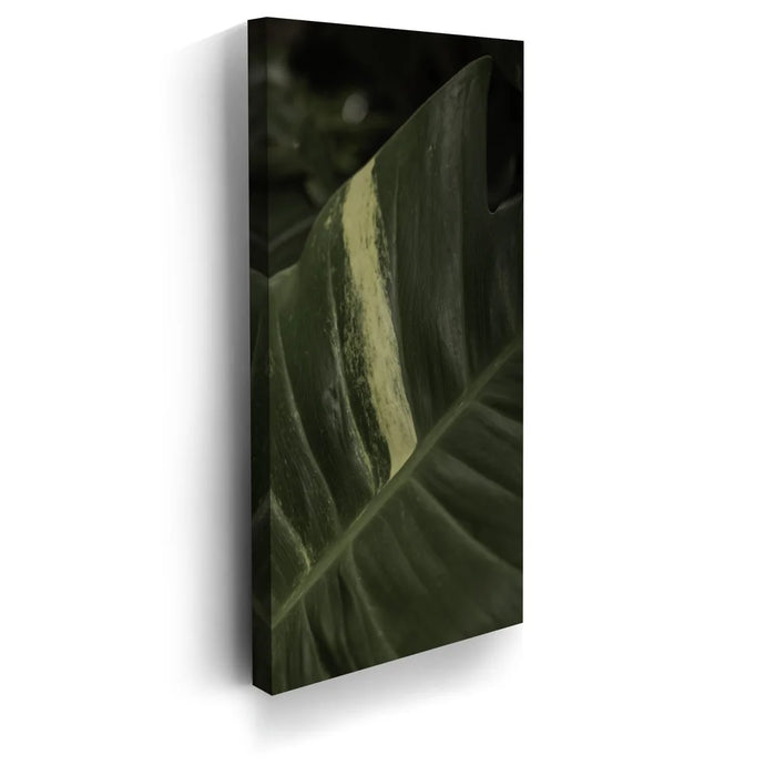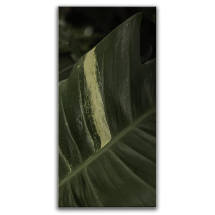 A stunning close-up of a tropical plant leaf captures the intricate beauty of nature in Maui. The rich green tones of the leaf are highlighted by a striking pale stripe, creating a captivating contrast that draws the eye.