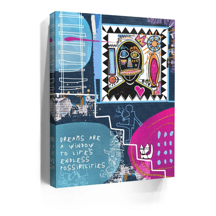 This vibrant artwork titled "A Dream Is A Window" draws from neo-expressionism and abstract styles, offering a tribute to the legacy of Jean-Michel Basquiat. The piece incorporates colorful graffiti elements, bold lines, and symbolic imagery such as hearts, crowns, and stairs, representing life's endless possibilities.