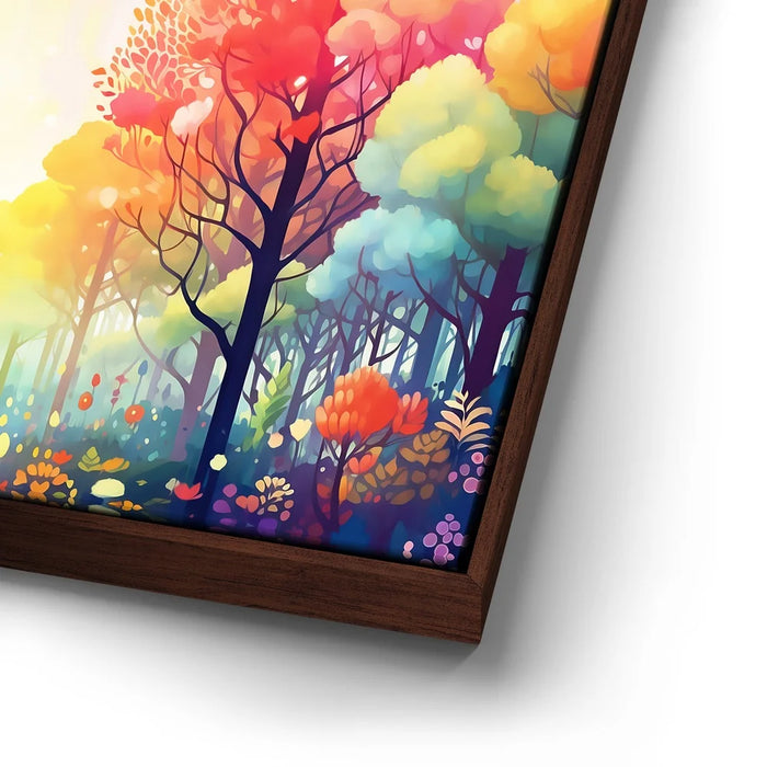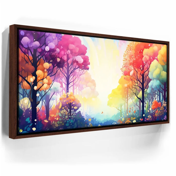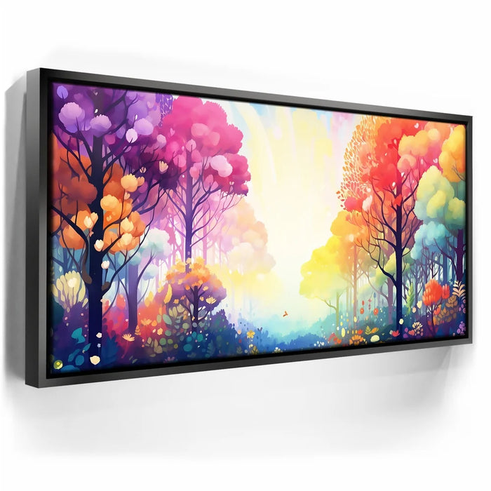 A Forest of Vibrant Dreams wall art immerses you in a world of color and tranquility. This enchanting landscape features radiant trees in shades of pink, orange, yellow, and blue, glowing with soft light that evokes warmth, peace, and imagination. The dreamy forest scene creates a sense of serenity and wonder — a perfect blend of fantasy and nature-inspired beauty.