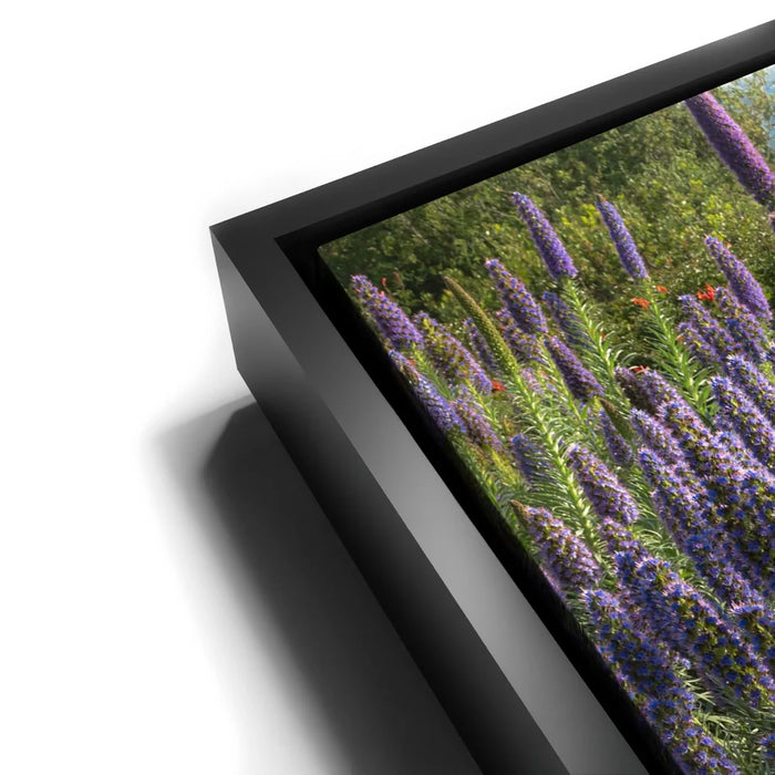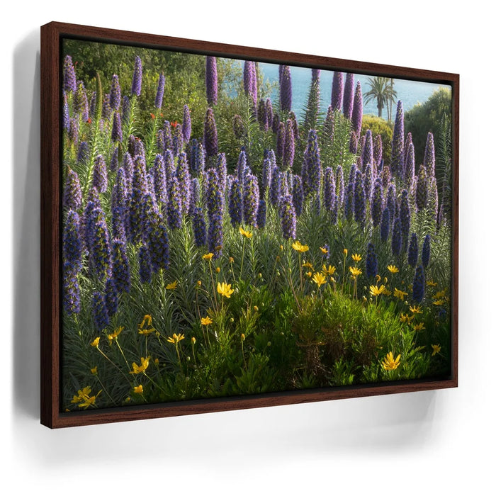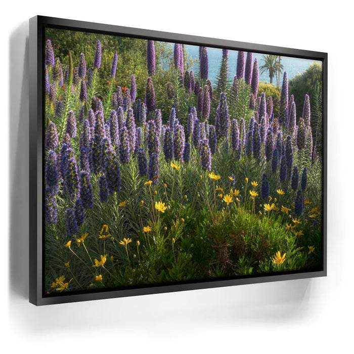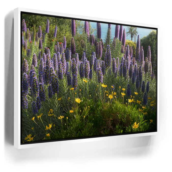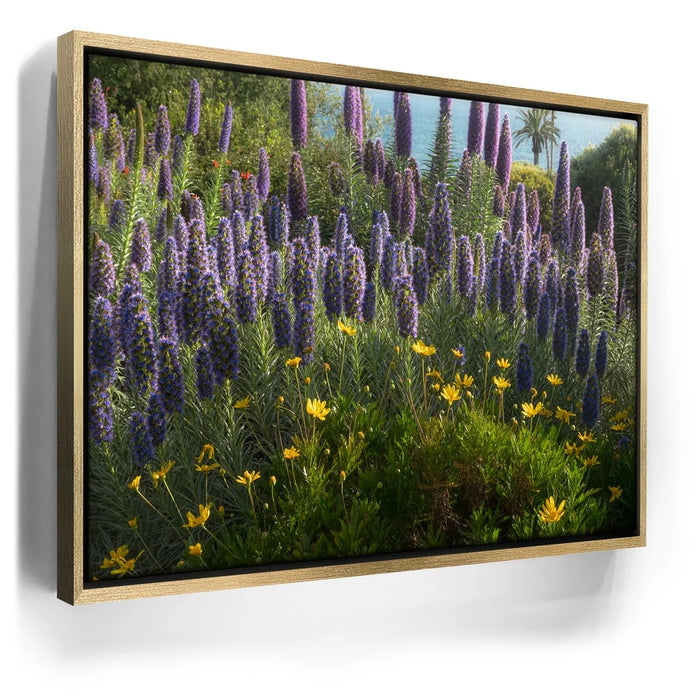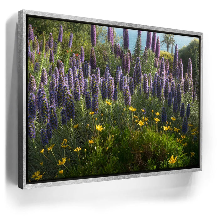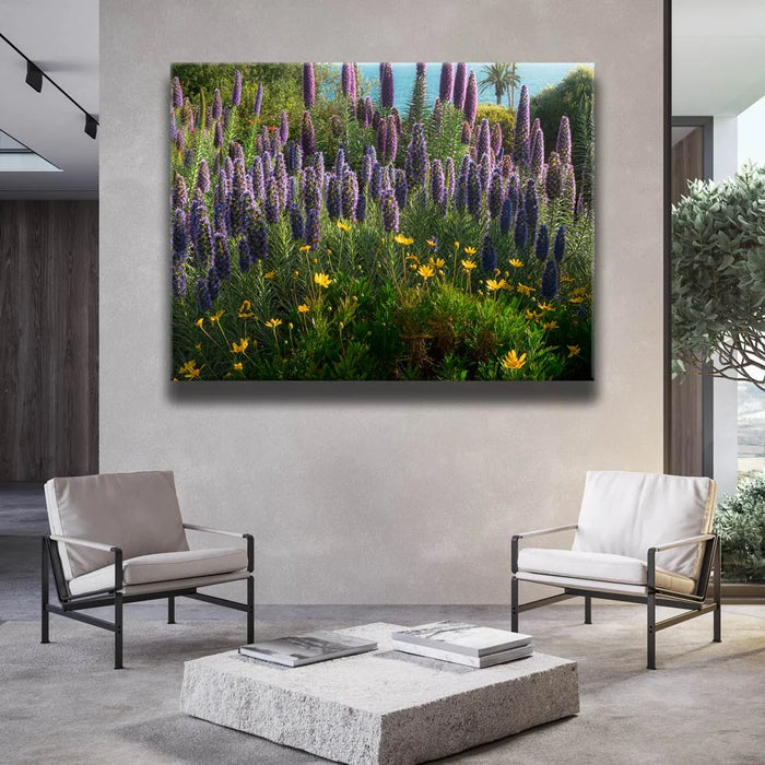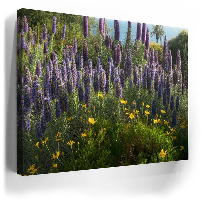 This vibrant photograph, titled "A Laguna Beach Spring," captures the natural beauty of a blooming garden by the ocean. The image showcases tall lavender spikes and bright yellow daisies, set against the backdrop of lush greenery and a distant view of the beach. The serene setting and lively colors make it a perfect addition to living rooms, hallways, or bedrooms, evoking a sense of tranquility and connection to nature. Photograph by 11th Dimension, this piece brings the beauty of a beach garden into any space.