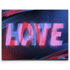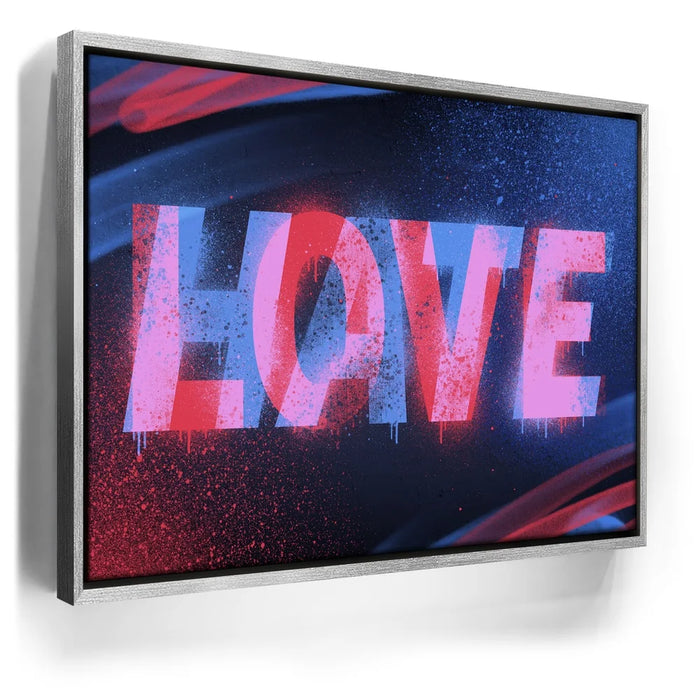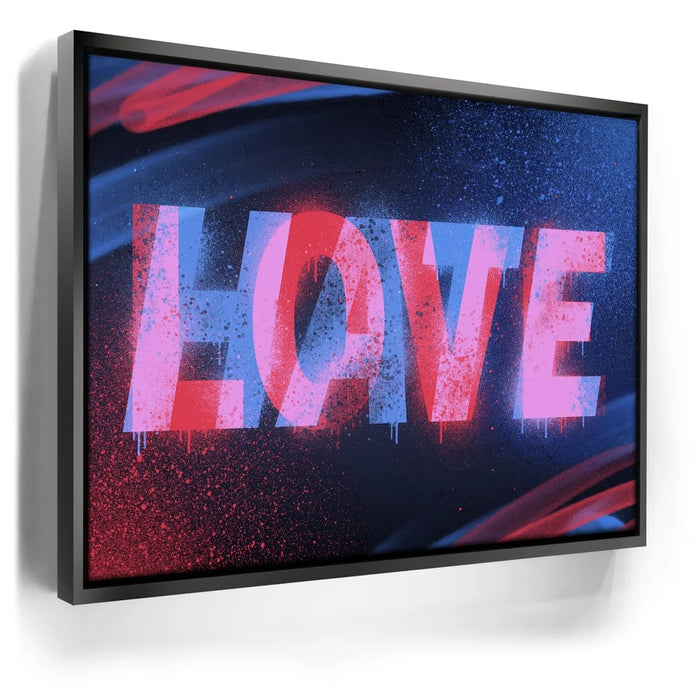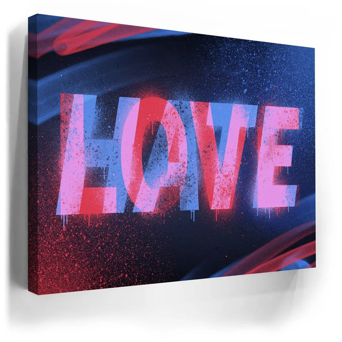 This striking piece, titled "A Love Hate Relationship," explores the duality of emotions through bold typography and dynamic spray paint effects. The overlapping words "LOVE" and "HATE" are rendered in a vivid blend of red and blue, evoking the visual effect of 3D glasses.