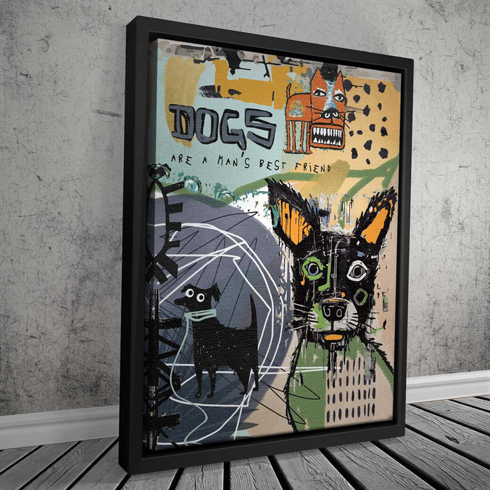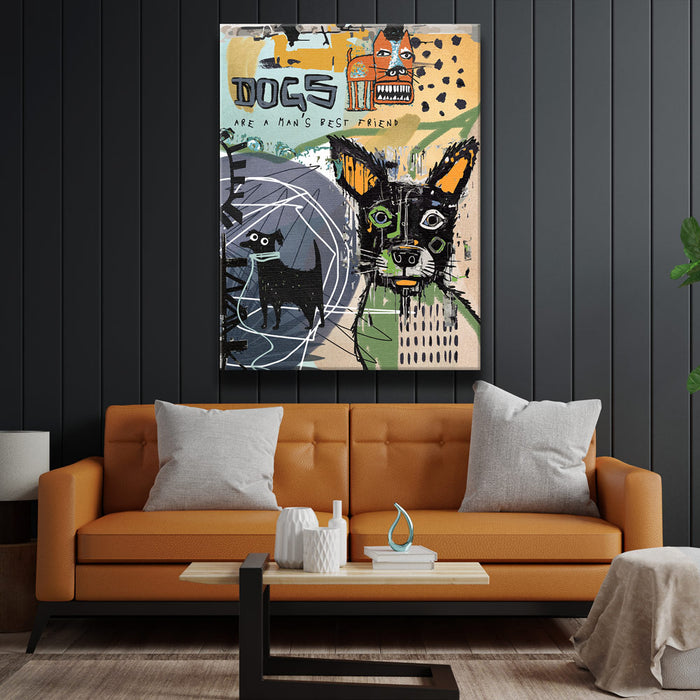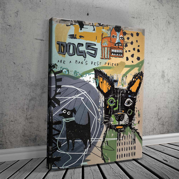 This artwork, titled "A Man's Best Friend," blends neo-expressionism with abstract street art style, paying tribute to Basquiat's raw and emotive aesthetic. With a colorful, graffiti-like design, it highlights the bond between humans and their loyal canine companions. The text "Dogs are a Man's Best Friend" complements the playful and energetic depiction of the dog, surrounded by abstract patterns and vibrant hues, making it both inspirational and heartfelt.