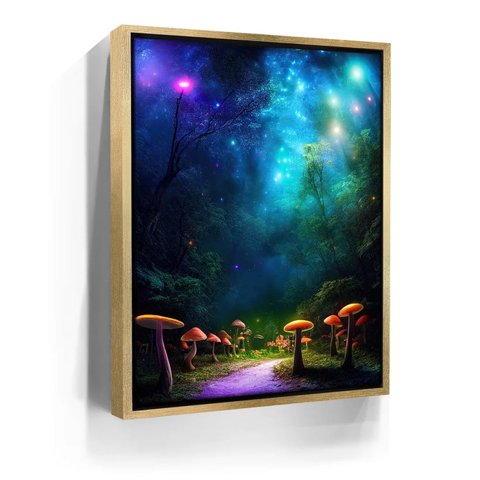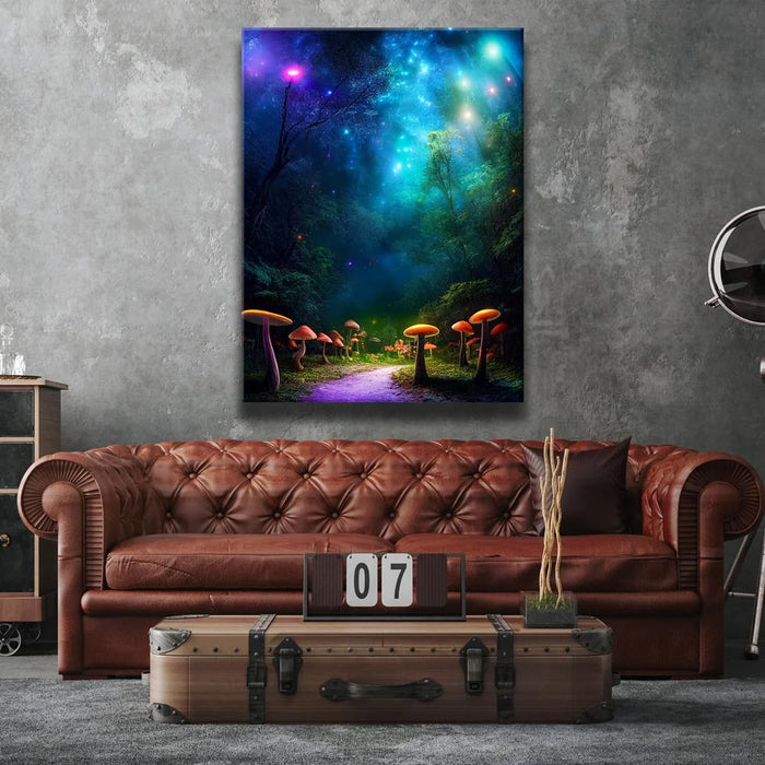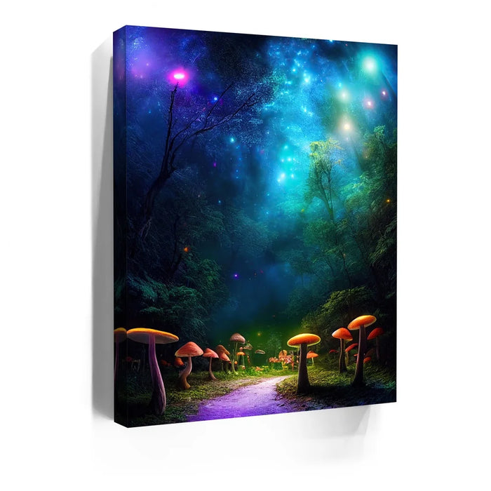 This stunning artwork, "A Night on Pandora II," transports viewers to a magical, bioluminescent forest reminiscent of the vibrant world of Pandora. The glowing mushrooms and illuminated path lead through a mystical scene, with the night sky twinkling like fairy lights.