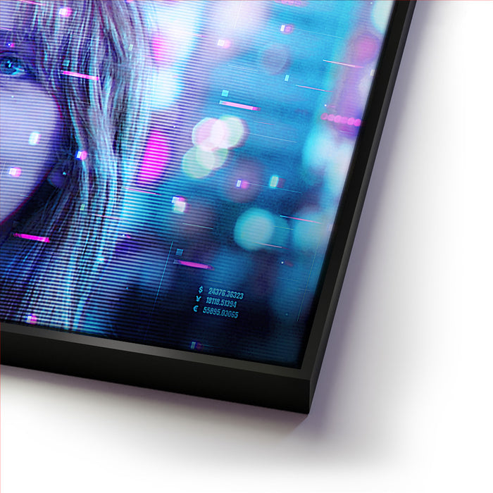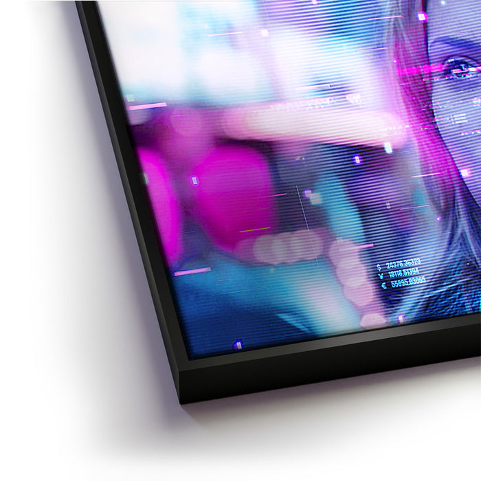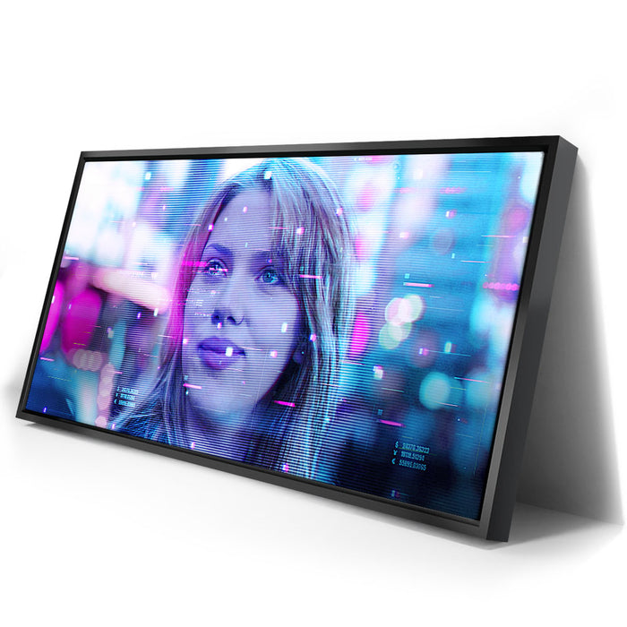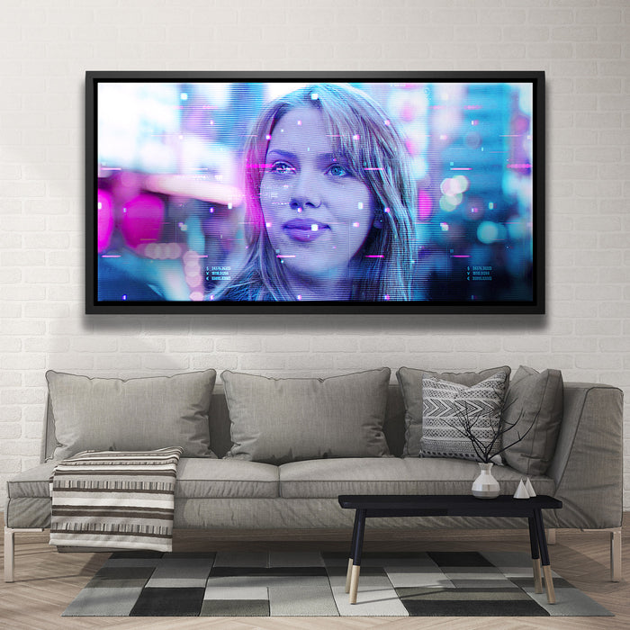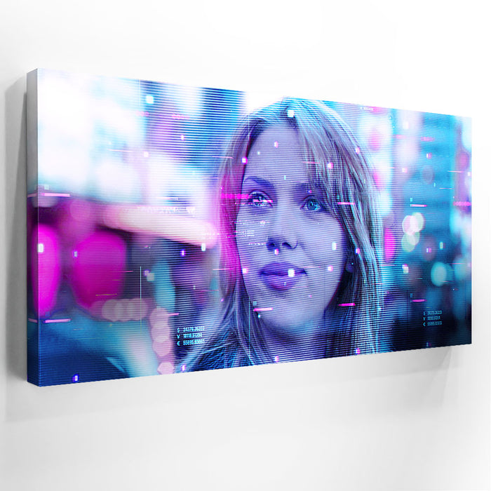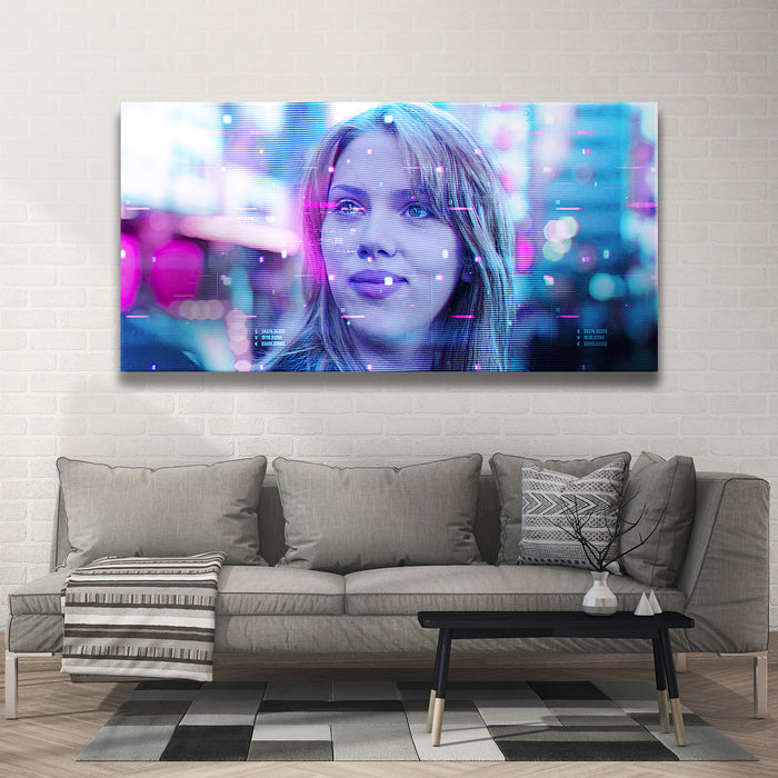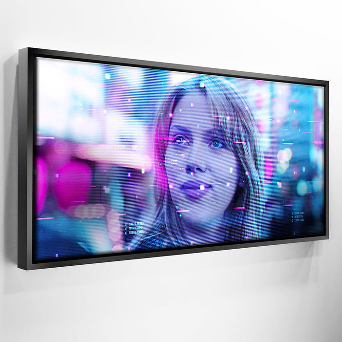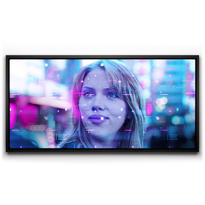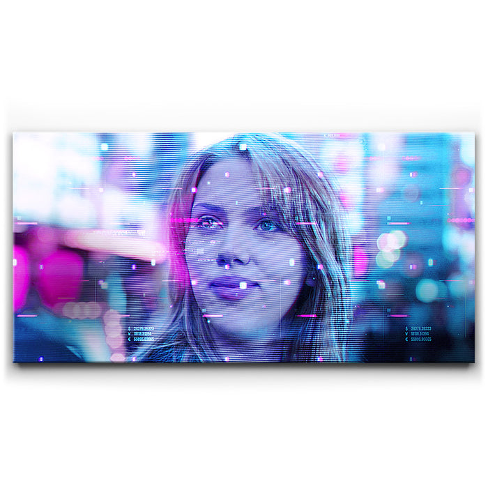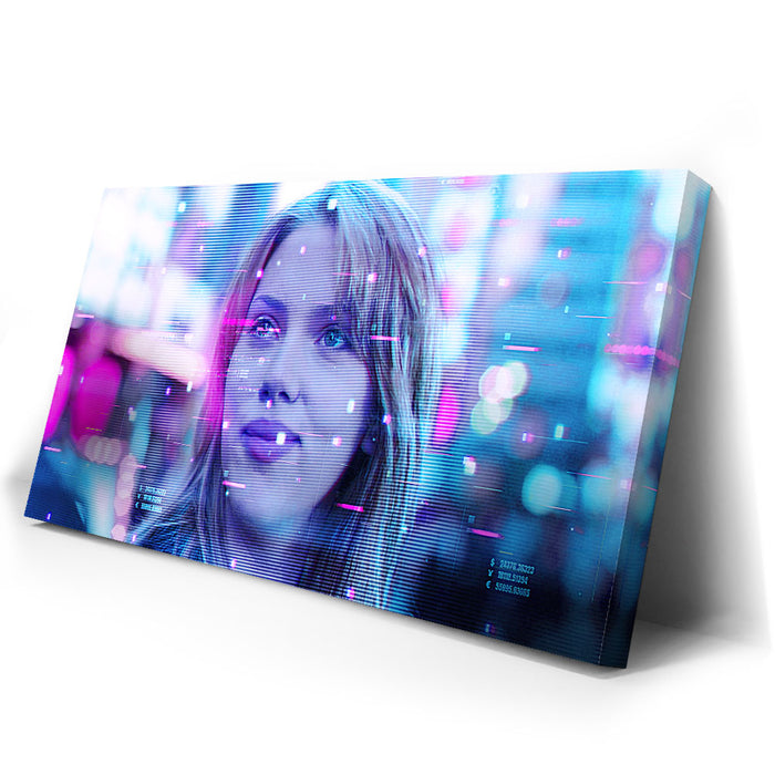 This image captures a futuristic and dreamy portrayal of Scarlett Johansson’s character, Charlotte, from the film Lost in Translation. The neon hues, with a mix of pinks and blues, enhance the Tokyo nightscape's digital atmosphere, suggesting a sense of introspection and mystery. The image features a glitchy, sci-fi overlay, adding a modern aesthetic to this iconic scene. Perfect for fans of Scarlett Johansson, the film Lost in Translation, and those who enjoy cinematic visuals paired with a cyberpunk twist.