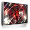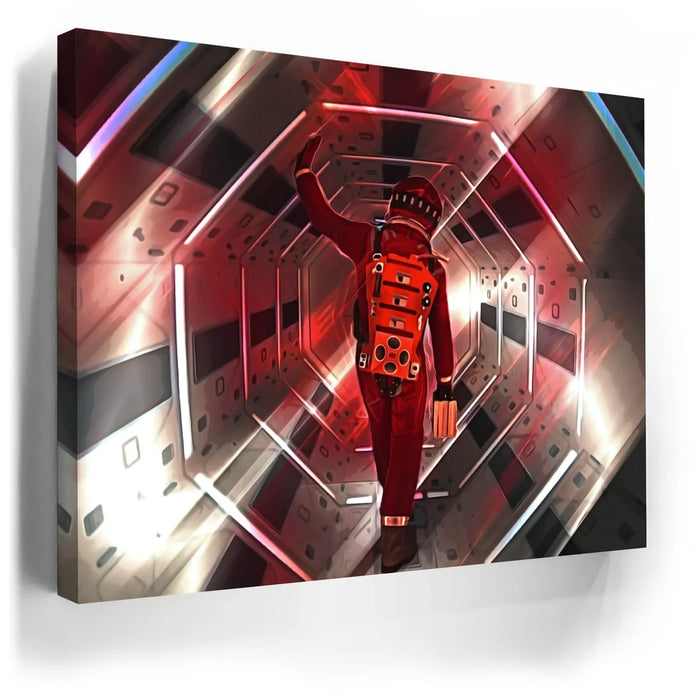This image showcases an iconic scene from Stanley Kubrick's 2001: A Space Odyssey, where an astronaut in a vibrant red suit is seen floating through a futuristic space station corridor. The geometric and luminous design of the passageway highlights Kubrick's visionary depiction of space exploration.