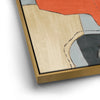 "Abstract Dreams 10" pulses with mid-century modern energy, combining bold terracotta, soft slate blue, and deep charcoal in a rhythmic dance of lines and color blocks. Two swirling orbs seem to orbit within layered geometric spaces, suggesting balance, motion, and cosmic play.