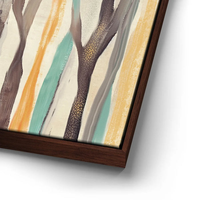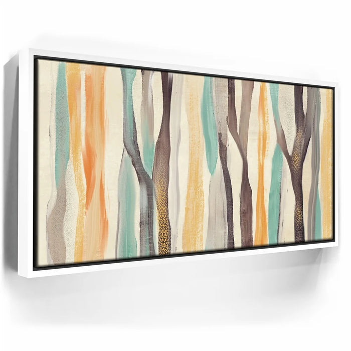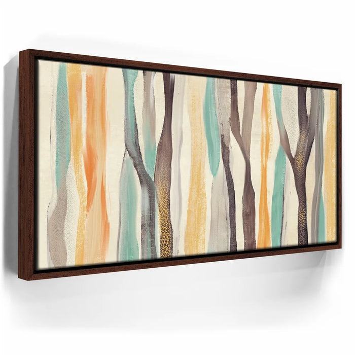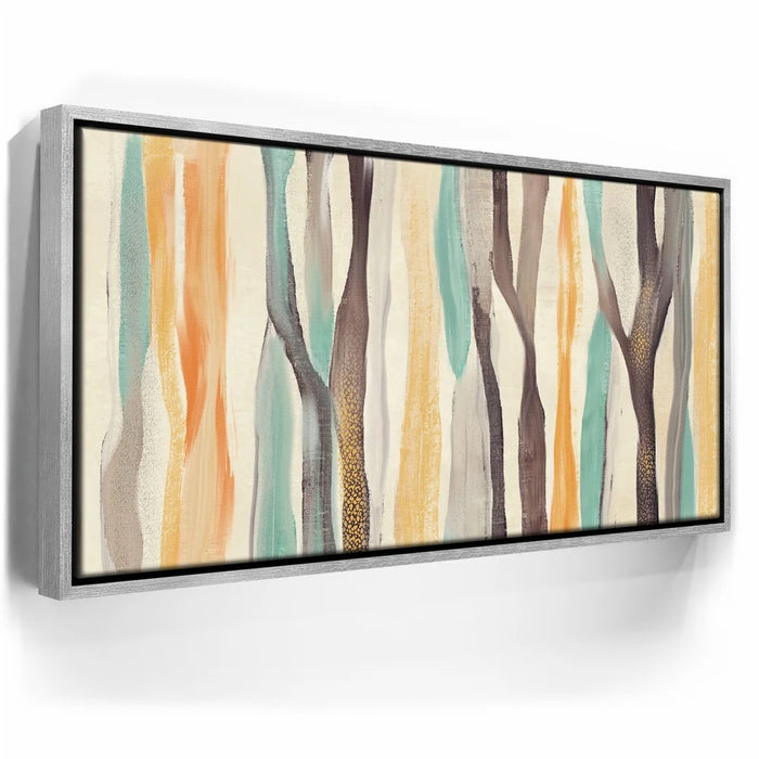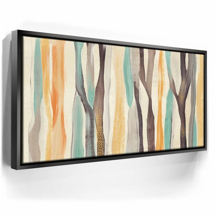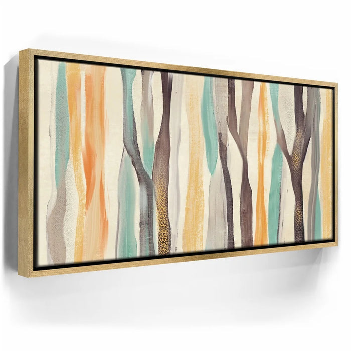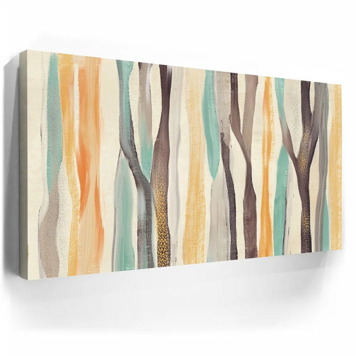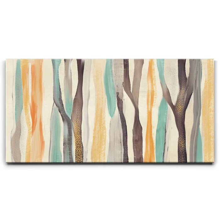 Abstract Dreams 28 brings a whimsical forest to life through soft brushstrokes and a warm, nature-inspired palette of honey gold, burnt orange, aqua blue, and charcoal. The flowing, tree-like forms create a sense of organic movement and calming energy that enhances any contemporary or rustic space.