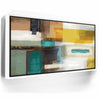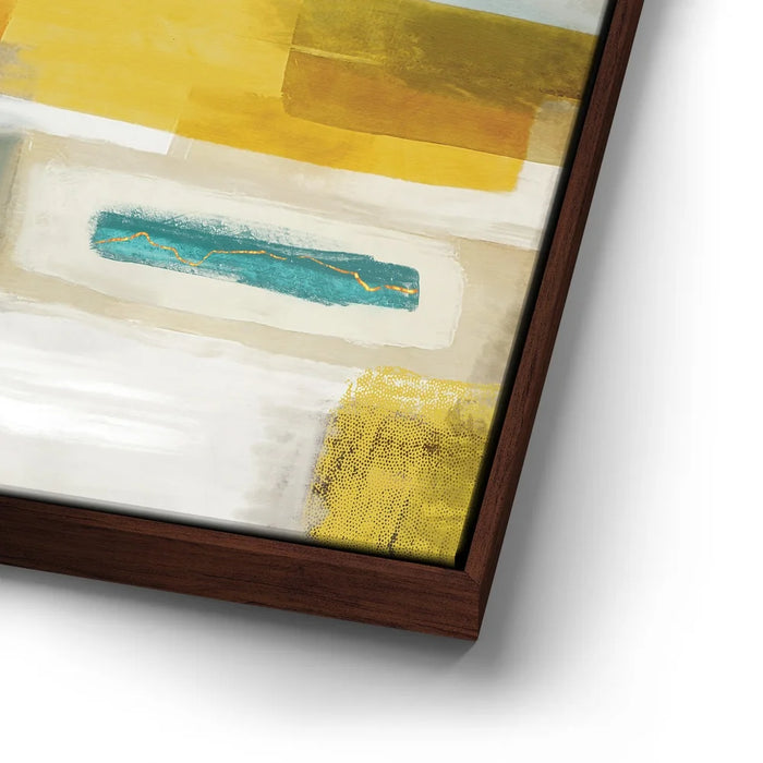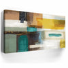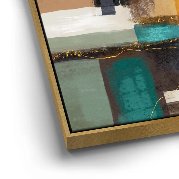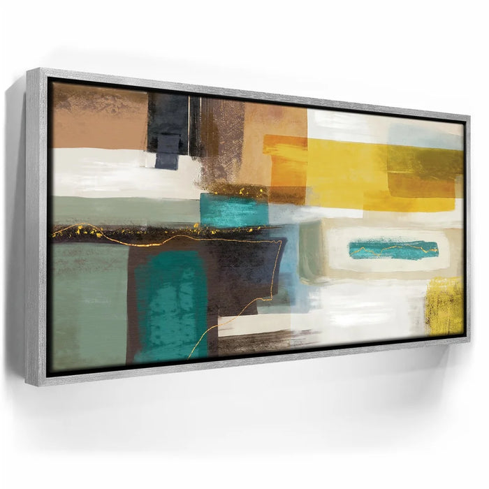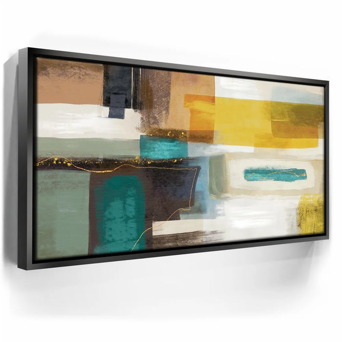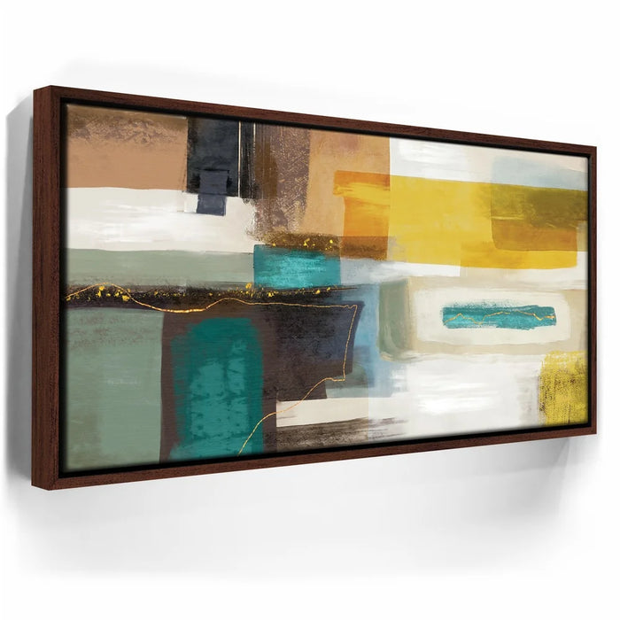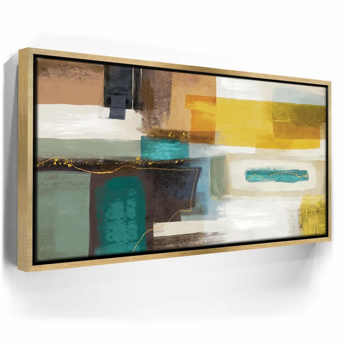 This piece adds richness to any space, ideal for mid-century, modern, or eclectic interiors. Keywords: teal and mustard abstract art, gold accent canvas, bold geometric wall décor, rich color block painting, contemporary living room artwork.