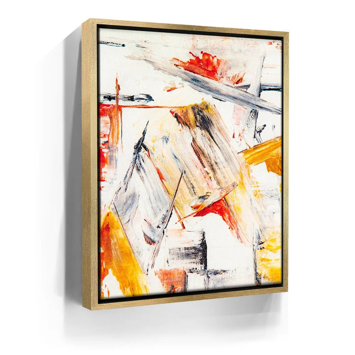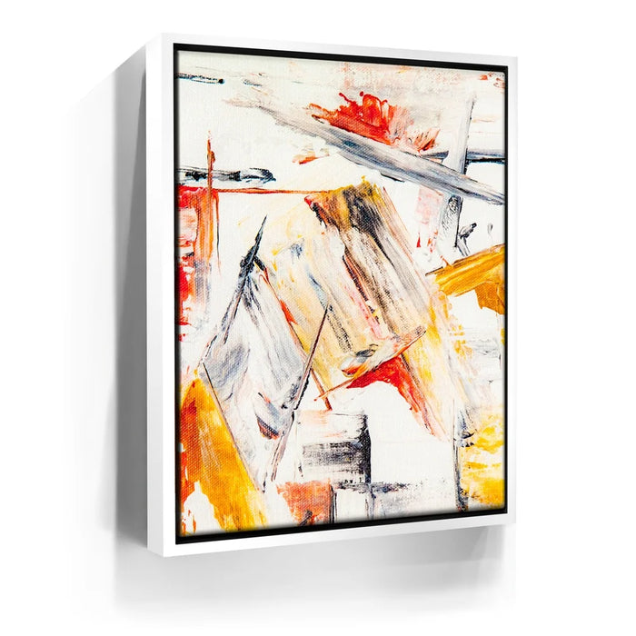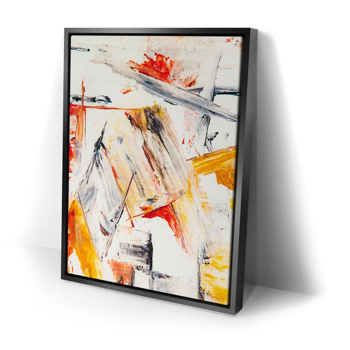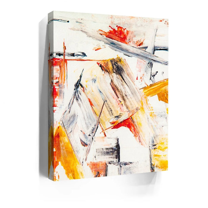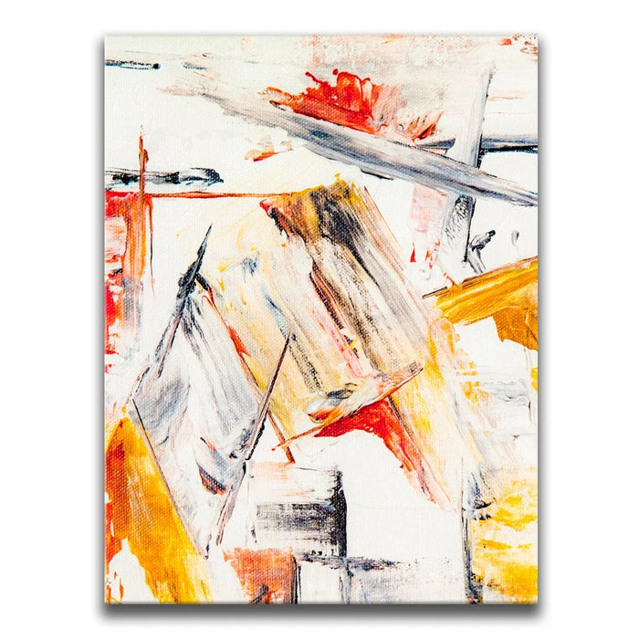 This piece, titled "Abstract Harmony," showcases a minimalist and abstract style with dynamic shapes, smudges, and colorful accents. The combination of whites, yellows, and reds creates a striking contrast, while the bold lines and geometric forms contribute to a sense of balance and flow.