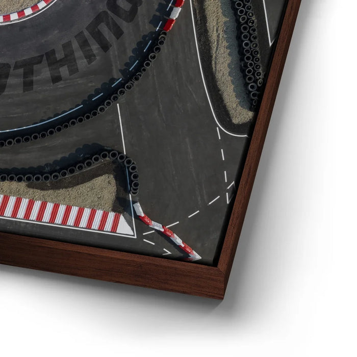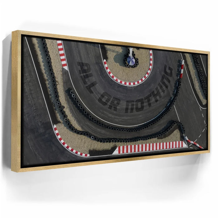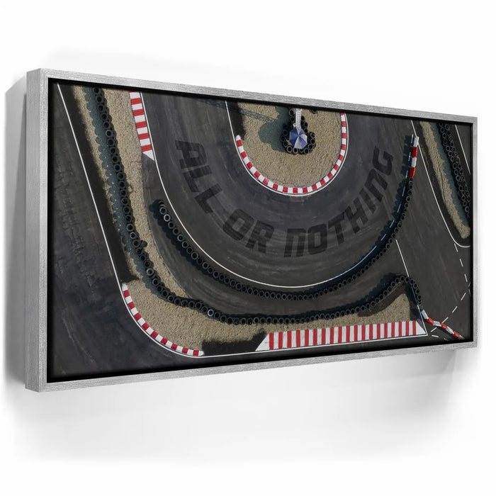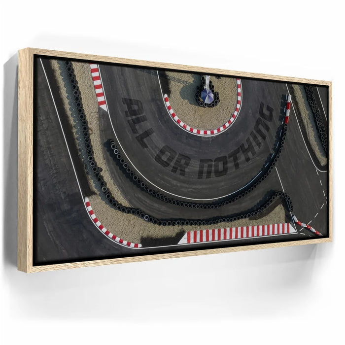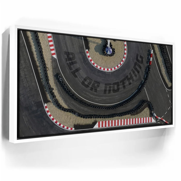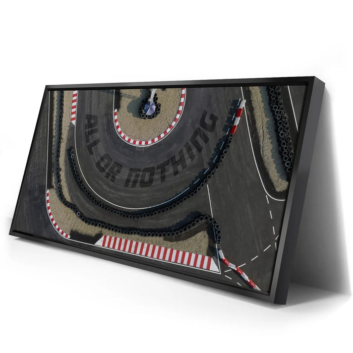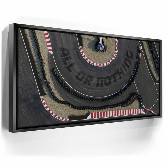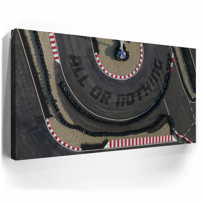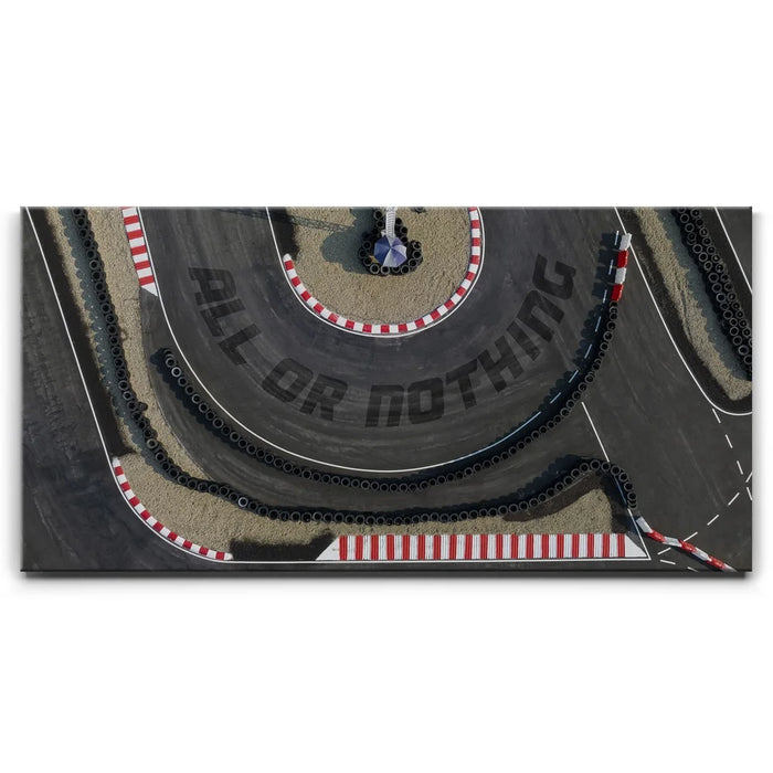 "All Or Nothing - Black Text" is a dynamic aerial photograph that showcases a thrilling race track with bold typography embedded on the pavement. The powerful message, "All Or Nothing," speaks to the high-stakes nature of racing and competition. This visually striking image captures the essence of speed, risk, and precision on the track, making it ideal for motorsport enthusiasts and those who embrace a go-big-or-go-home mentality.