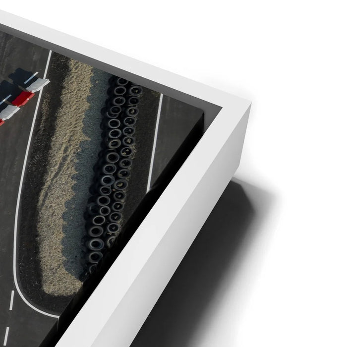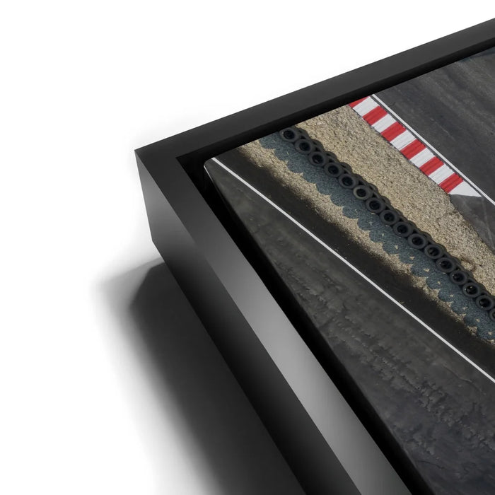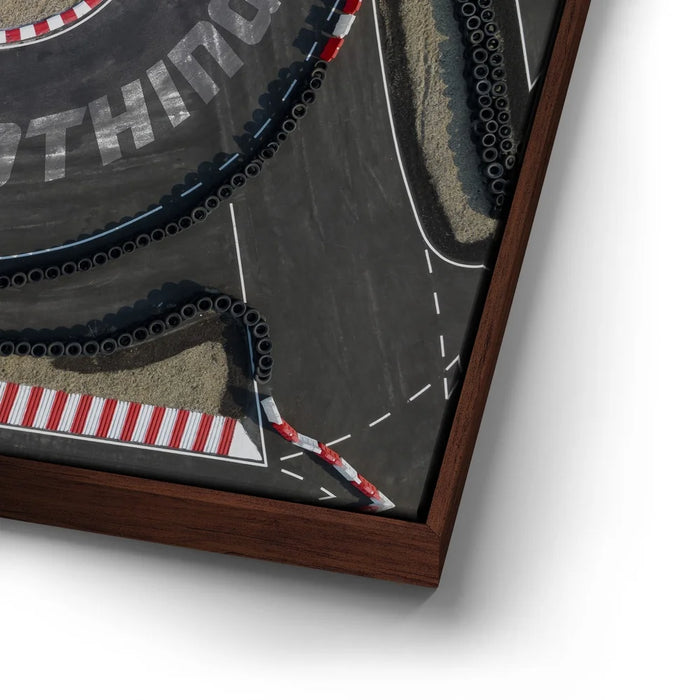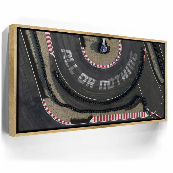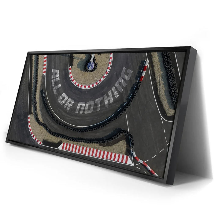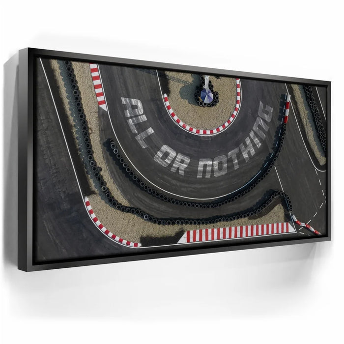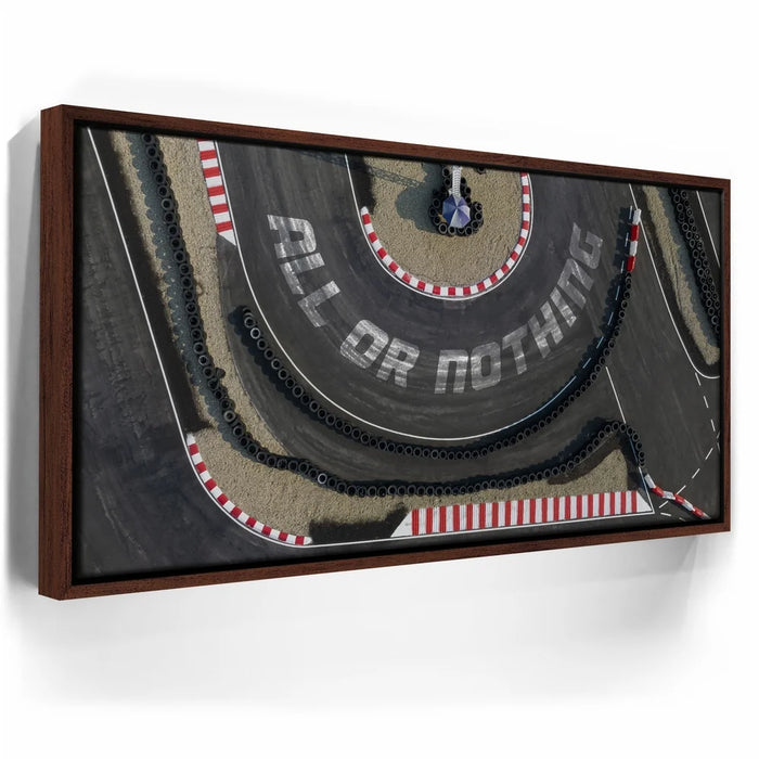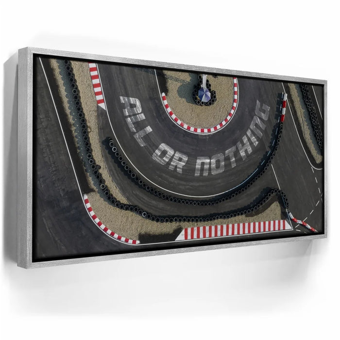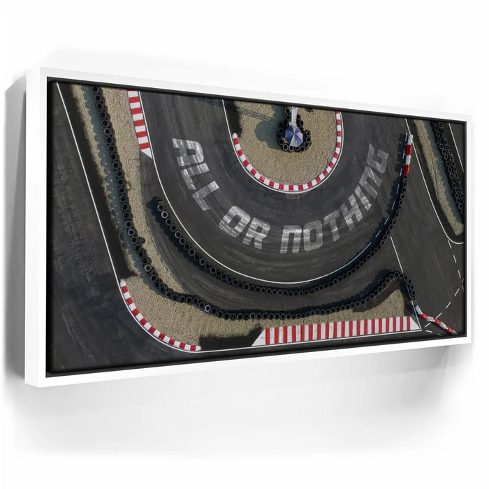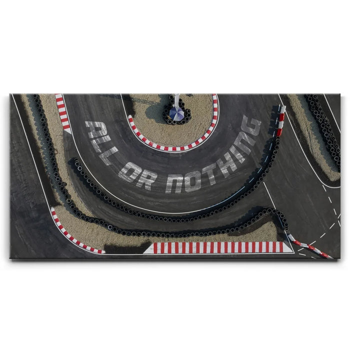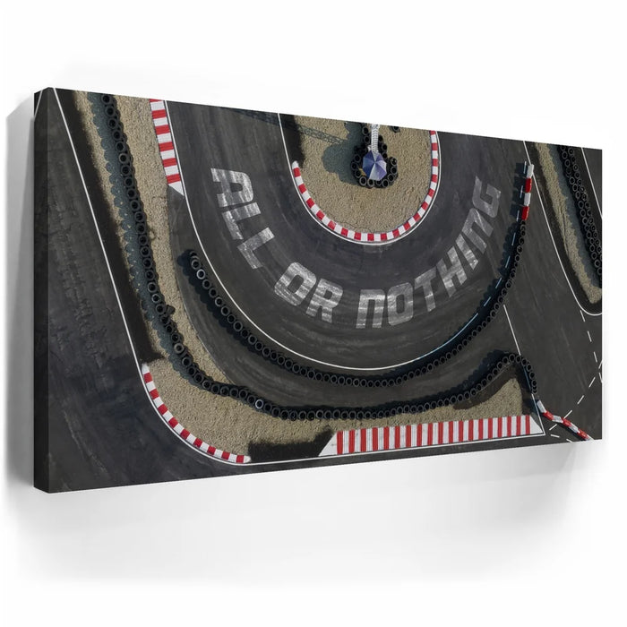"All Or Nothing - White Text" captures an aerial view of a racing circuit with the bold message "All Or Nothing" prominently displayed on the track in white. The striking contrast of the text against the dark pavement emphasizes the intensity and focus required in high-speed motorsport competitions. This piece conveys the high-stakes energy of racing, making it perfect for motorsports enthusiasts and adrenaline seekers.