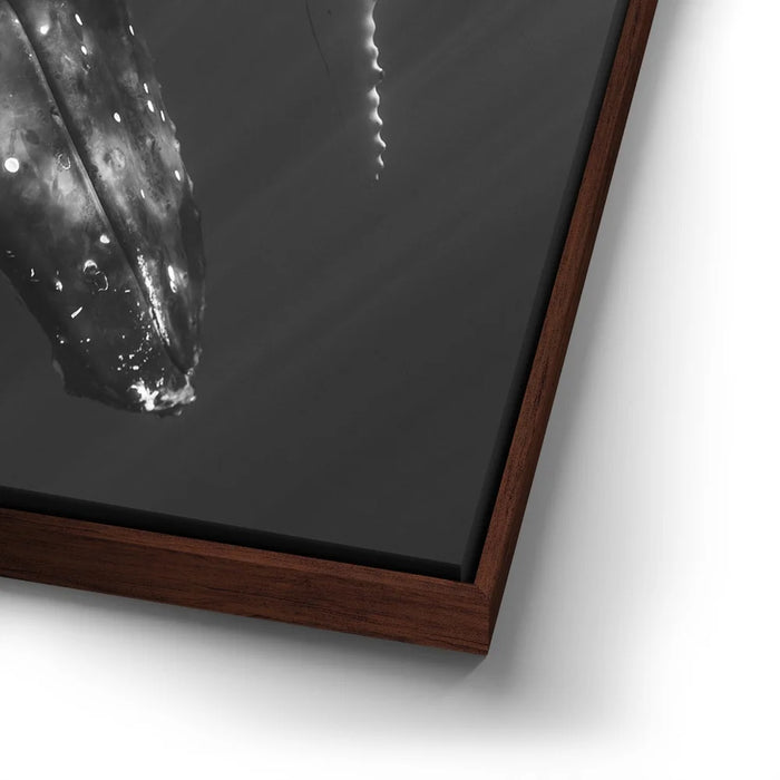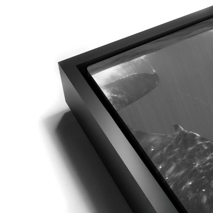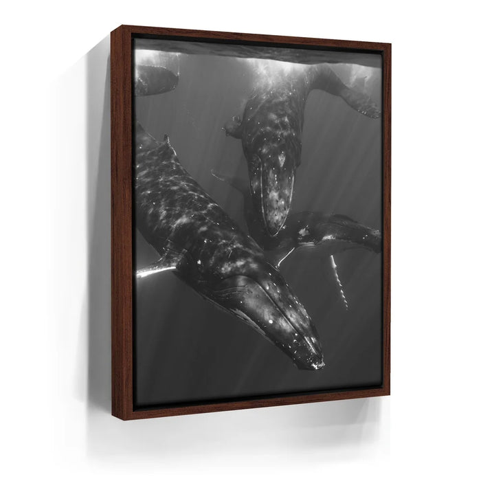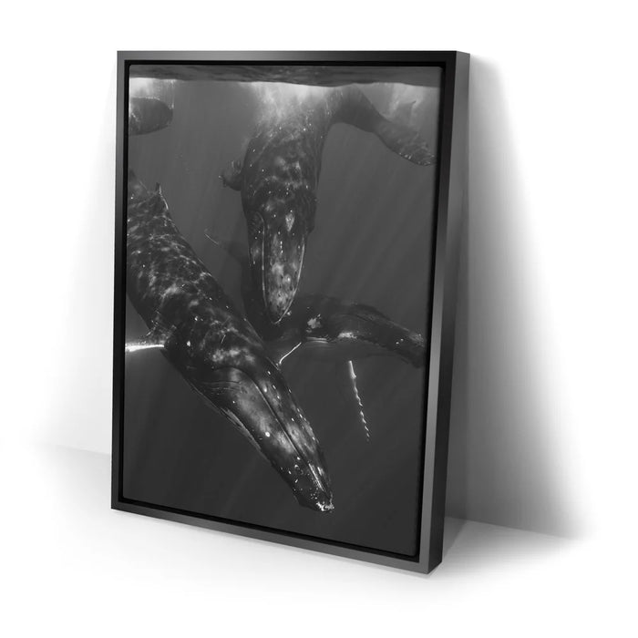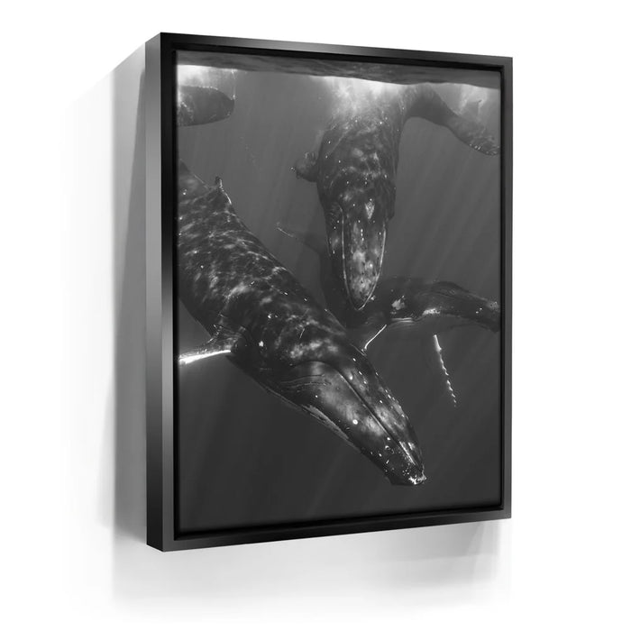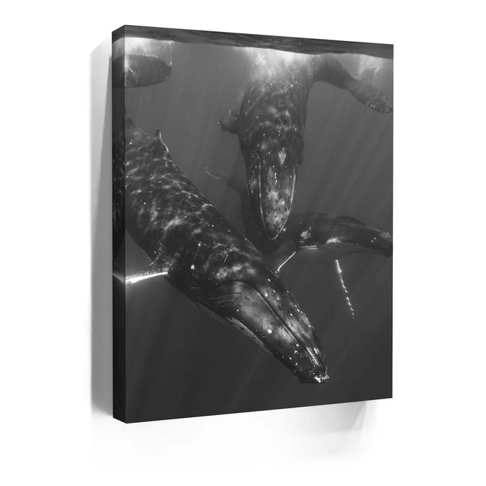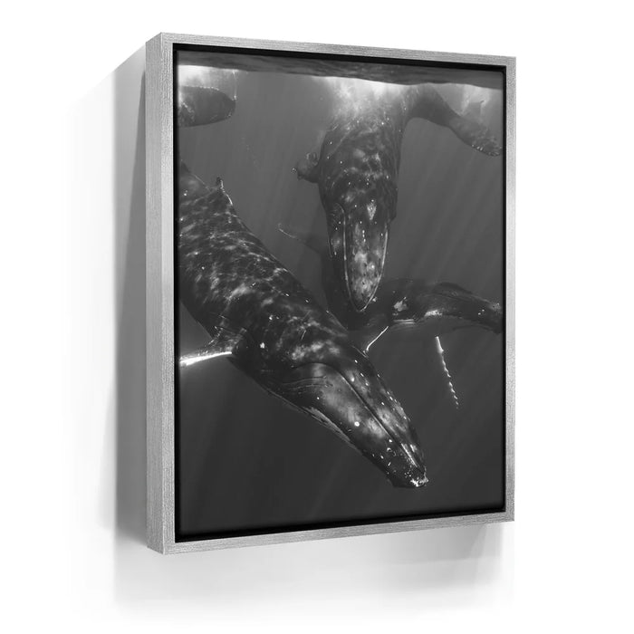 "All Together In B&W" by Thaís Mendonça presents a mesmerizing underwater encounter with majestic whales off the coast of Tahiti. This black-and-white photograph emphasizes the textures and gentle grace of these marine giants as they glide together beneath the surface, bathed in soft light beams. Capturing the harmony of nature, this image showcases the beauty and connection of life in the ocean’s depths.