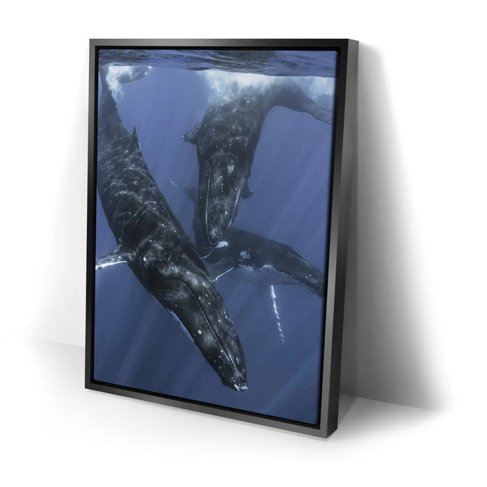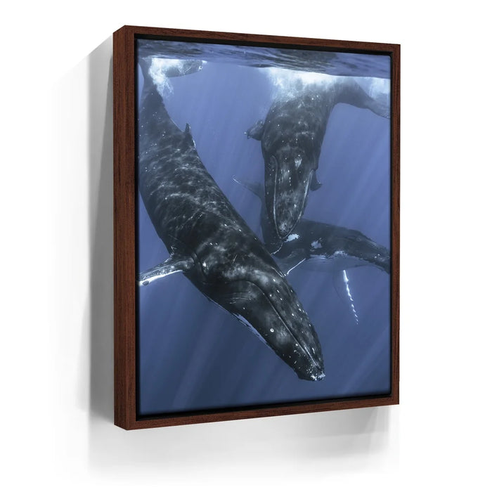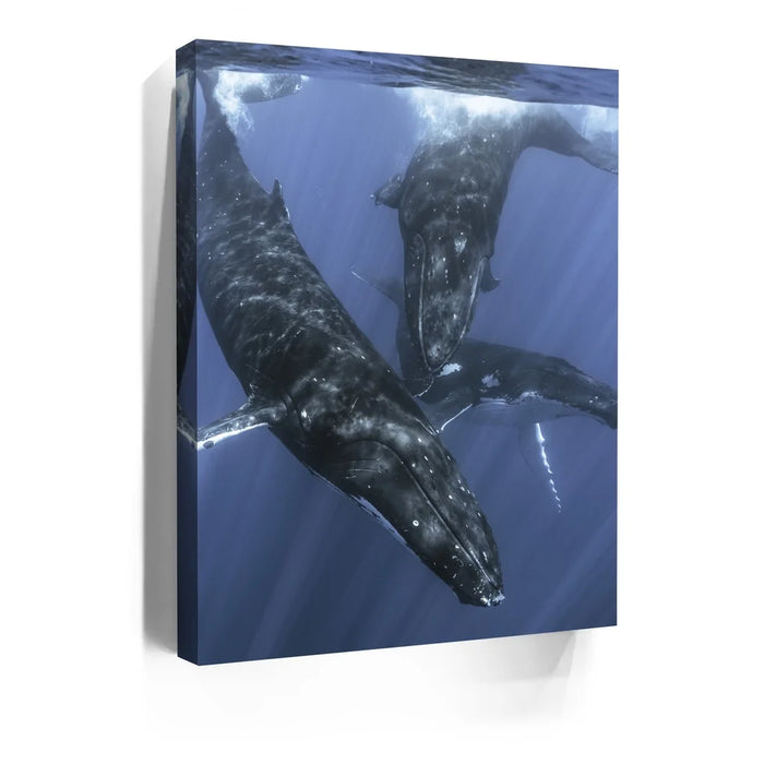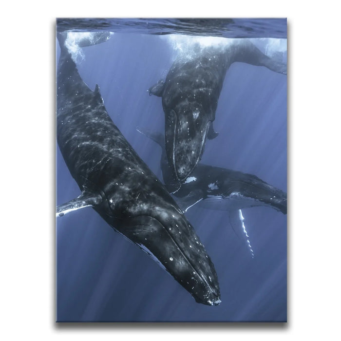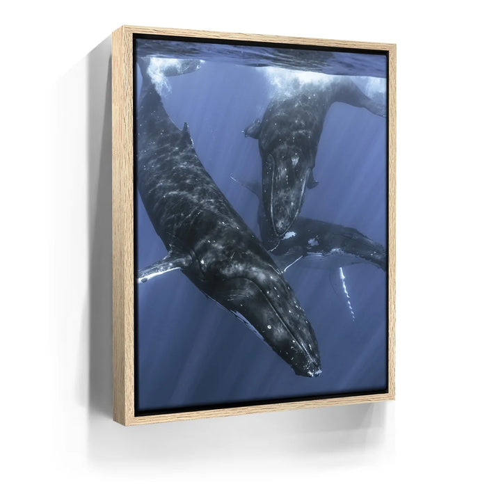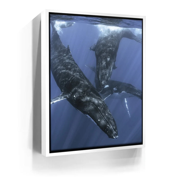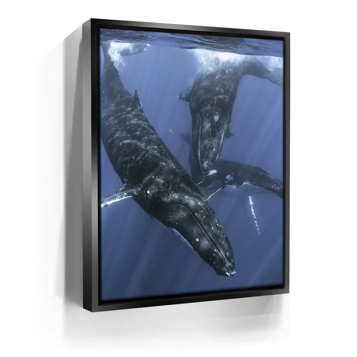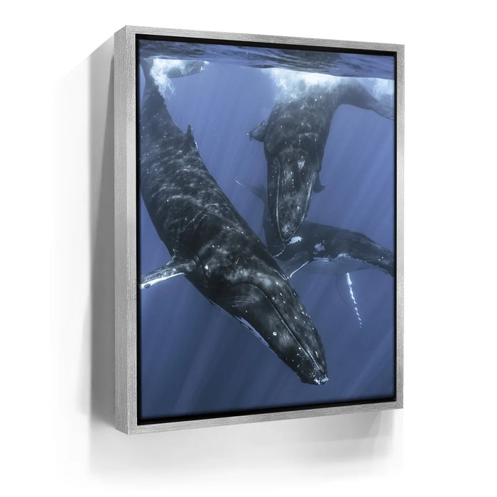 "All Together In BLUE" by Thaís Mendonça captures the serene beauty of humpback whales in the pristine waters of Tahiti. The rich blue hues of the ocean surround the majestic creatures as they swim gracefully in unison, illuminated by rays of sunlight piercing the surface. This stunning underwater photograph reflects the harmony and wonder of marine life, celebrating the vibrant ecosystem of the Pacific Ocean.