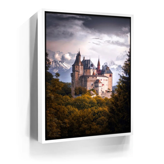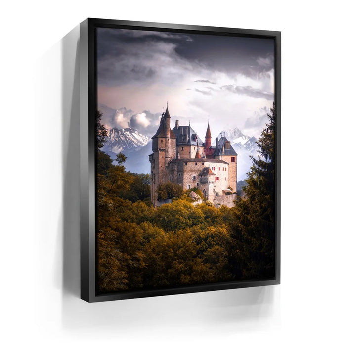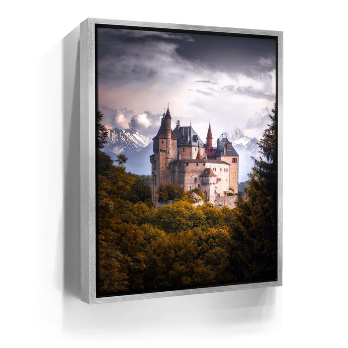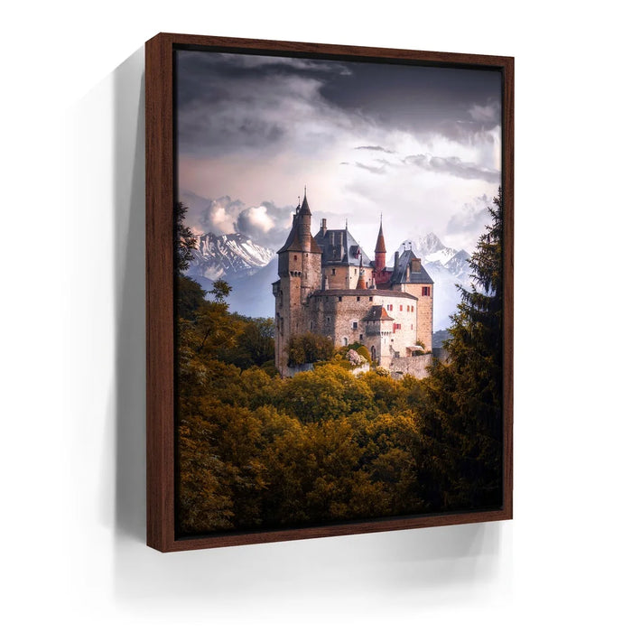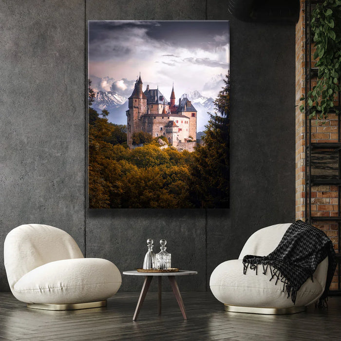 "Alpine Citadel" by Fabio Comparelli captures the majestic beauty of a historic castle nestled in the lush alpine forests, with snow-capped mountains towering in the background. The soft lighting and moody sky give the image a dreamlike quality, evoking a sense of timelessness and mystery. The blend of natural and architectural grandeur makes this a stunning representation of Europe's rich history and breathtaking landscapes.