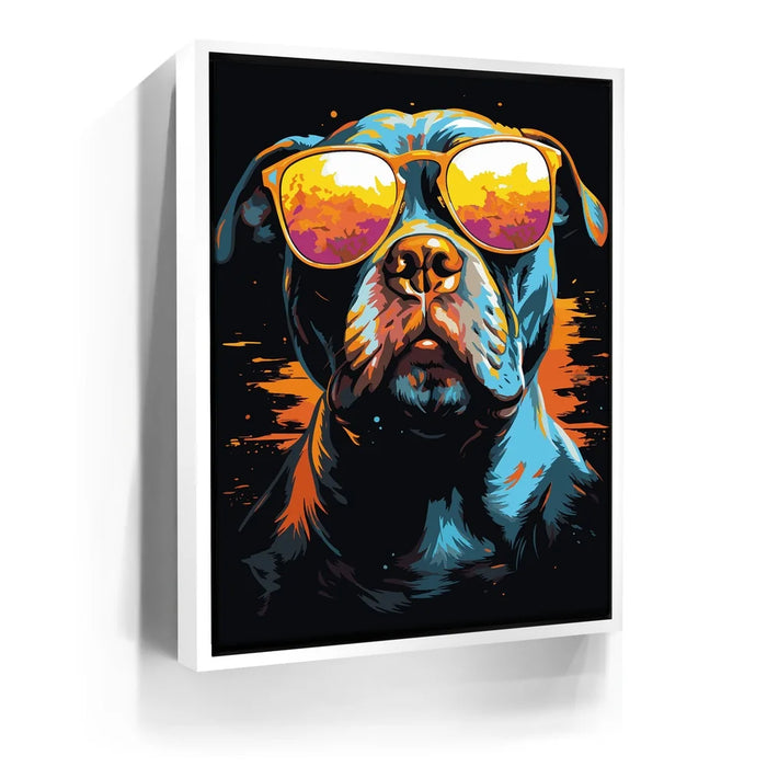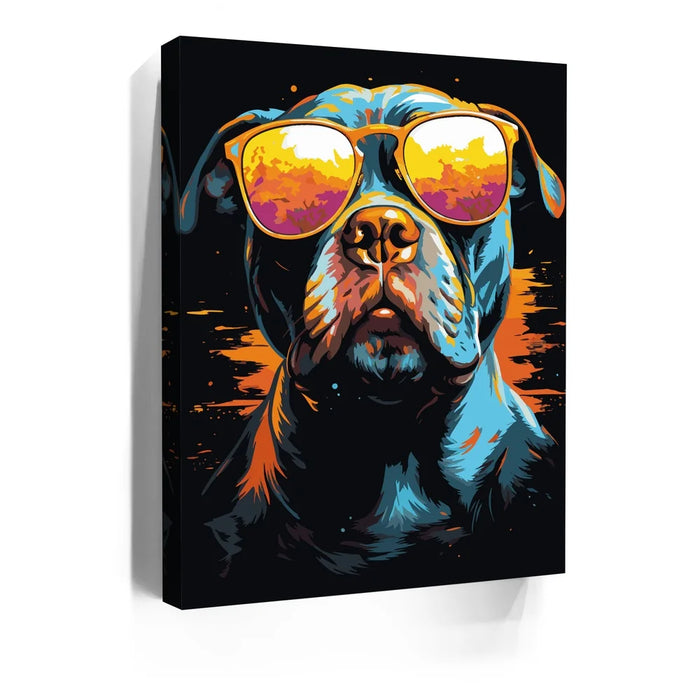 "American Bulldog Rockstar" is a bold and playful tribute to man’s best friend, blending pop art energy with a street-style twist. Featuring a confident American Bulldog in vibrant sunglasses, this colorful dog art canvas bursts with personality, making it perfect for modern dog lovers and fans of expressive wall decor.