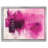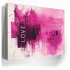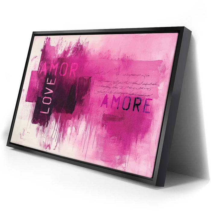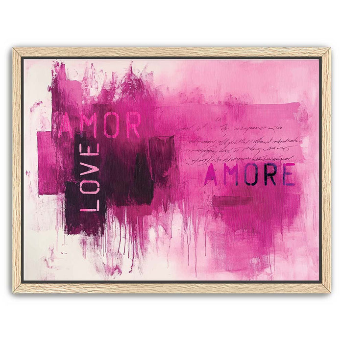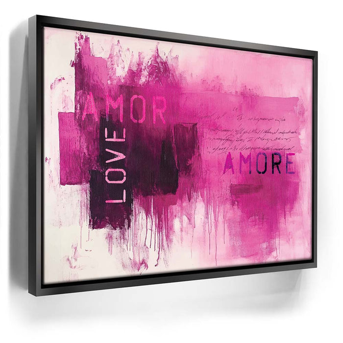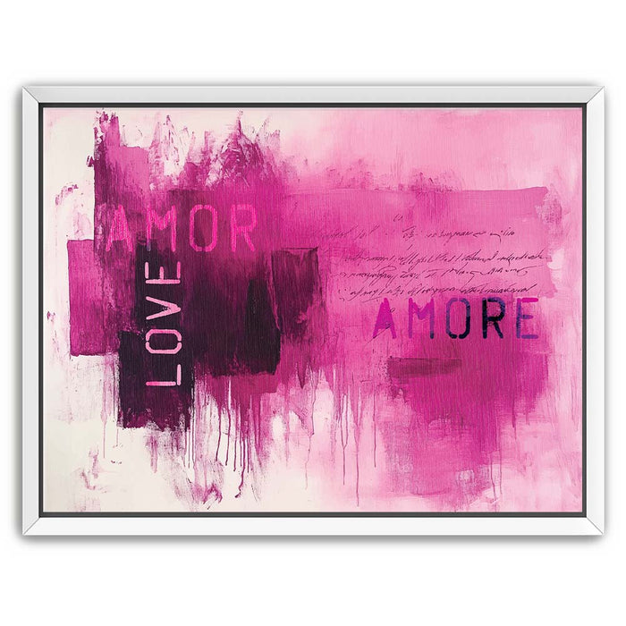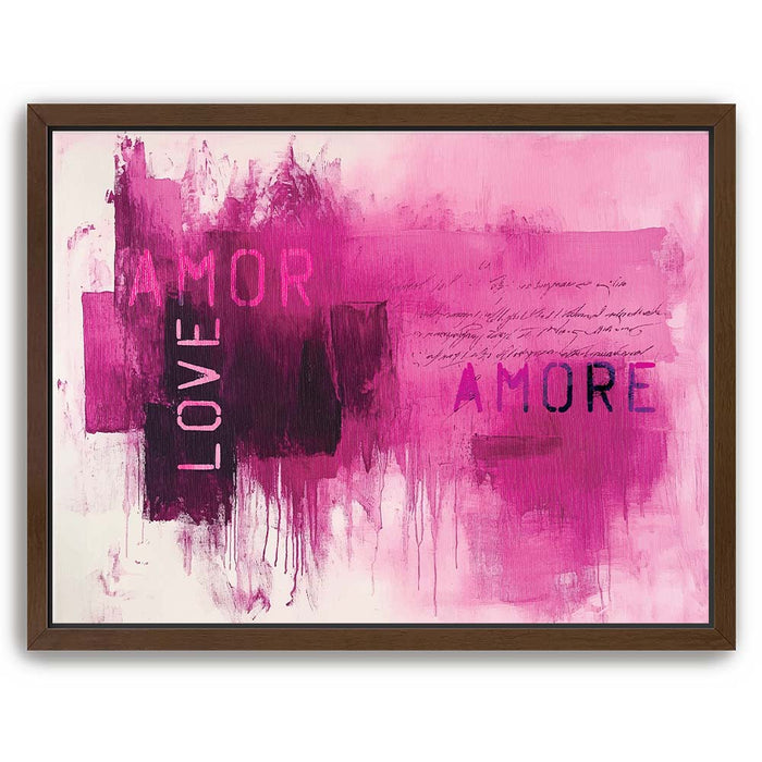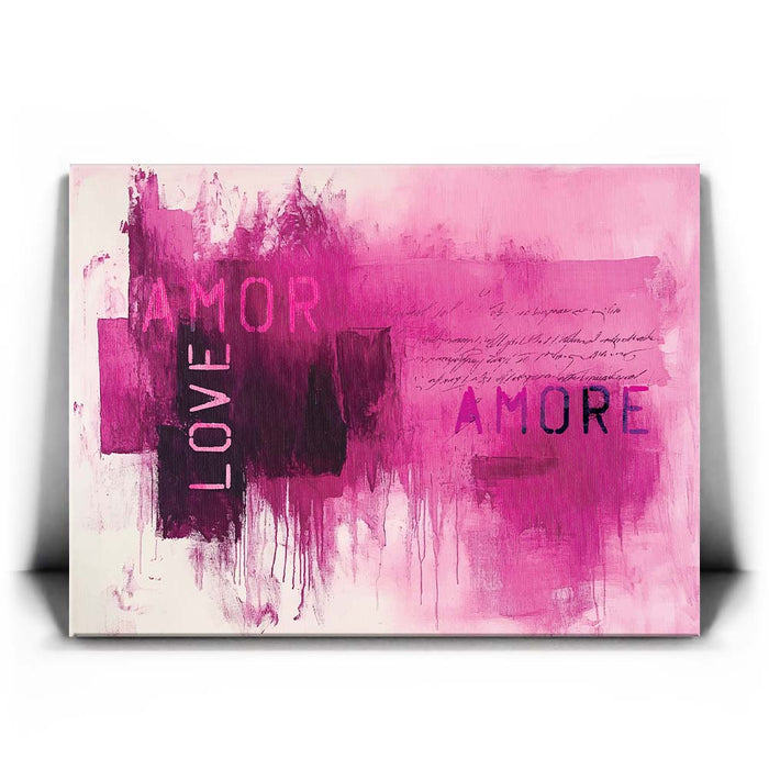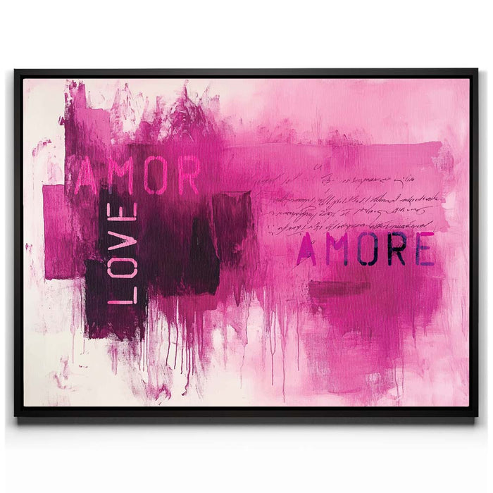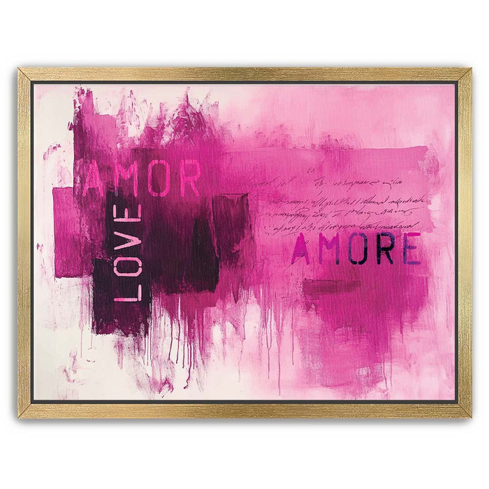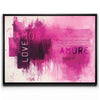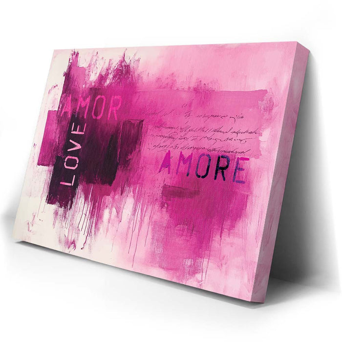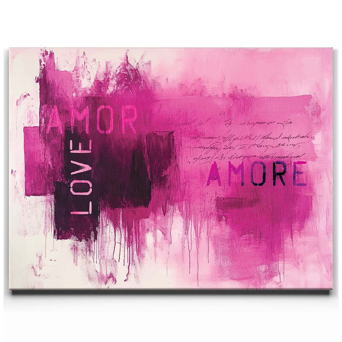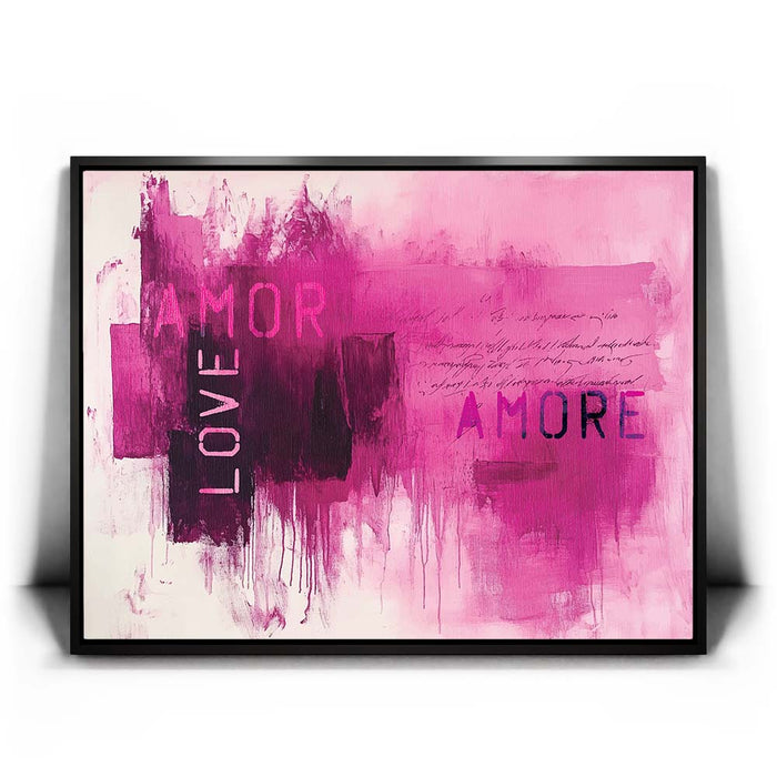 "Amore" is a vibrant mixed-media artwork celebrating love in all its forms and languages. Featuring the words "Love," "Amor," and "Amore" in bold typography, this piece is bathed in passionate shades of pink and magenta. The expressive brushstrokes and textured layers add depth, while faint handwritten script evokes a sense of romantic intimacy.