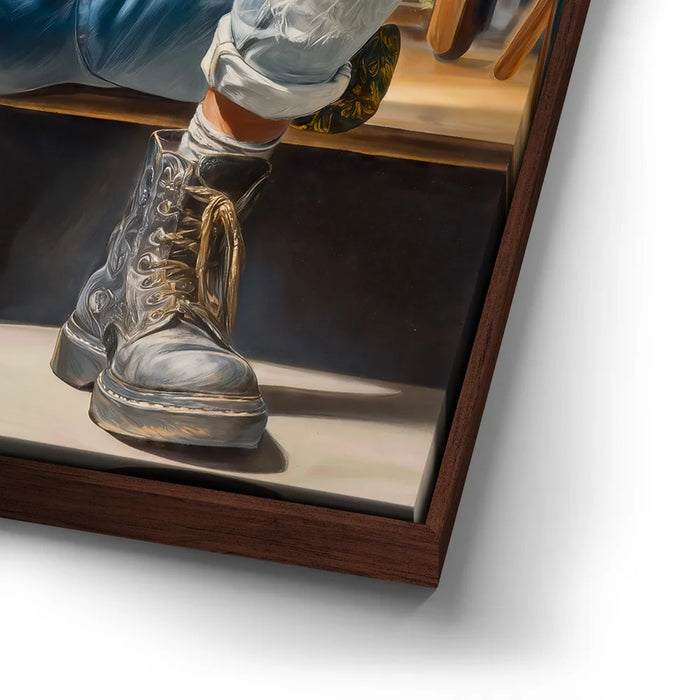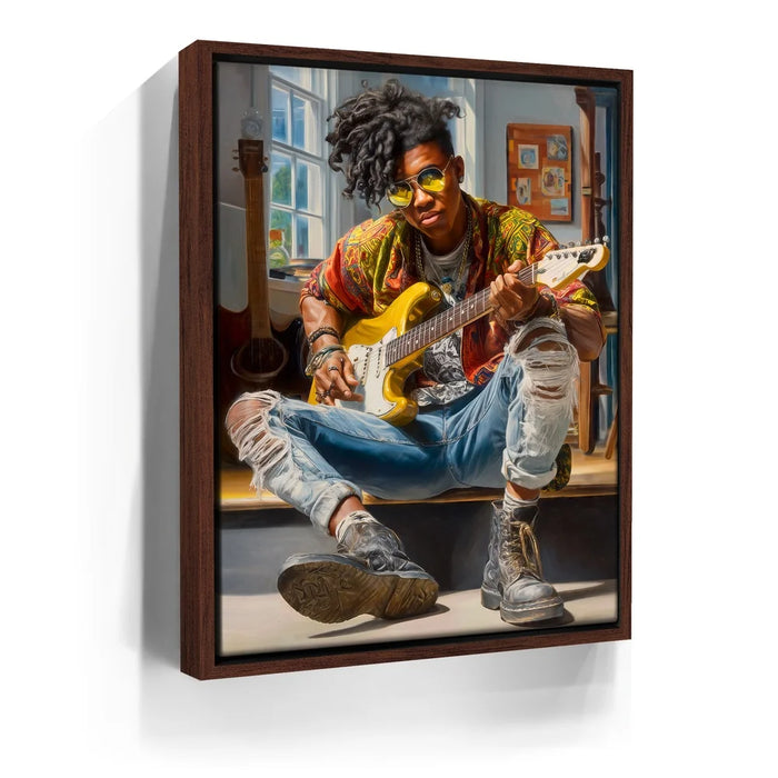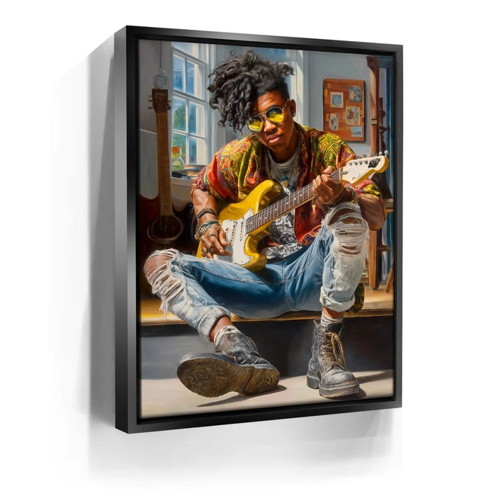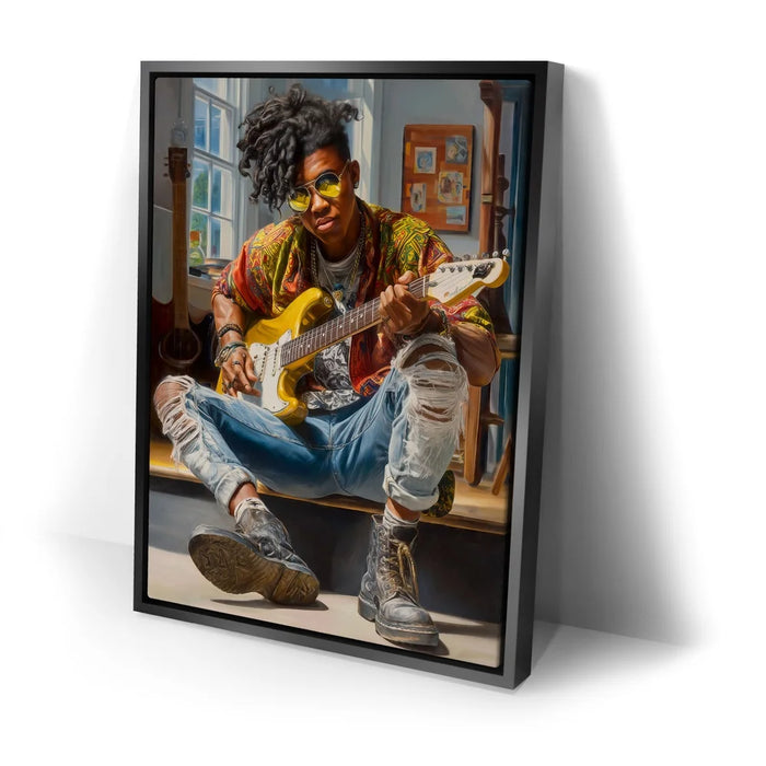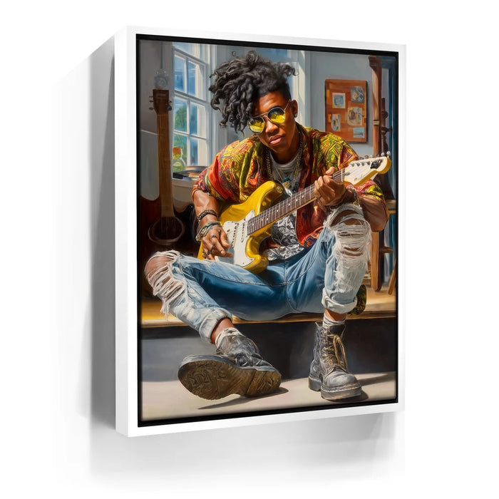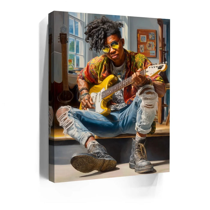 “Amped Soul” by Kandise King hums with energy, color, and unapologetic individuality. The subject—cool, composed, and fully immersed in his music—embodies the rhythm of rebellion and the poetry of self-expression. From the gleam of his yellow guitar to the worn leather of his boots, every texture pulses with life, telling the story of someone who’s lived their art rather than just performed it.