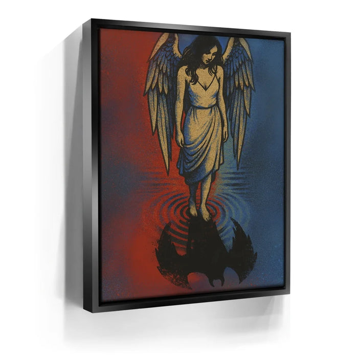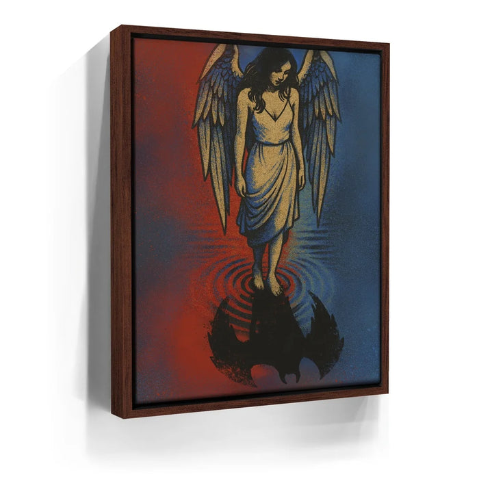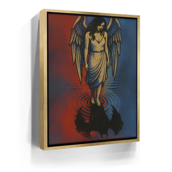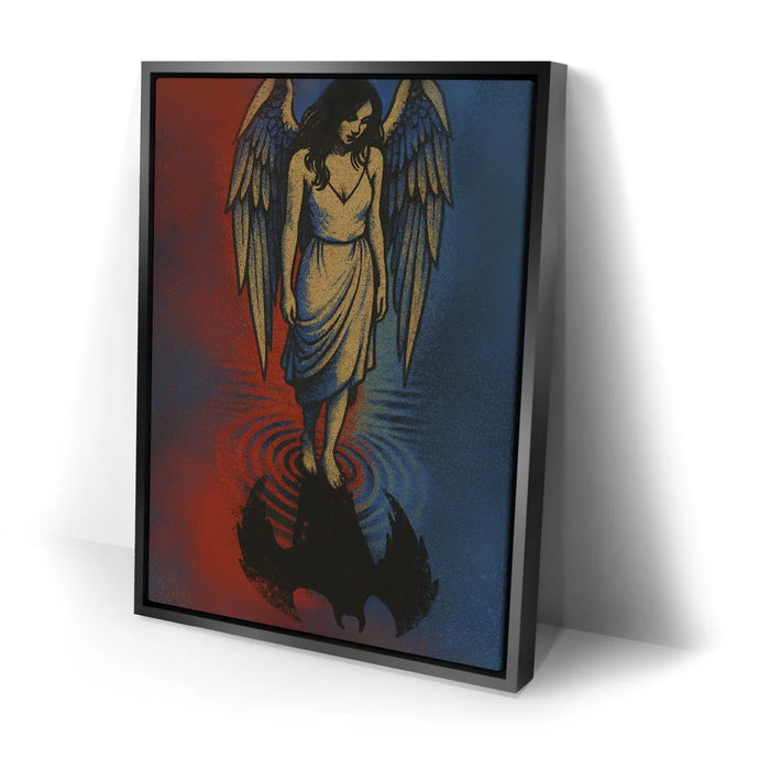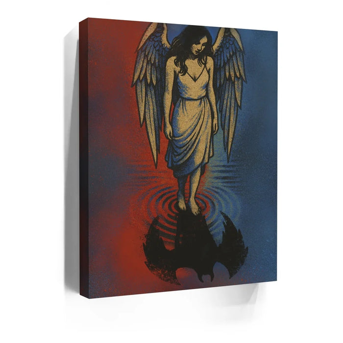 Angel Reflection explores the delicate balance between light and shadow within us all. A serene angel stands at the water’s edge, gazing down to find not her reflection — but that of a dark, winged form beneath the surface. The red and blue tones evoke both fire and calm, heaven and earth, suggesting that purity and imperfection coexist in every soul. This hauntingly beautiful piece invites contemplation, transformation, and the recognition that even in light, darkness has its place.