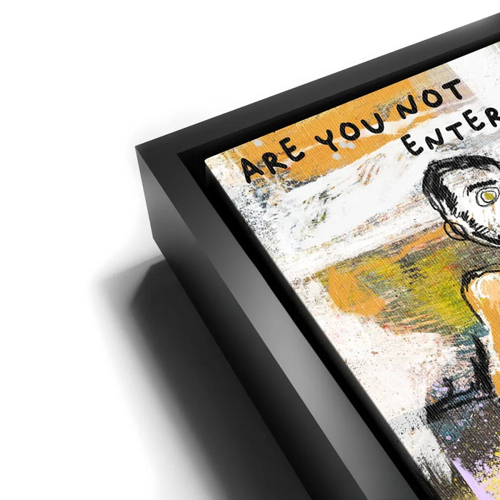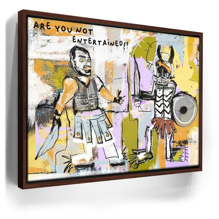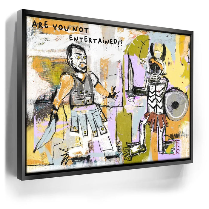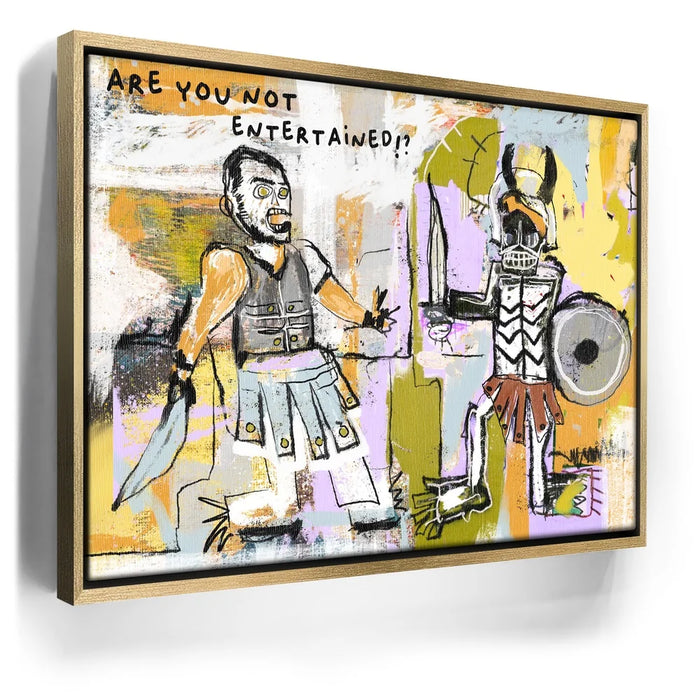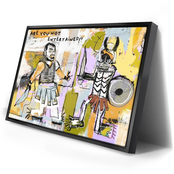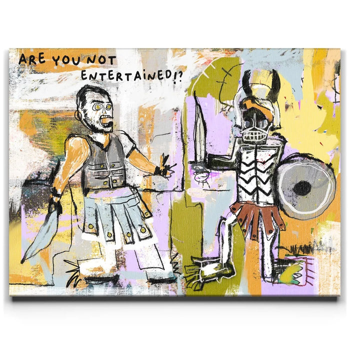 This image features a vibrant and expressive piece of neo-expressionist art inspired by the style of Jean-Michel Basquiat. The scene portrays two gladiators, with one shouting the famous phrase "Are You Not Entertained?!" from Gladiator, giving a nod to Maximus' iconic line. The characters are rendered in a raw, graffiti-like manner, with abstract details and bright, bold colors.