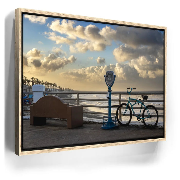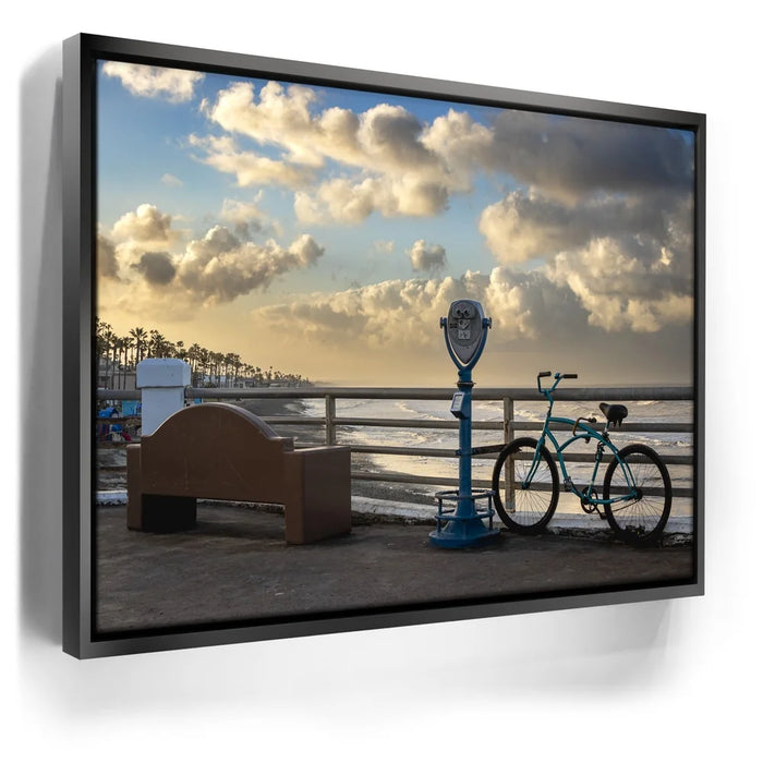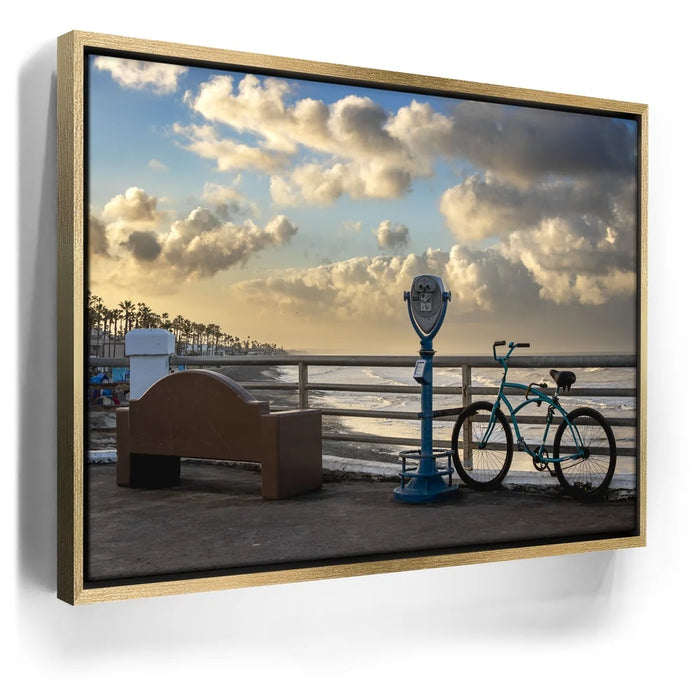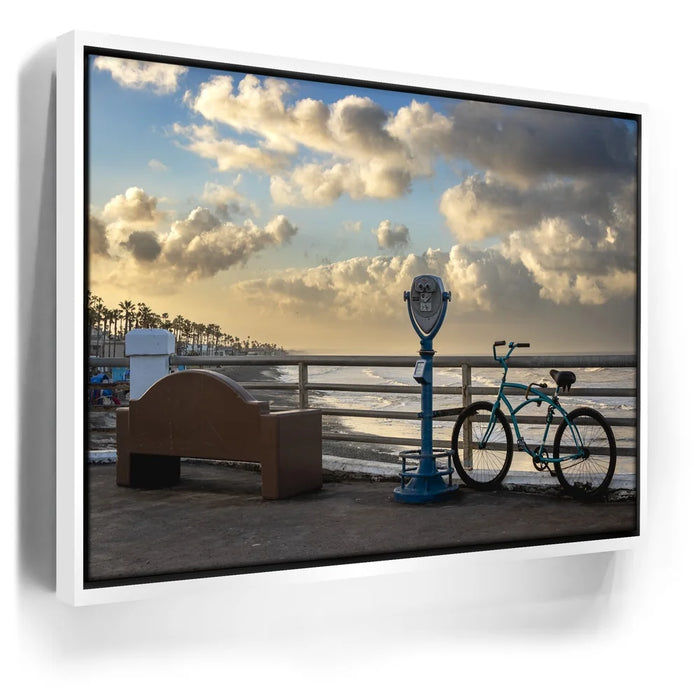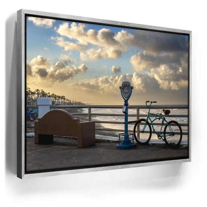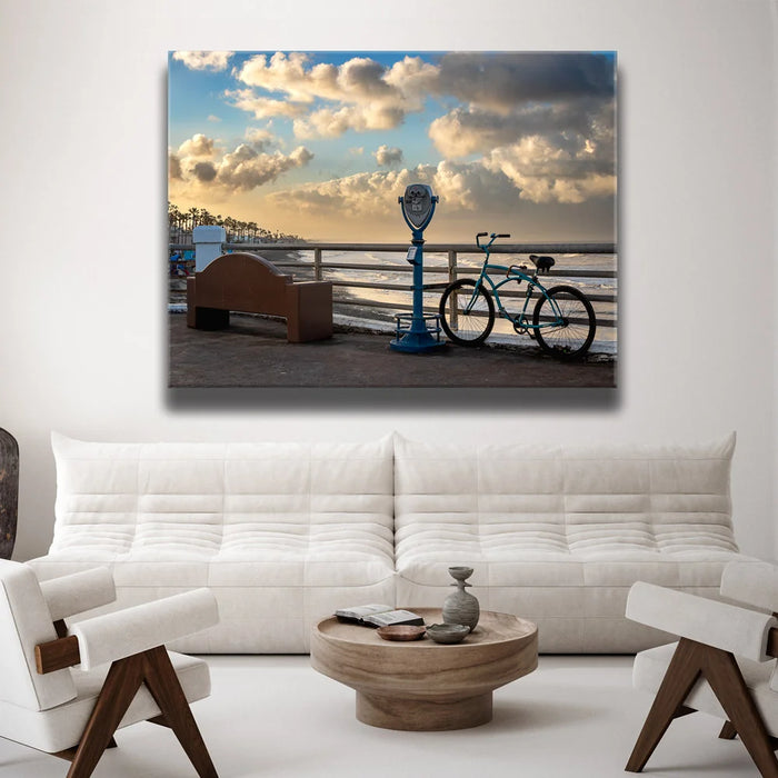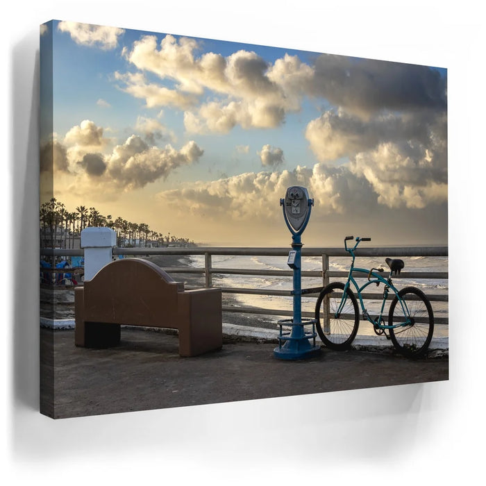 This photograph captures a tranquil beach scene at sunset or sunrise, with soft clouds scattered across the sky. The foreground features a lookout post with a blue bicycle leaning against a railing, adding a nostalgic, calm vibe to the image. The soft lighting of the golden hour illuminates the scene, casting a serene glow on the water and the beach in the background.