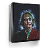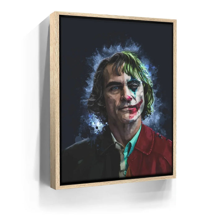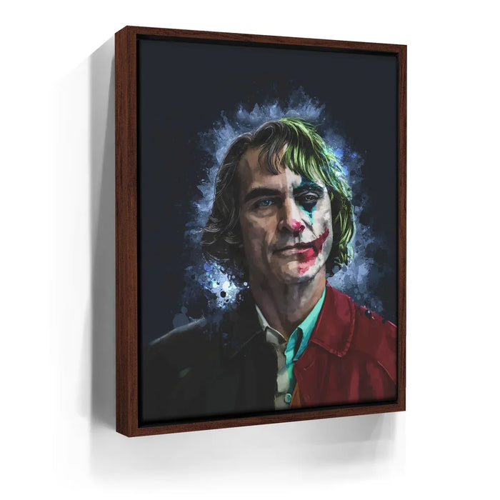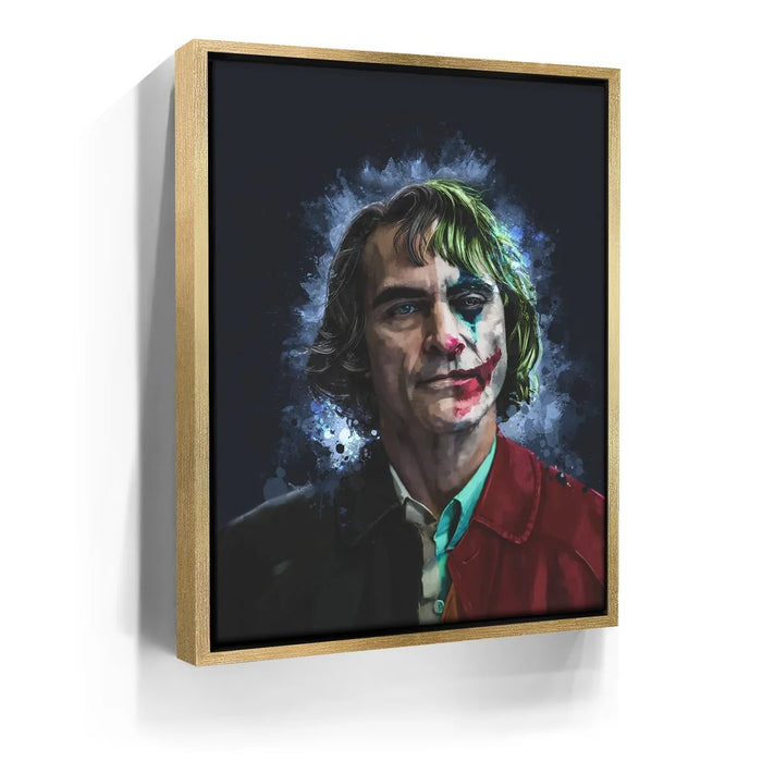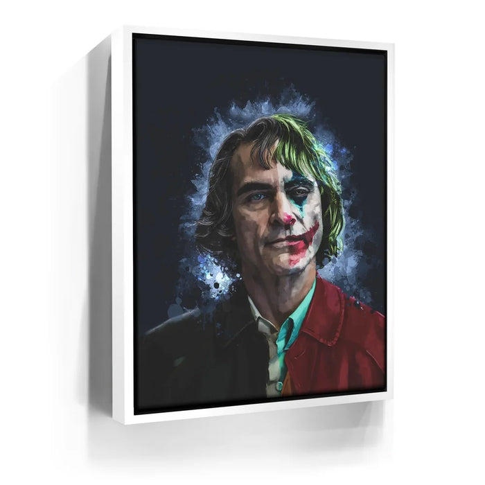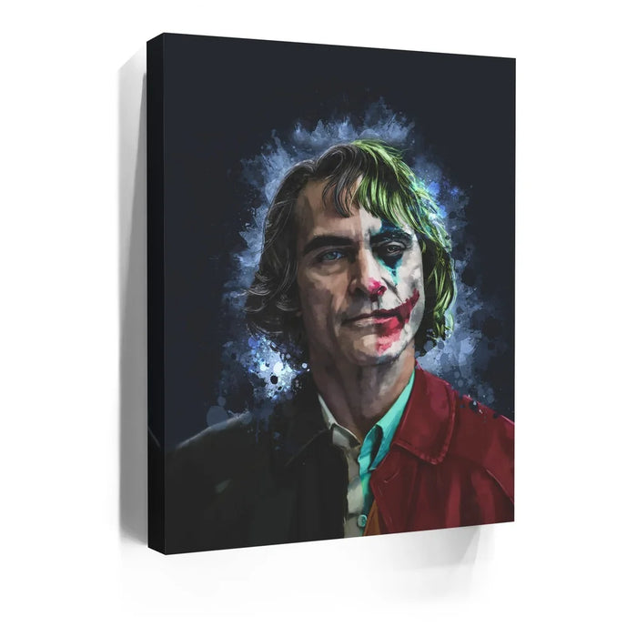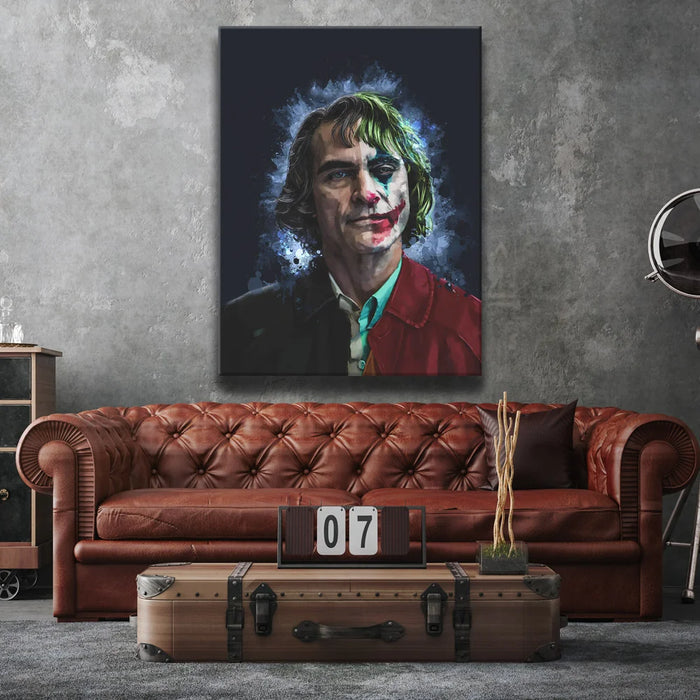 This image features a highly detailed, artistic rendering of Joaquin Phoenix as the Joker. The portrait captures his character, Arthur Fleck, with one side of his face clean, and the other smeared with the iconic Joker makeup—bold colors of red, white, and green splattered across his features.