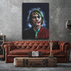 The dark background contrasts with the character’s disheveled hair and piercing eyes, evoking the chaos and intensity that the Joker symbolizes. The mixture of realism and painterly, abstract splashes around his head adds a dynamic and dramatic effect, emphasizing the duality of his character's descent into madness.