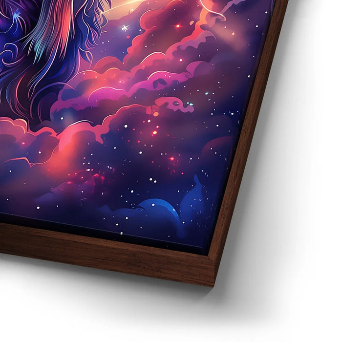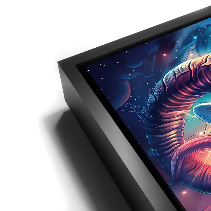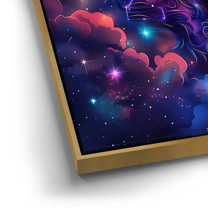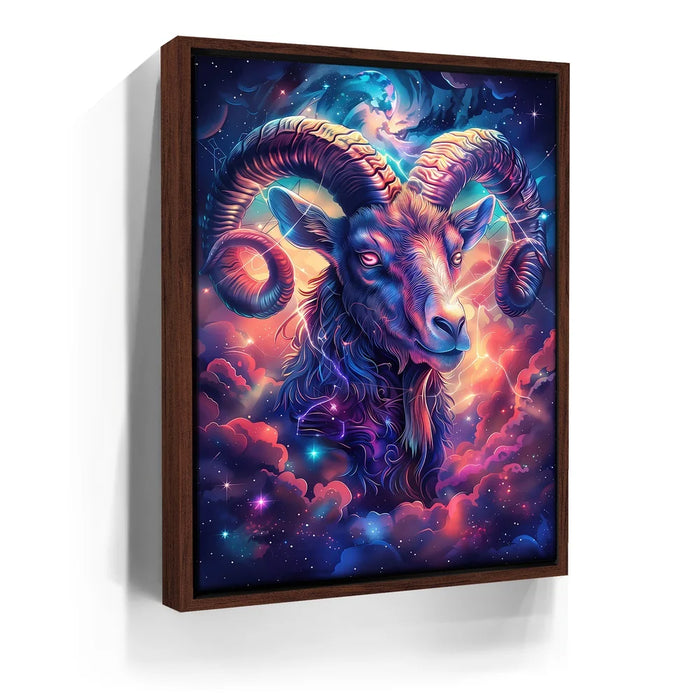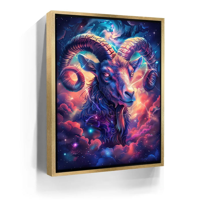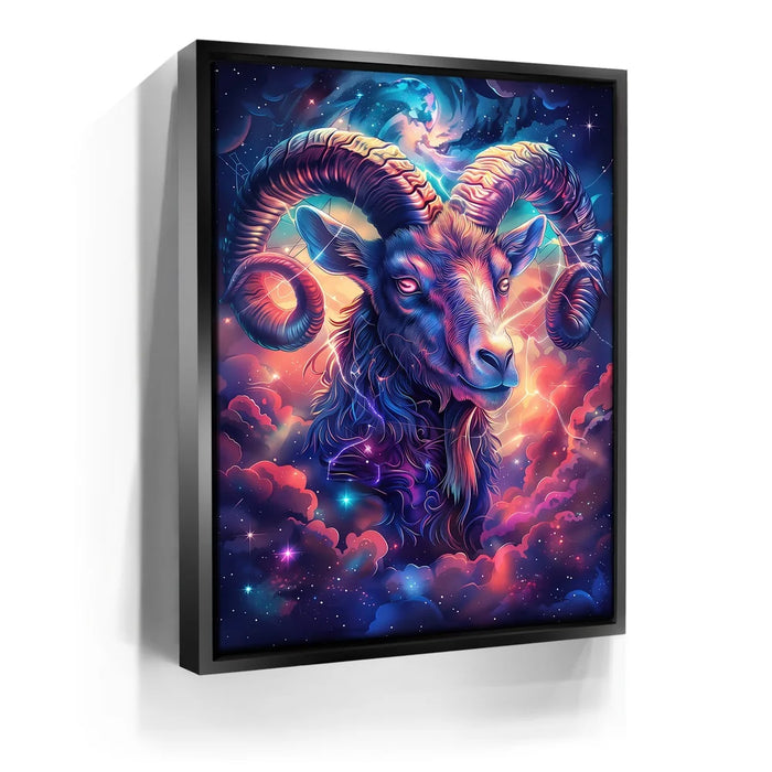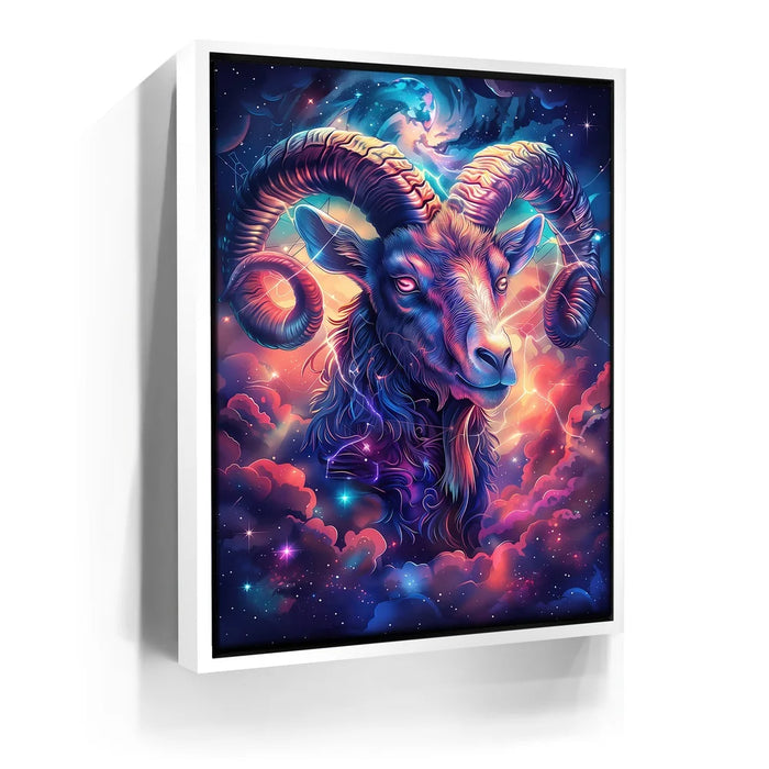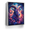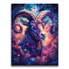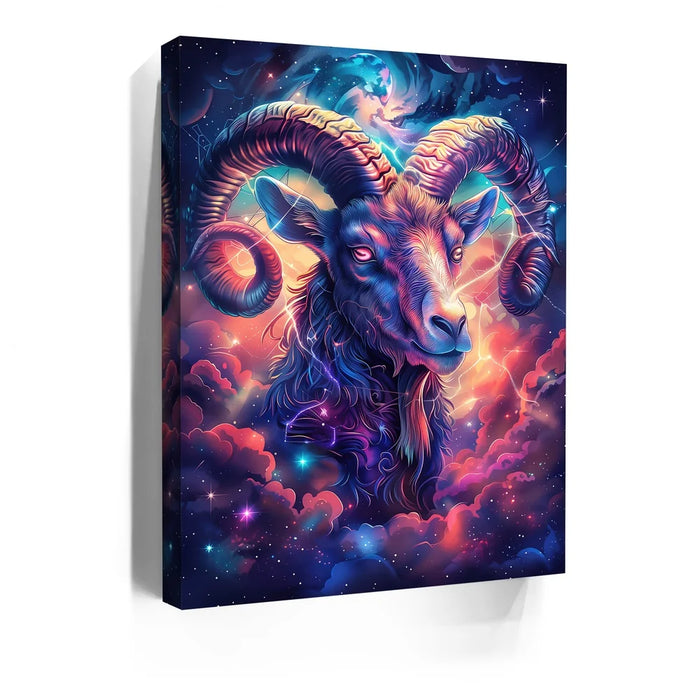 "Astral Capricorn Goat" by Stella Ygris radiates celestial beauty with a masterful depiction of the Capricorn zodiac sign. The artwork features a majestic goat adorned with luminous, curling horns, set against a cosmic background of swirling galaxies, glowing constellations, and vibrant hues of blue, pink, and orange. Capricorn's symbolic constellation intricately weaves through the design, creating a sense of connection to the universe.