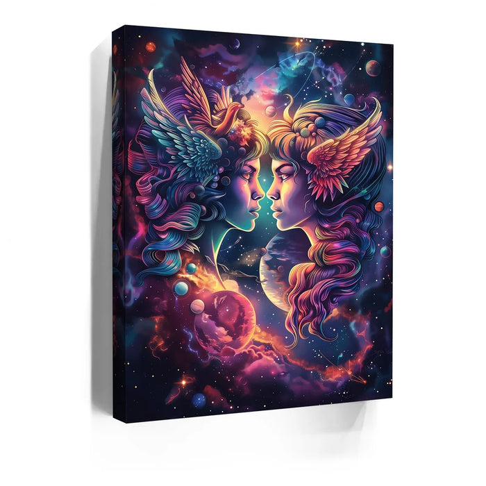 "Astral Gemini Twins" by Stella Ygris is an enchanting depiction of duality and cosmic energy. This vibrant artwork portrays the iconic Gemini twins, their celestial profiles framed by flowing, rainbow-hued hair and adorned with ethereal wings. Surrounded by a cosmic backdrop filled with glowing planets, swirling galaxies, and starry accents, the piece radiates a harmonious blend of mysticism and astrology.