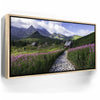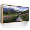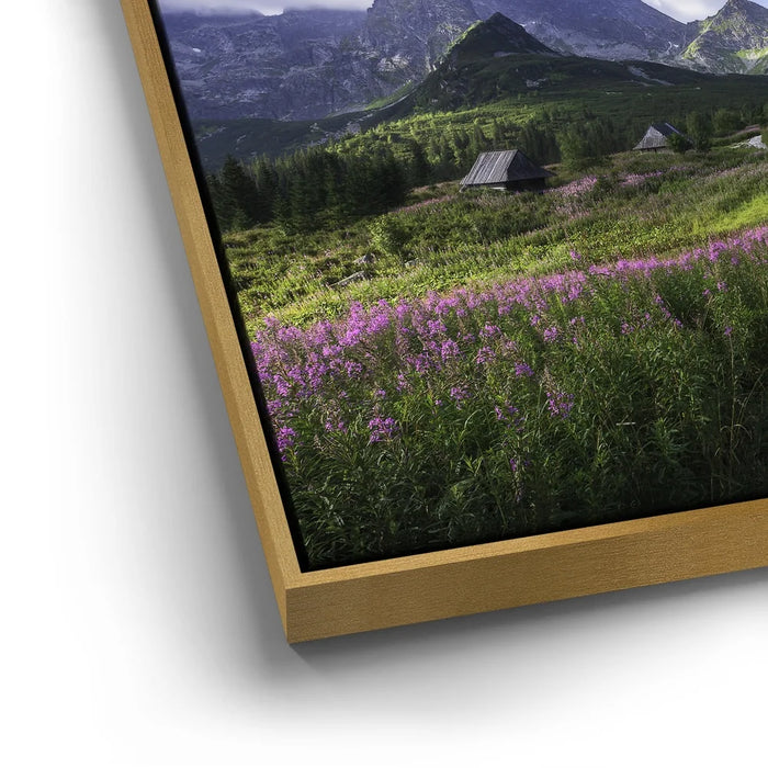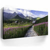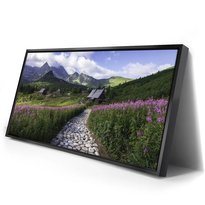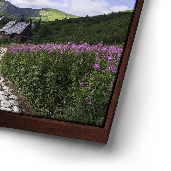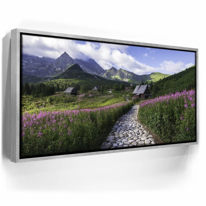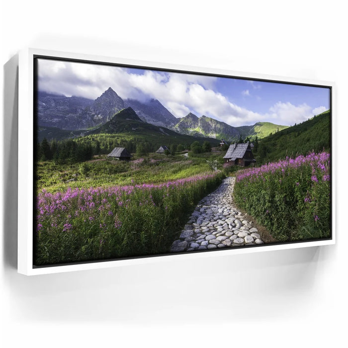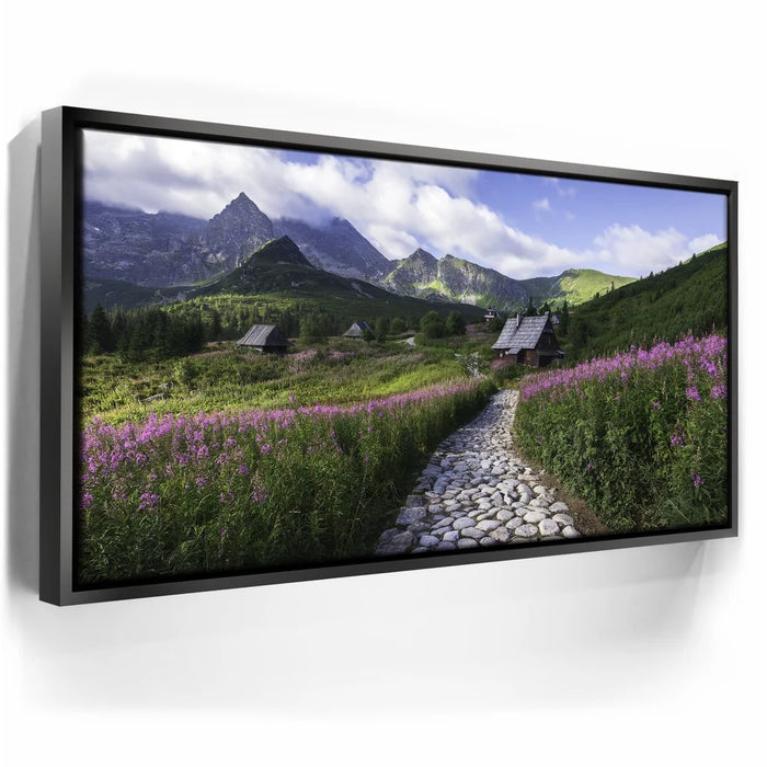 "Autumn Cabins In The Tatras" by Marcin Zajac captures the idyllic beauty of a mountain valley in the Tatra Mountains. A cobblestone path leads through vibrant fields of pink wildflowers towards rustic wooden cabins, nestled against a backdrop of towering, sunlit peaks. The soft lighting and lush greenery create a tranquil and inviting atmosphere, reflecting the serene charm of mountain life.