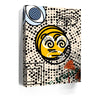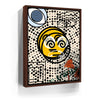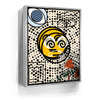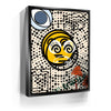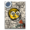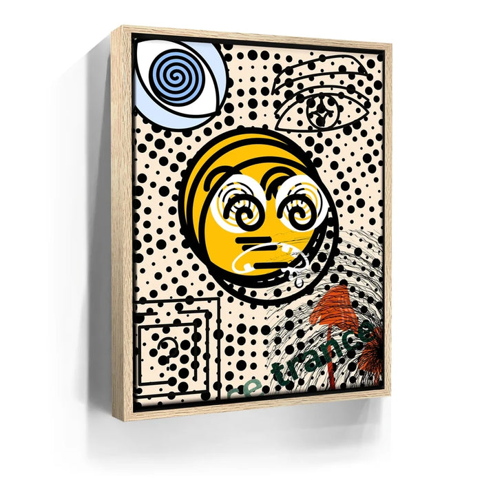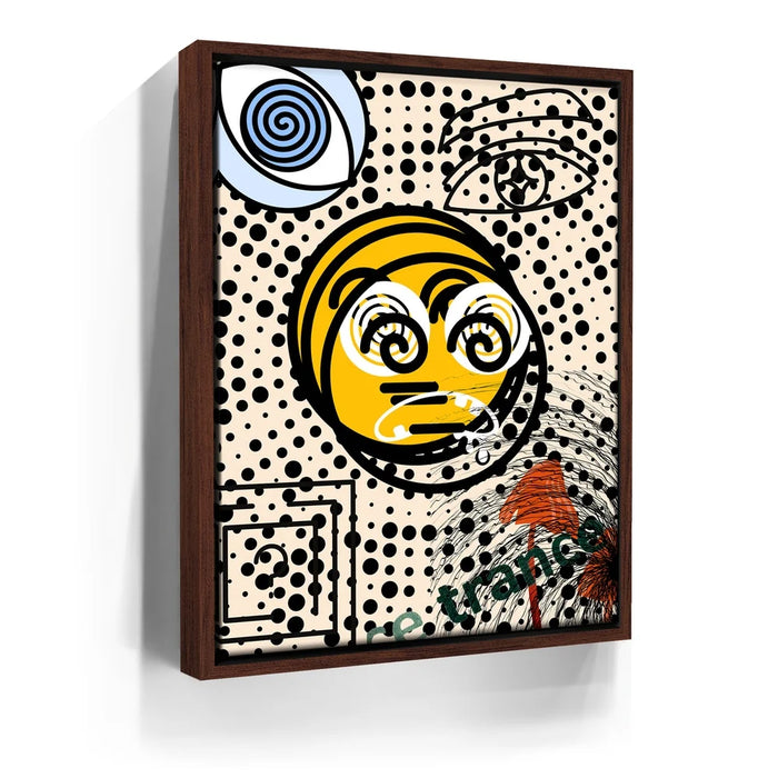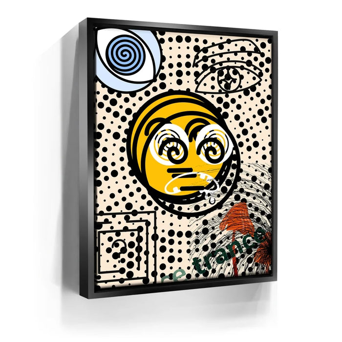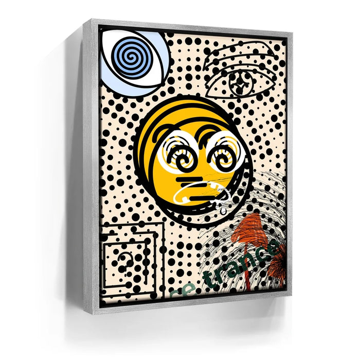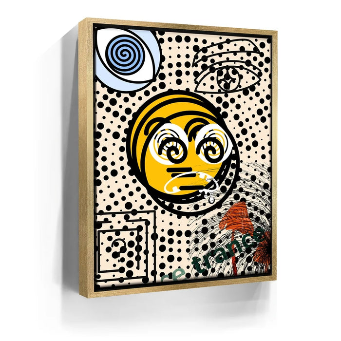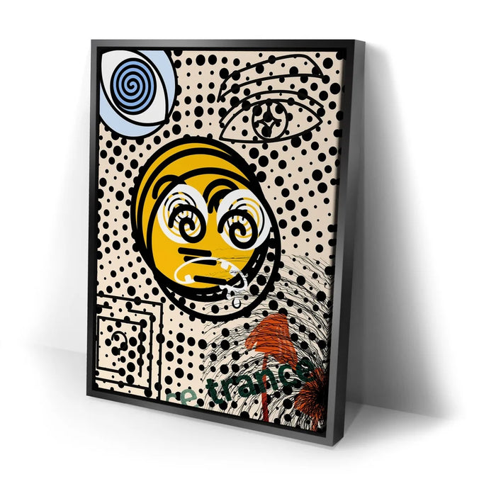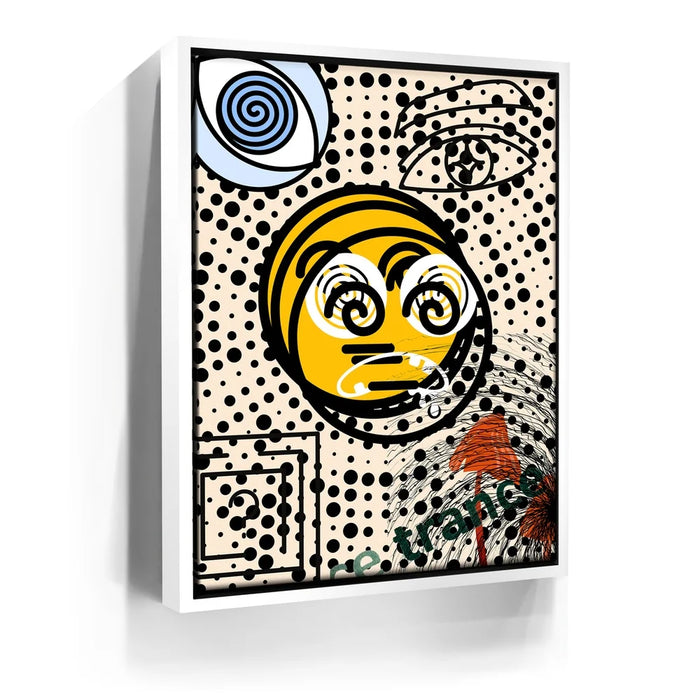 "Awakening Feeling" by George Rosaly is a bold and colorful abstract piece that combines a hypnotized smiley face with swirling patterns and vibrant dots. The dizzying spirals in the eyes and chaotic lines evoke a sense of confusion or trance, while elements like mushrooms and abstract eyes add layers of surrealism.
