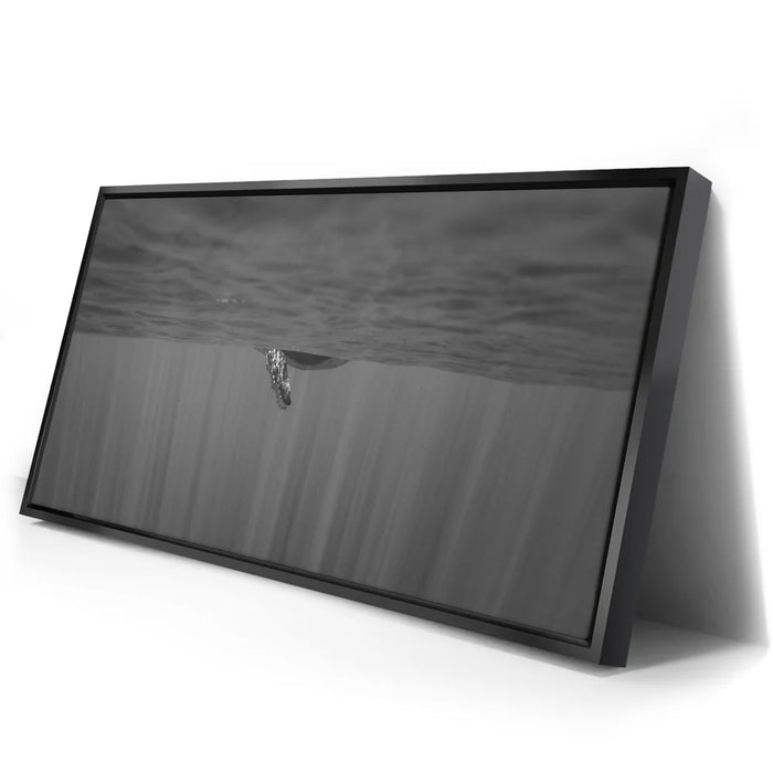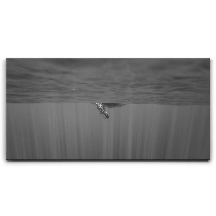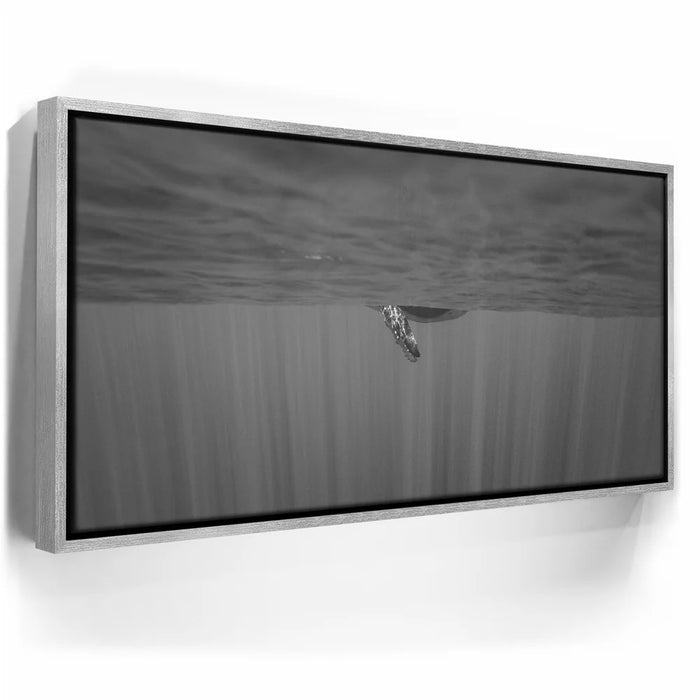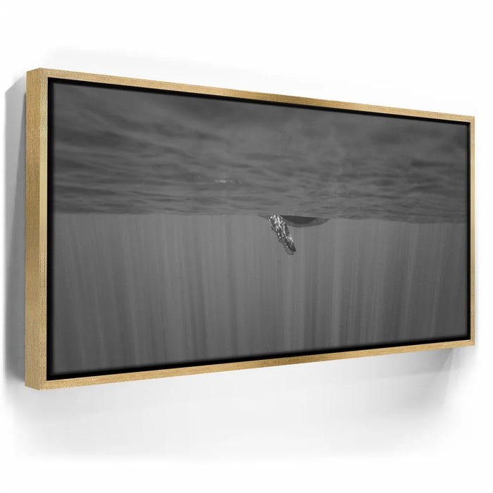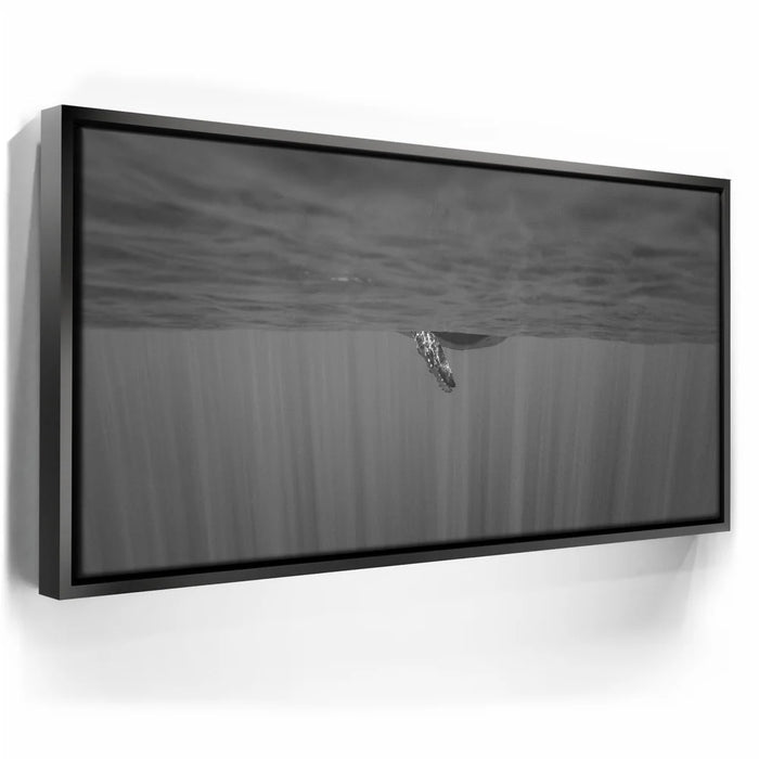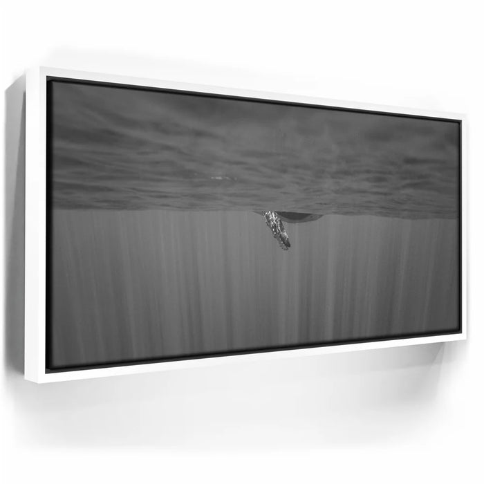 "Baby Belly B&W" by Thaís Mendonça captures the mesmerizing moment of a young humpback whale gently floating beneath the surface of Tahiti's tranquil waters. Rendered in monochrome, this underwater photograph accentuates the textures and shadows, evoking a sense of serenity and wonder for marine life in its natural habitat.