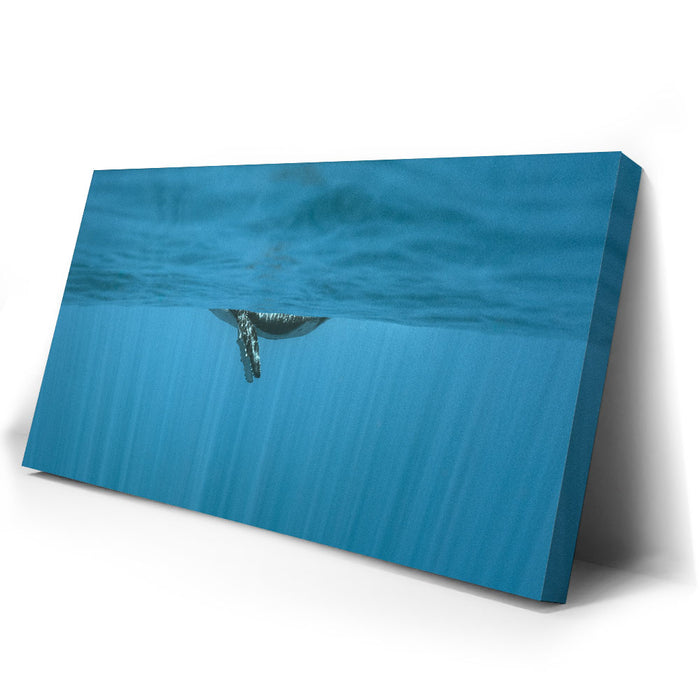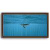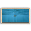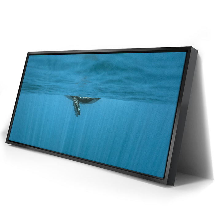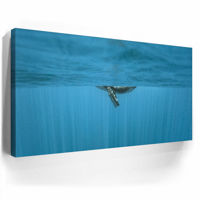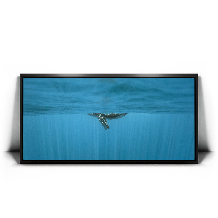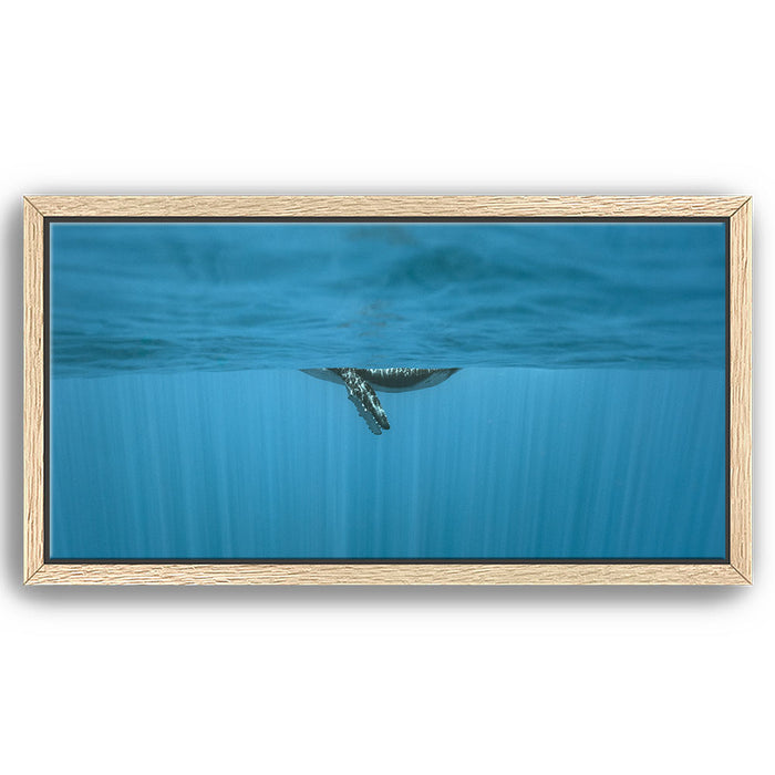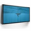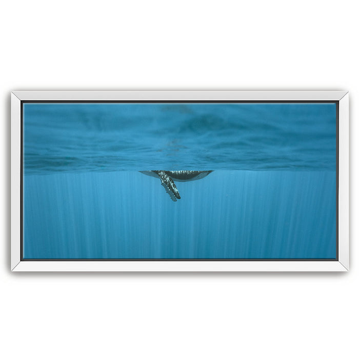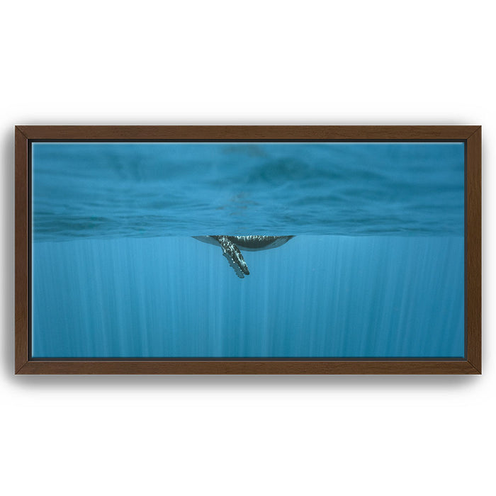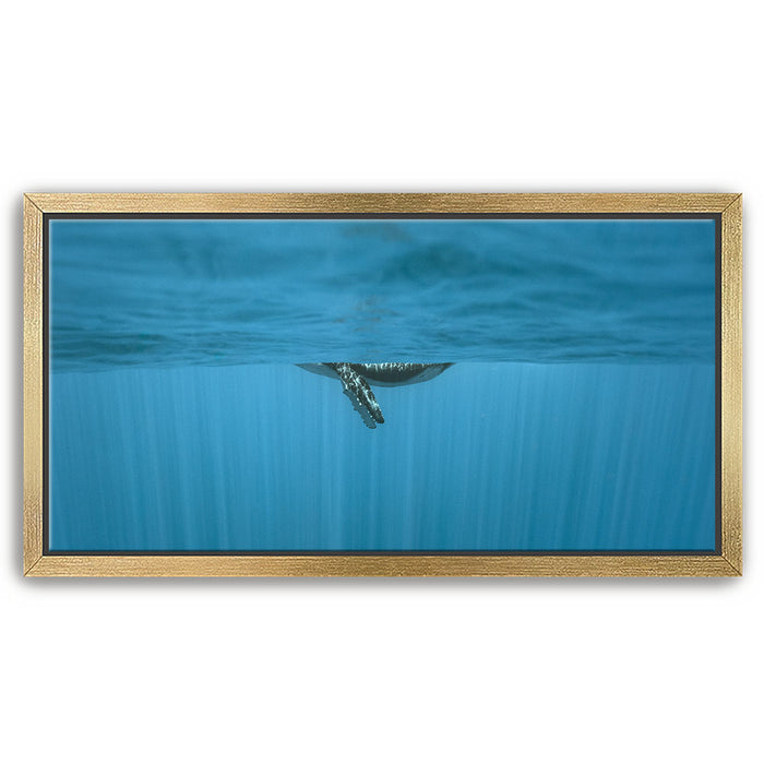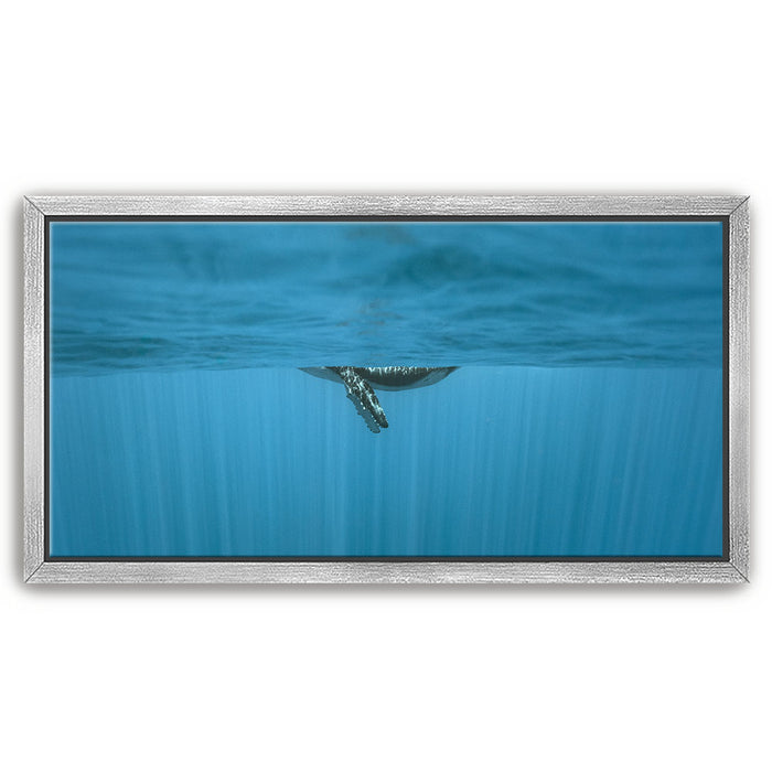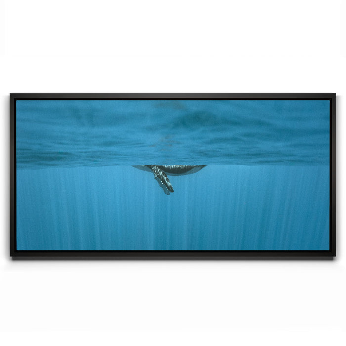 "Baby Belly Blue" by Thaís Mendonça showcases the serene silhouette of a young humpback whale floating just beneath the surface in the vibrant blue waters of Tahiti. This breathtaking underwater photograph highlights the tranquility of marine life and the captivating beauty of the ocean's depths.