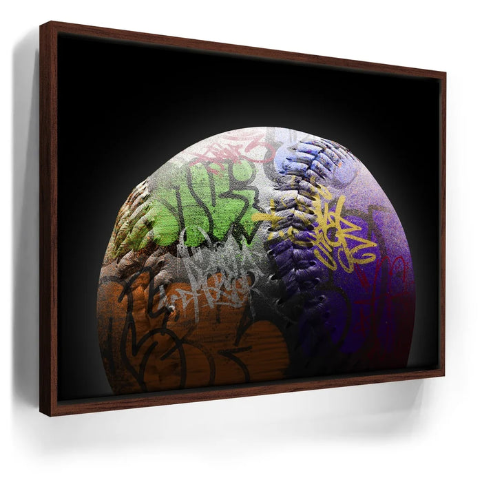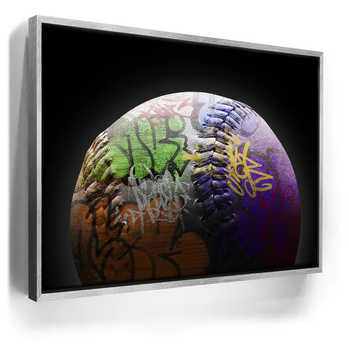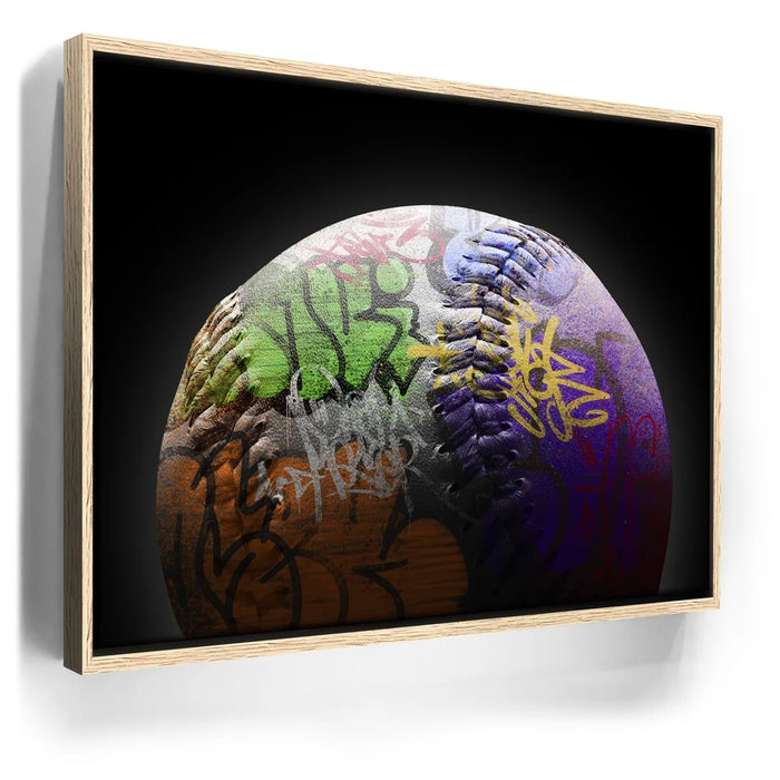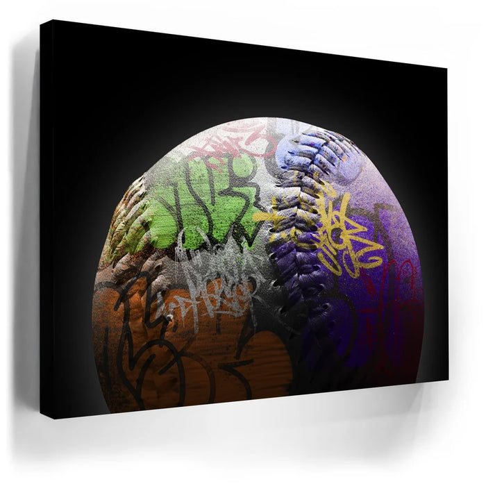 “Baseball Graffiti – Colorful” transforms a familiar symbol of sport into a raw emblem of culture and rebellion. The weathered leather surface of the baseball becomes a canvas, drenched in a vibrant collision of tags, sprays, and layered scrawls. Greens, yellows, purples, and reds pulse across its seams, each mark shouting identity and defiance in a space usually reserved for uniformity. What was once a clean object of order and rules now feels alive, unpredictable, and urban—bridging two worlds that rarely collide.