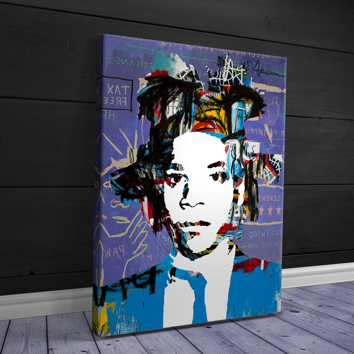 Introducing "Basquiat Tribute", a dynamic portrait that blends elements of neo-expressionism, stencil, and graffiti in tribute to the legendary style of Jean-Michel Basquiat. Featuring a bold palette of purple, orange, blue, and black, this painting captures the raw energy and cultural commentary of Basquiat's work. With influences from posterized and graphic art styles, the piece embodies the rebellious and thought-provoking spirit of street art. Ideal for contemporary art lovers, "Basquiat Tribute" is a powerful addition to any space, combining the boldness of typography and the expressive nature of graffiti. Perfect for those inspired by the work of Basquiat, this colorful piece makes a statement in any living room or gallery space.