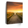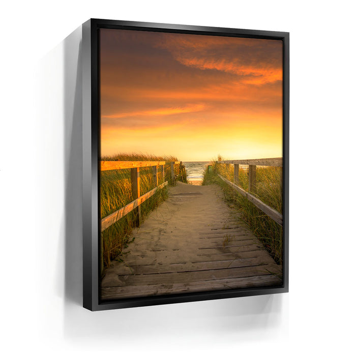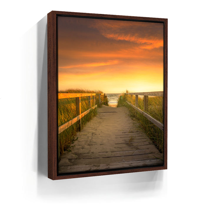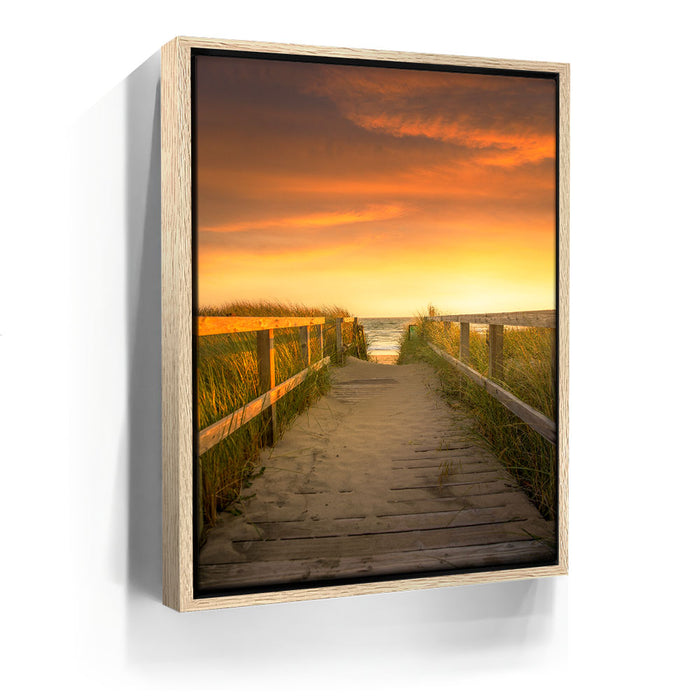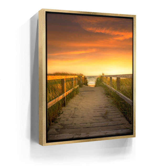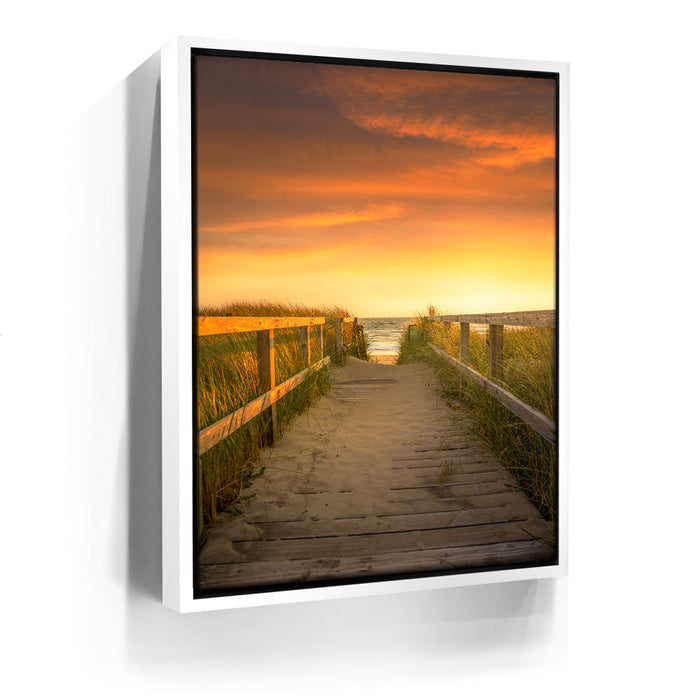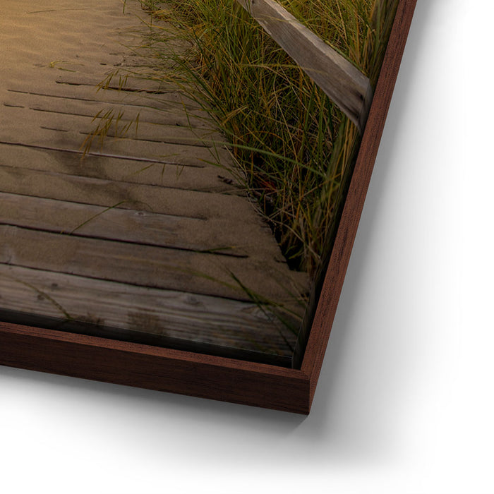 “Beachward” by 11th Dimension invites viewers down a tranquil boardwalk path as golden-hour light bathes the scene in soft, sun-kissed tones. This stunning coastal photograph captures the peaceful transition between land and sea, with warm dune grass swaying gently on either side, guiding your eyes toward the ocean horizon just beyond reach.