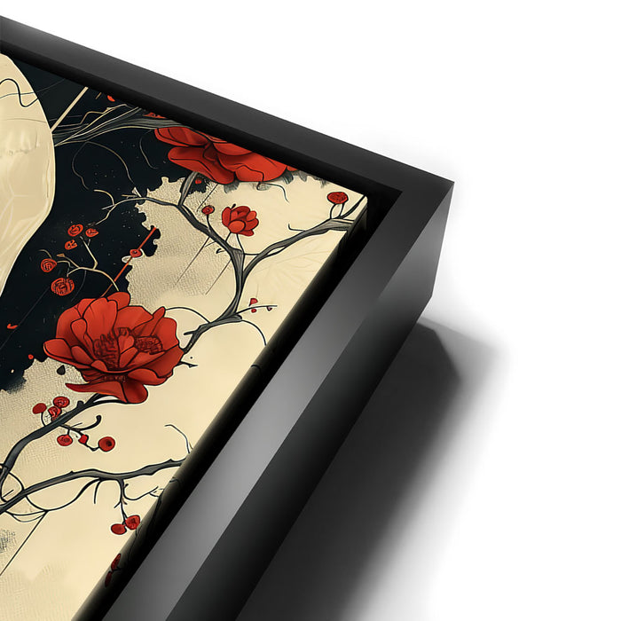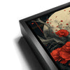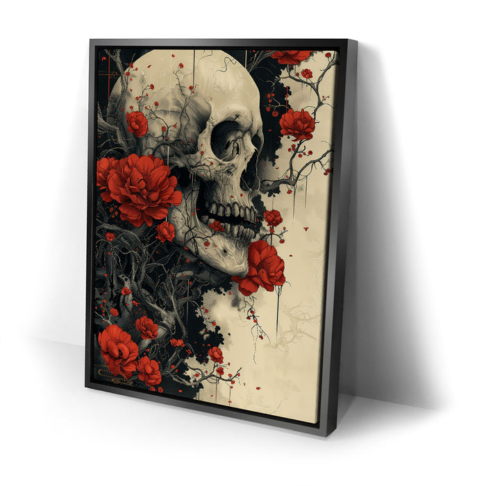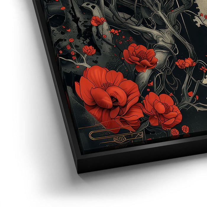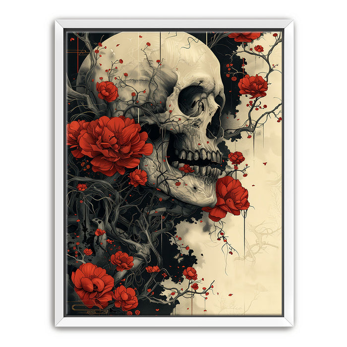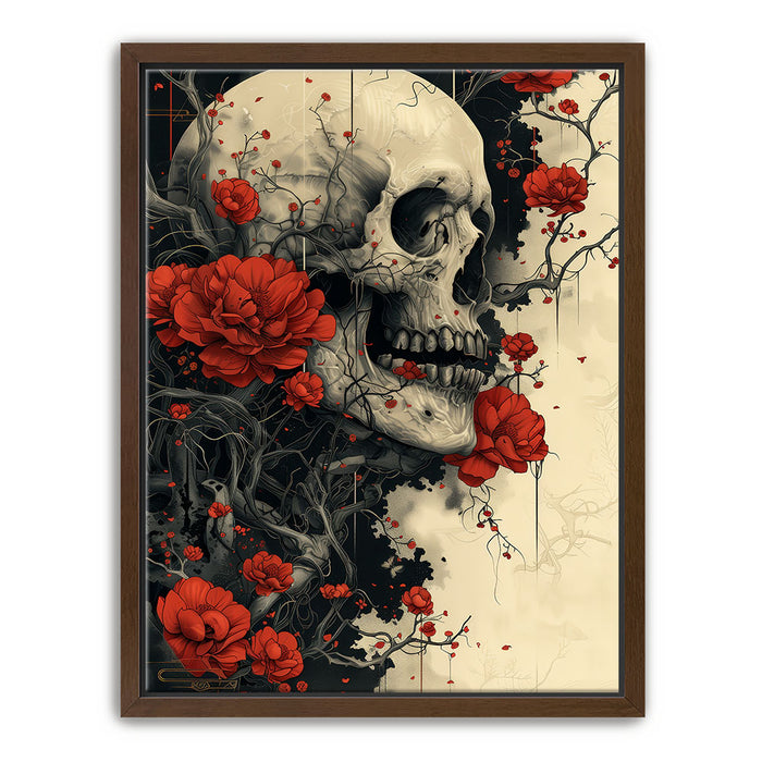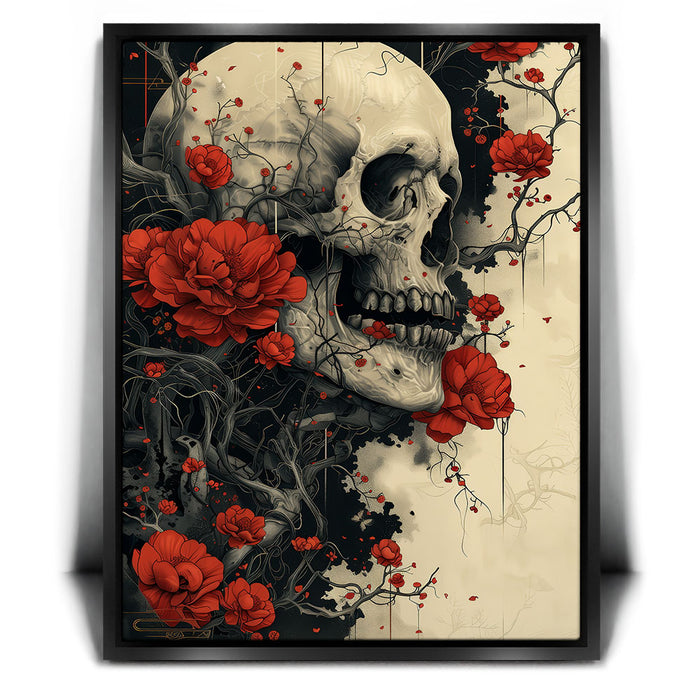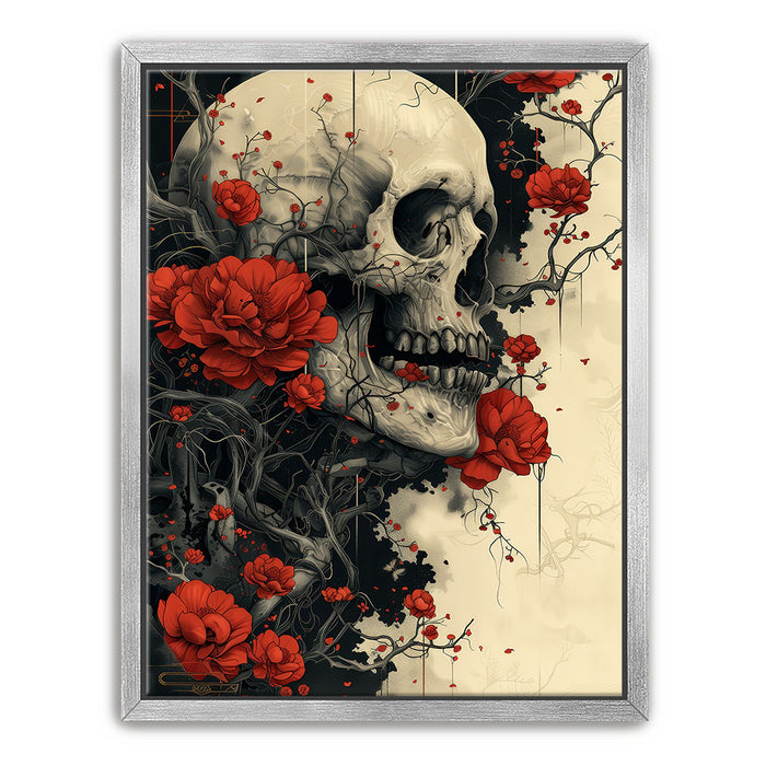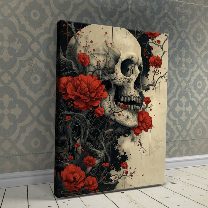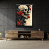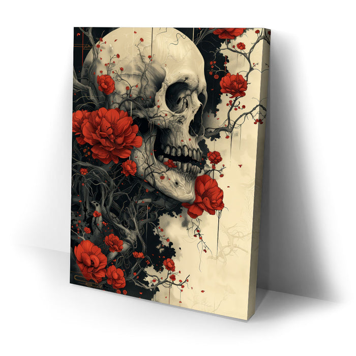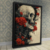 The deep red hues of the roses contrast starkly with the pale bone structure of the skull, creating a powerful visual that draws the eye into the piece’s dark and mysterious atmosphere. This haunting yet beautiful composition is a perfect blend of the macabre and the elegant, making it an evocative statement piece.
