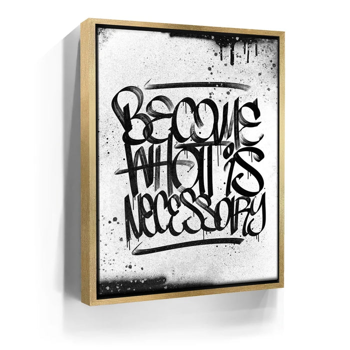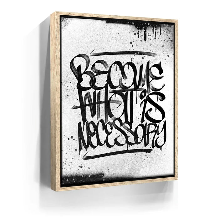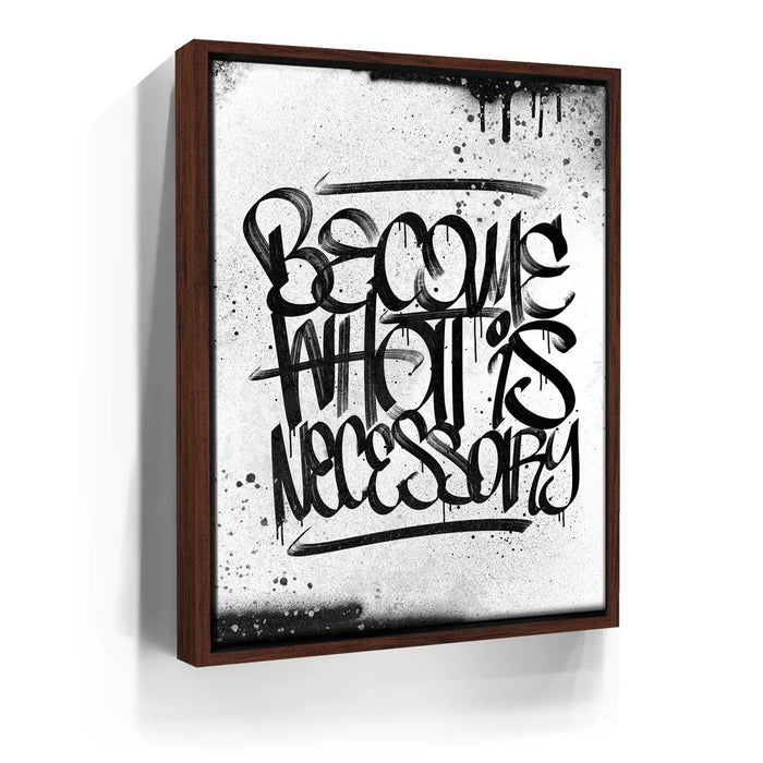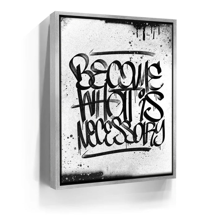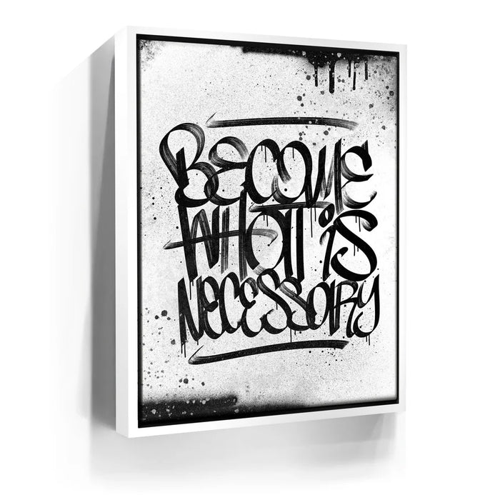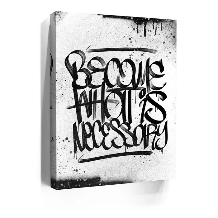 “Become What Is Necessary” captures the raw urgency of transformation through bold, graffiti-style calligraphy. The dripping black strokes and splattered texture give the piece a gritty, street-born authenticity—each letter carrying the weight of survival, defiance, and self-determination. It’s a statement of evolution, urging the viewer to adapt, rise, and redefine themselves when the world demands it.