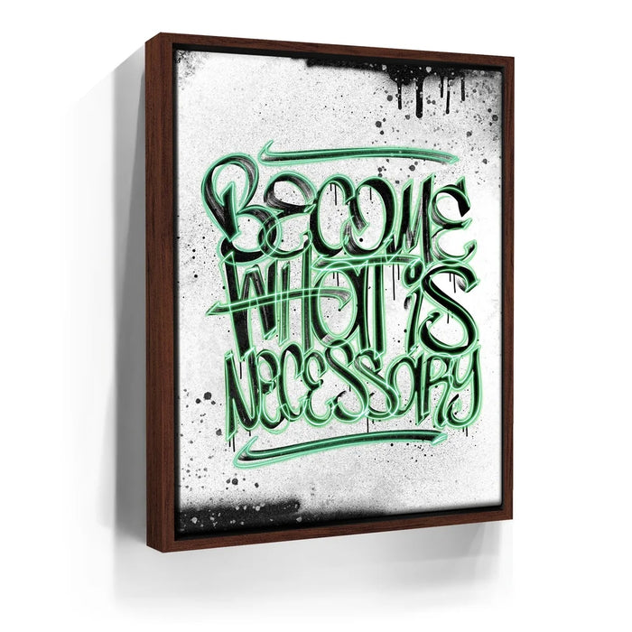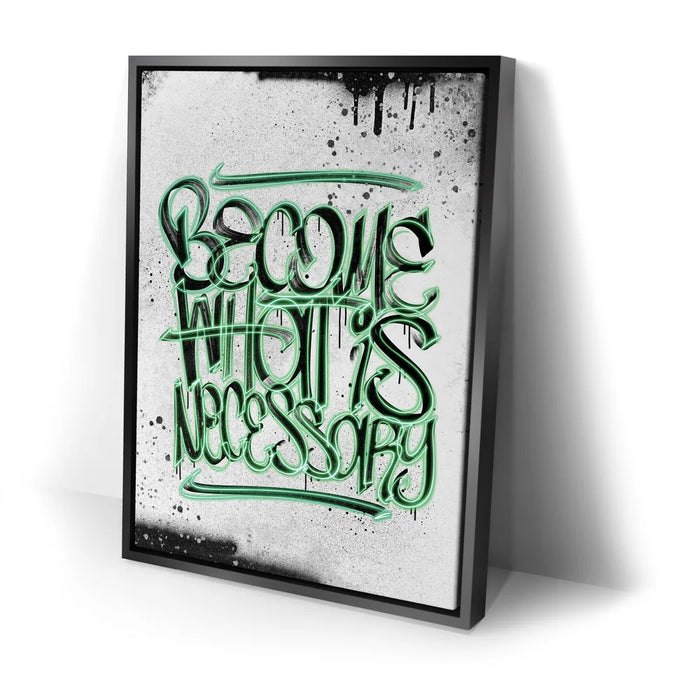 Become What Is Necessary – Calligraphy – Green is an electrifying piece of motivational wall art that fuses graffiti-inspired lettering with bold, modern energy. The vivid neon-green outline glows against a gritty monochrome background, symbolizing strength, action, and resilience. This artwork’s empowering message challenges you to adapt, evolve, and push forward — no matter the odds.