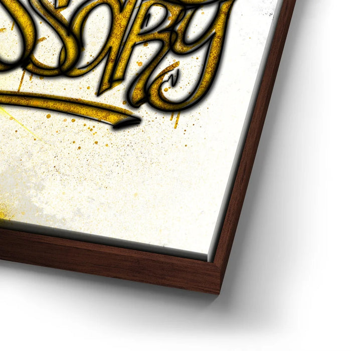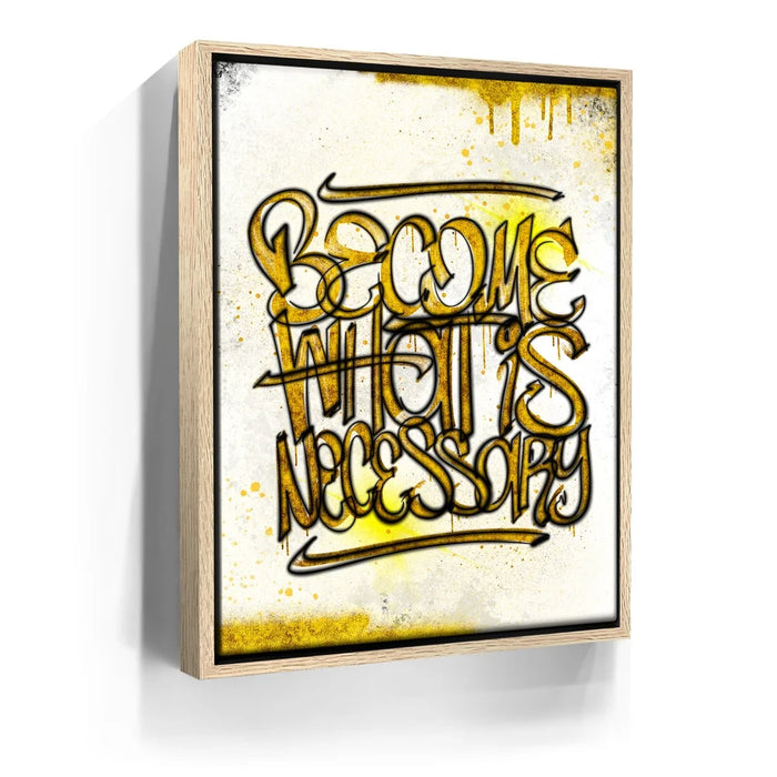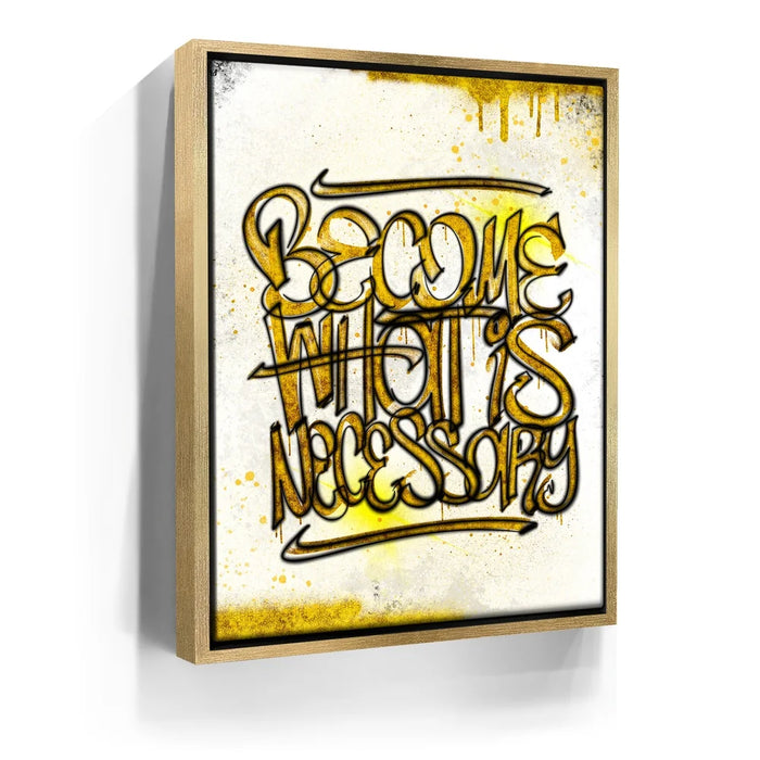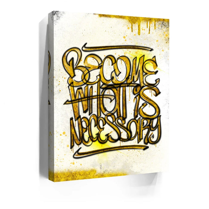 “Become What Is Necessary – Calligraphy Rustic Gold” radiates determination and grit with a golden edge. The words rise from a haze of yellow spray and textured strokes, their looping graffiti script exuding both rebellion and resolve. Each drip and splatter feels intentional—a visual reminder that strength is forged in motion, not perfection.