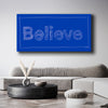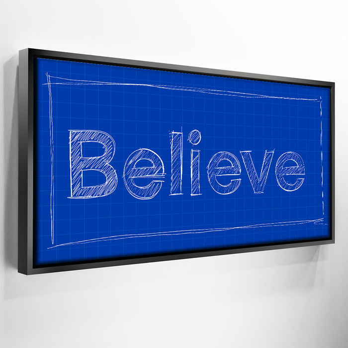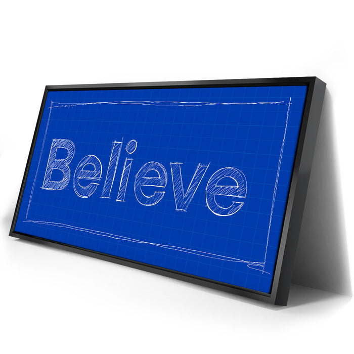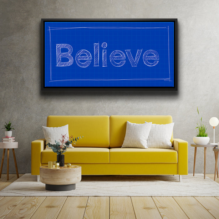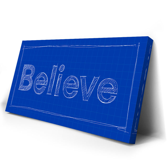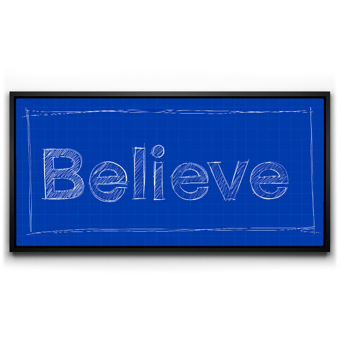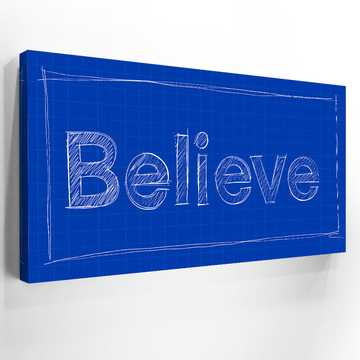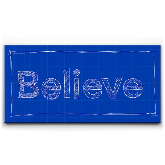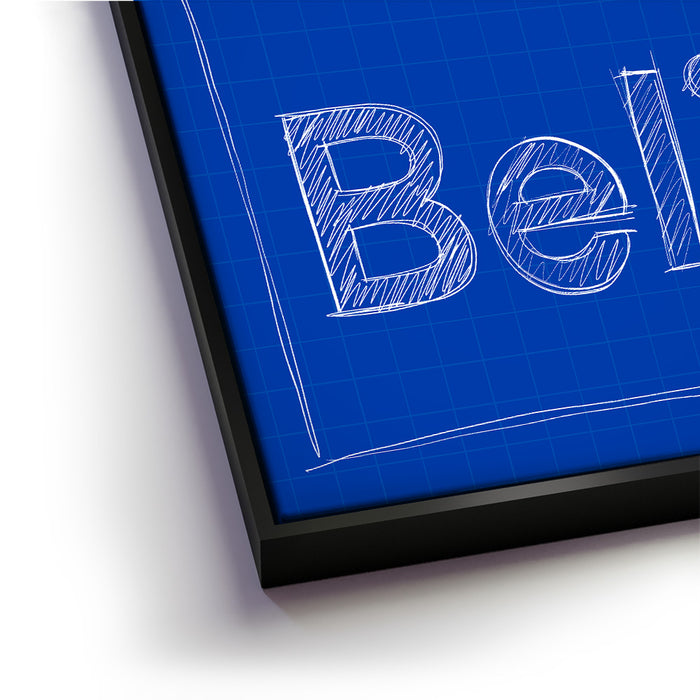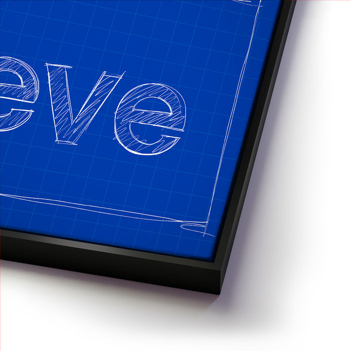 This artwork presents the word "Believe" in a blueprint-style design, giving it a unique and architectural look. The clean, technical lines and grid background evoke a sense of structure and planning, making it an ideal piece for anyone looking to combine creativity with determination. The detailed sketch-like typography encourages belief in oneself and the pursuit of dreams with precision and confidence.