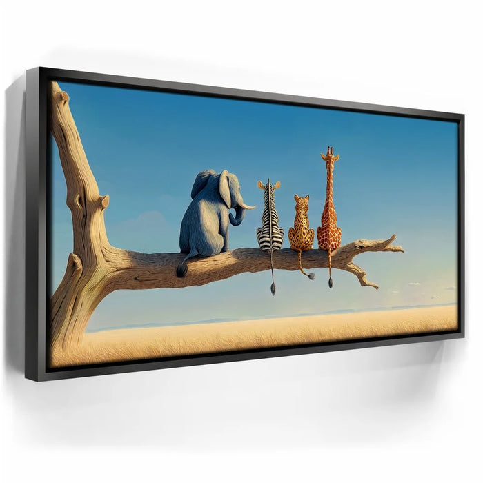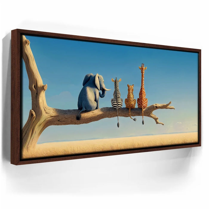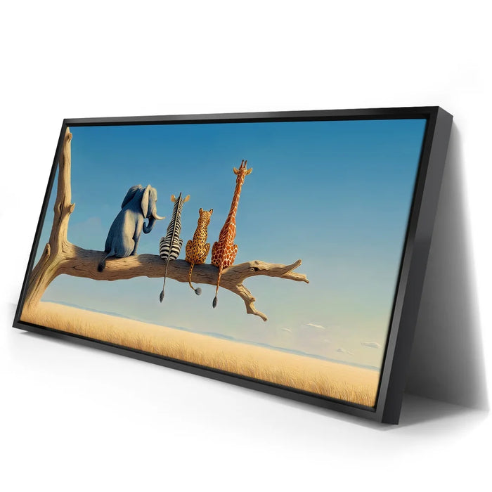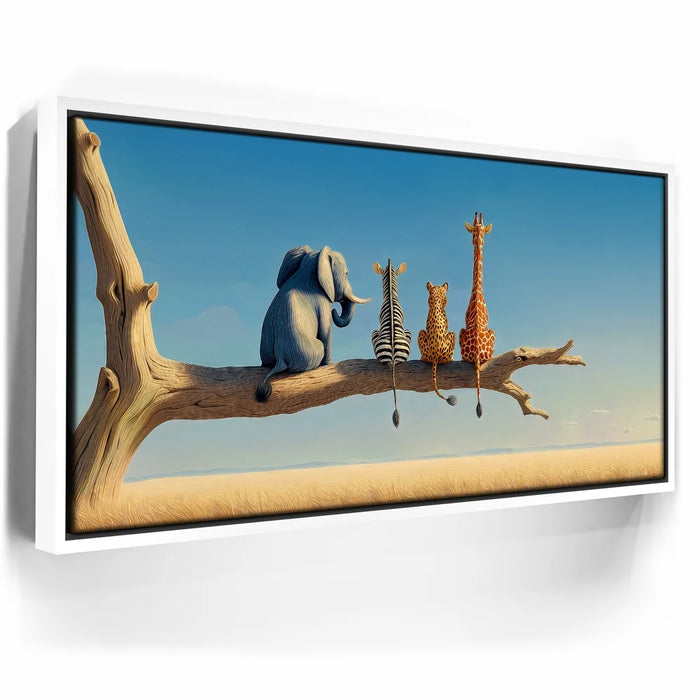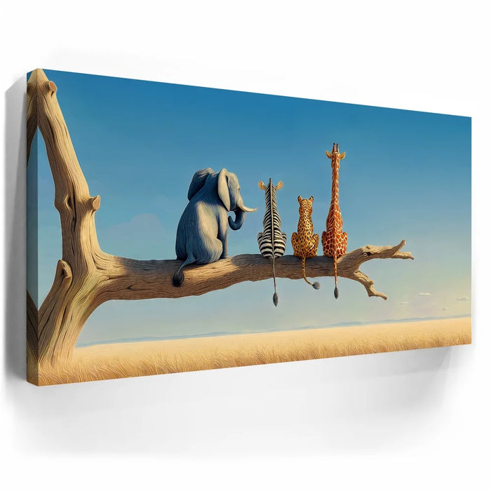 “Between Us & The Acacia” by Kandise King captures the quiet poetry of friendship beneath an endless African sky. Perched side by side on a sun-bleached branch, an elephant, zebra, cheetah, and giraffe share a moment of stillness and solidarity—different in every way, yet bound by the same horizon. The simplicity of the composition draws attention to their silhouettes and the golden expanse beyond, evoking peace, humor, and the unspoken bond of belonging.
