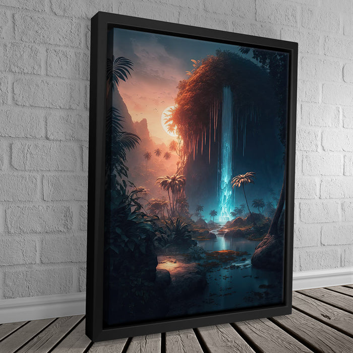 "Bioluminescent Paradise" by MidJourney.Man transports viewers into an enchanting, otherworldly jungle where a glowing waterfall cascades from a towering cliff. The vivid contrast between the warm sunset hues and the cool blue bioluminescence creates a magical and serene atmosphere. Surrounded by lush vegetation and tall palm trees, the scene is a perfect blend of natural beauty and mystical fantasy.